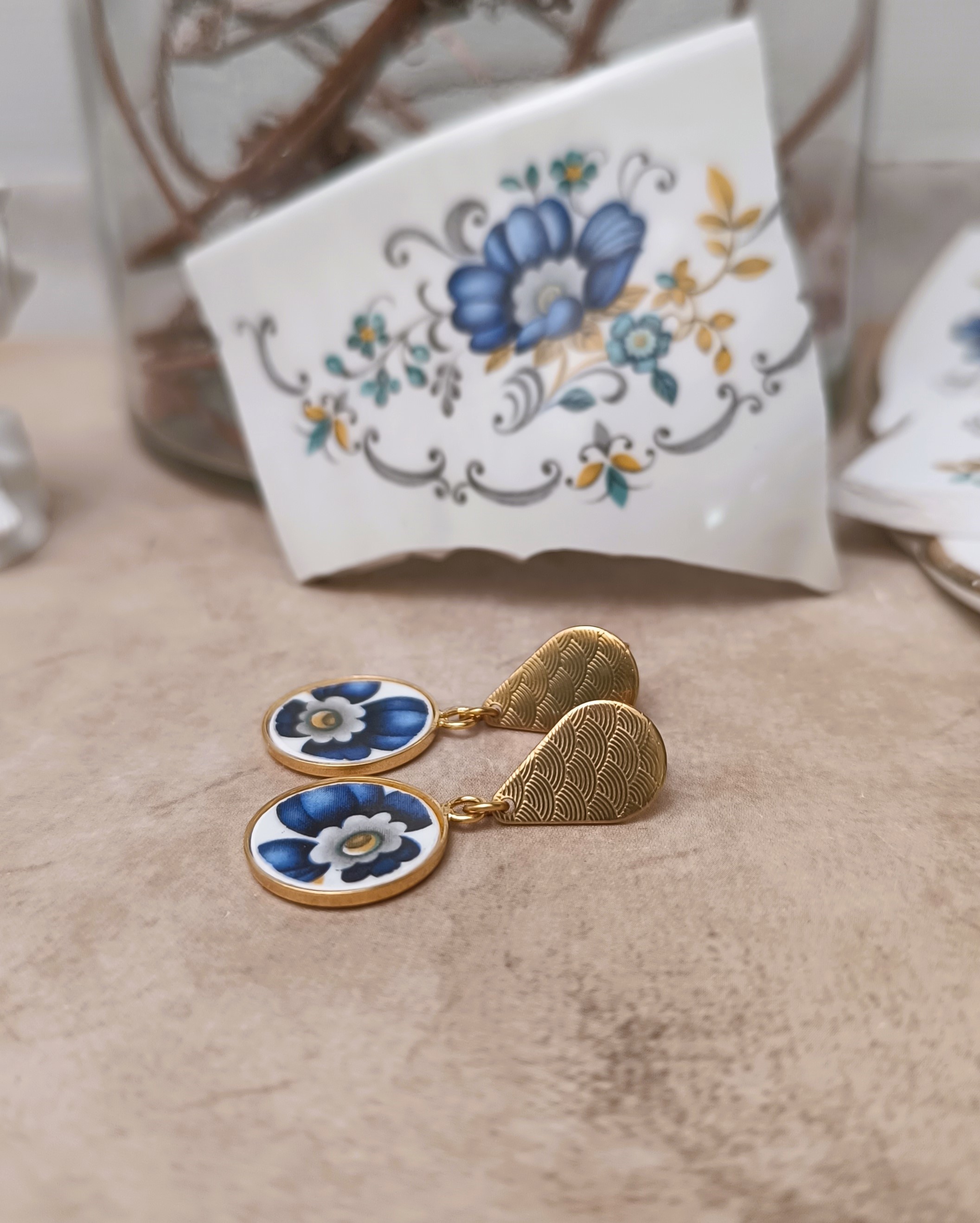 Ces boucles d’oreilles “Saphir” sont nées de la transformation d’un couvercle de soupière ancien, issu d’une ressourcerie.