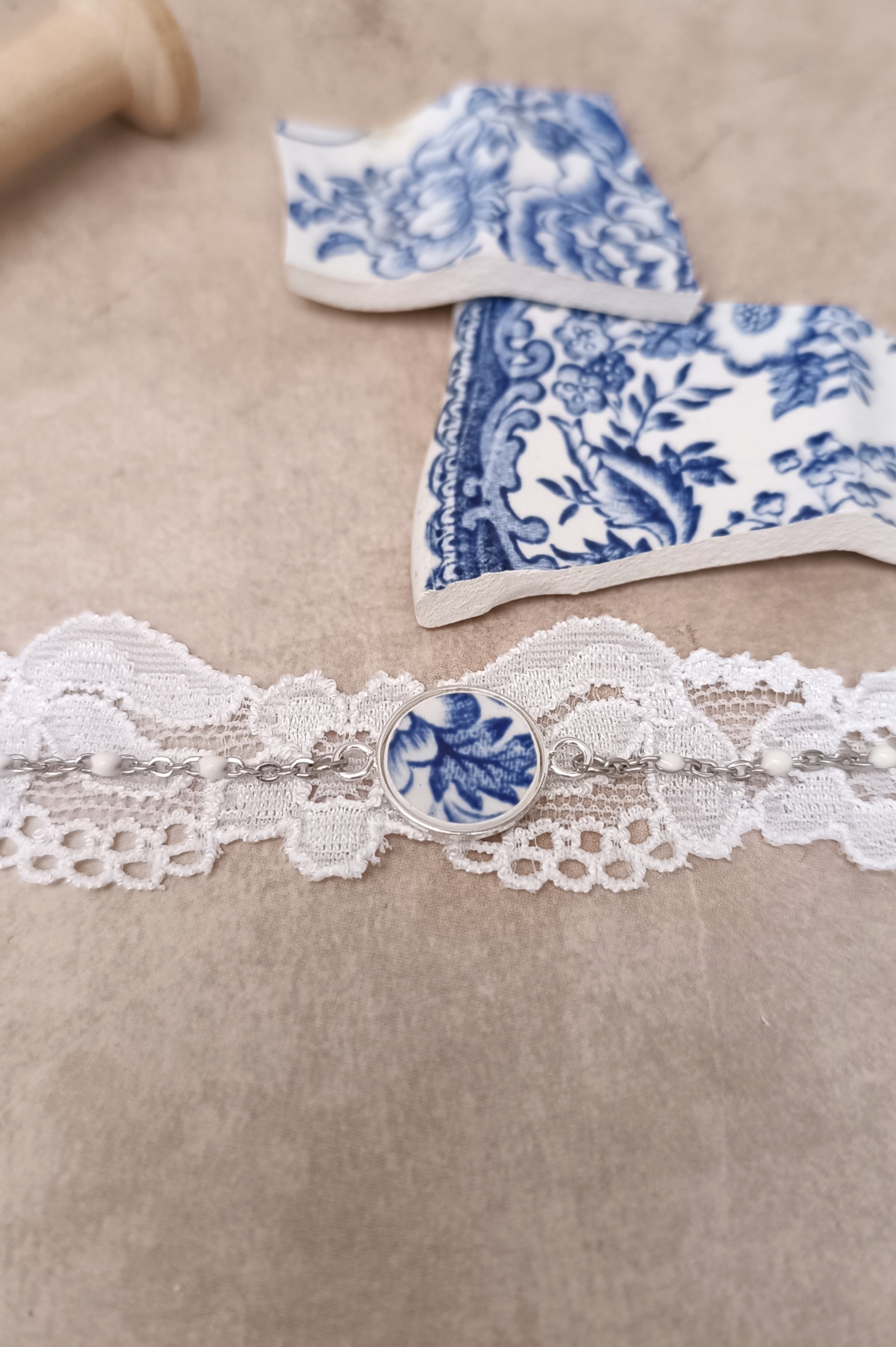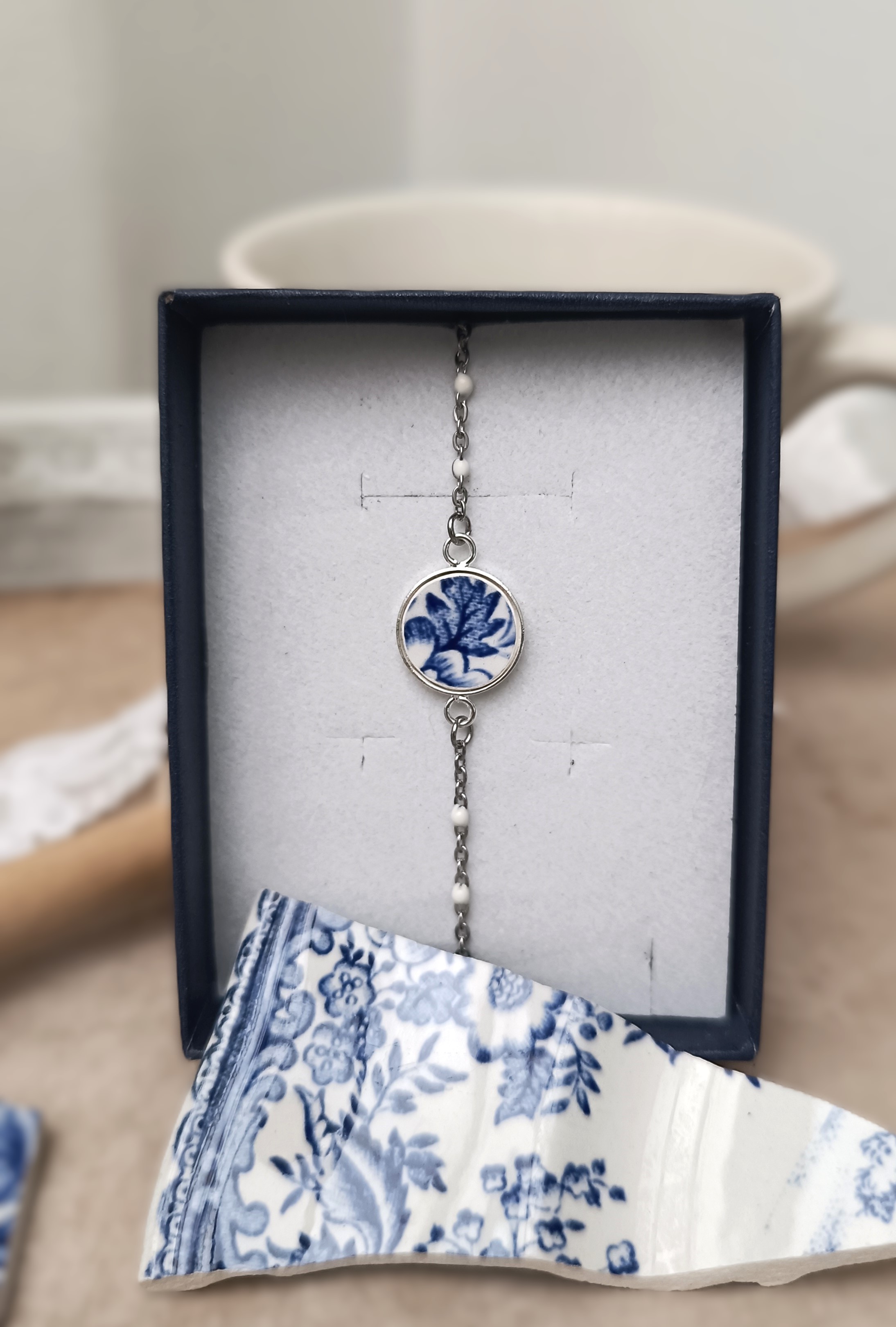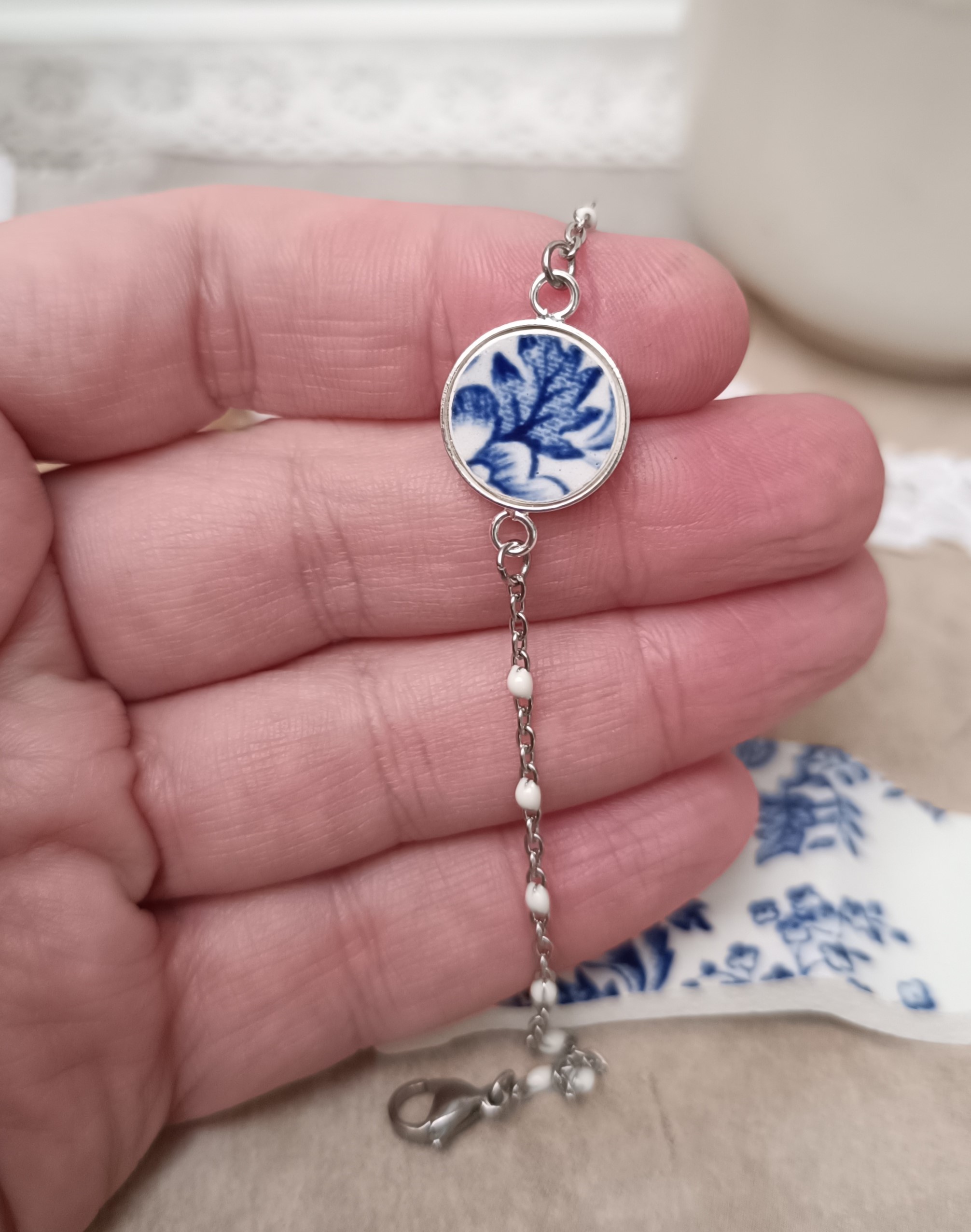 Ce bracelet Bleu Vintage est né de la transformation d’une assiette anglaise ancienne Wood & Sons – modèle Woodland, une pièce emblématique de la vaisselle britannique du début du XXᵉ siècle.
