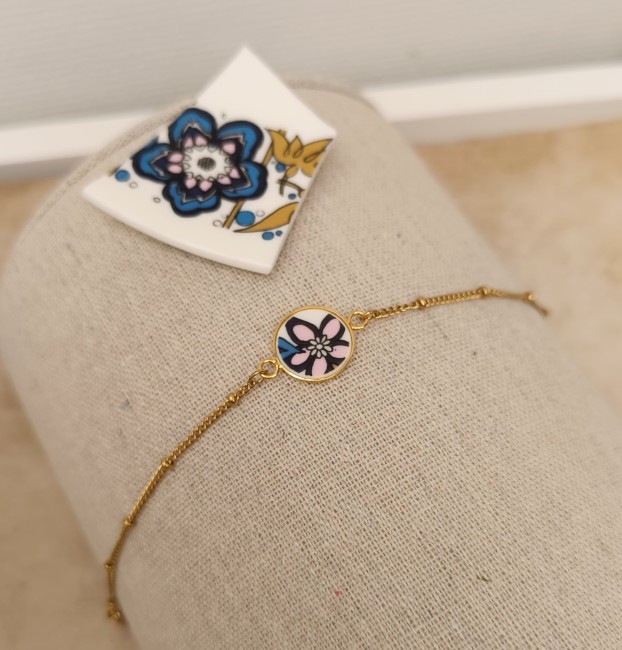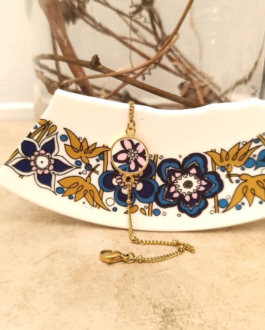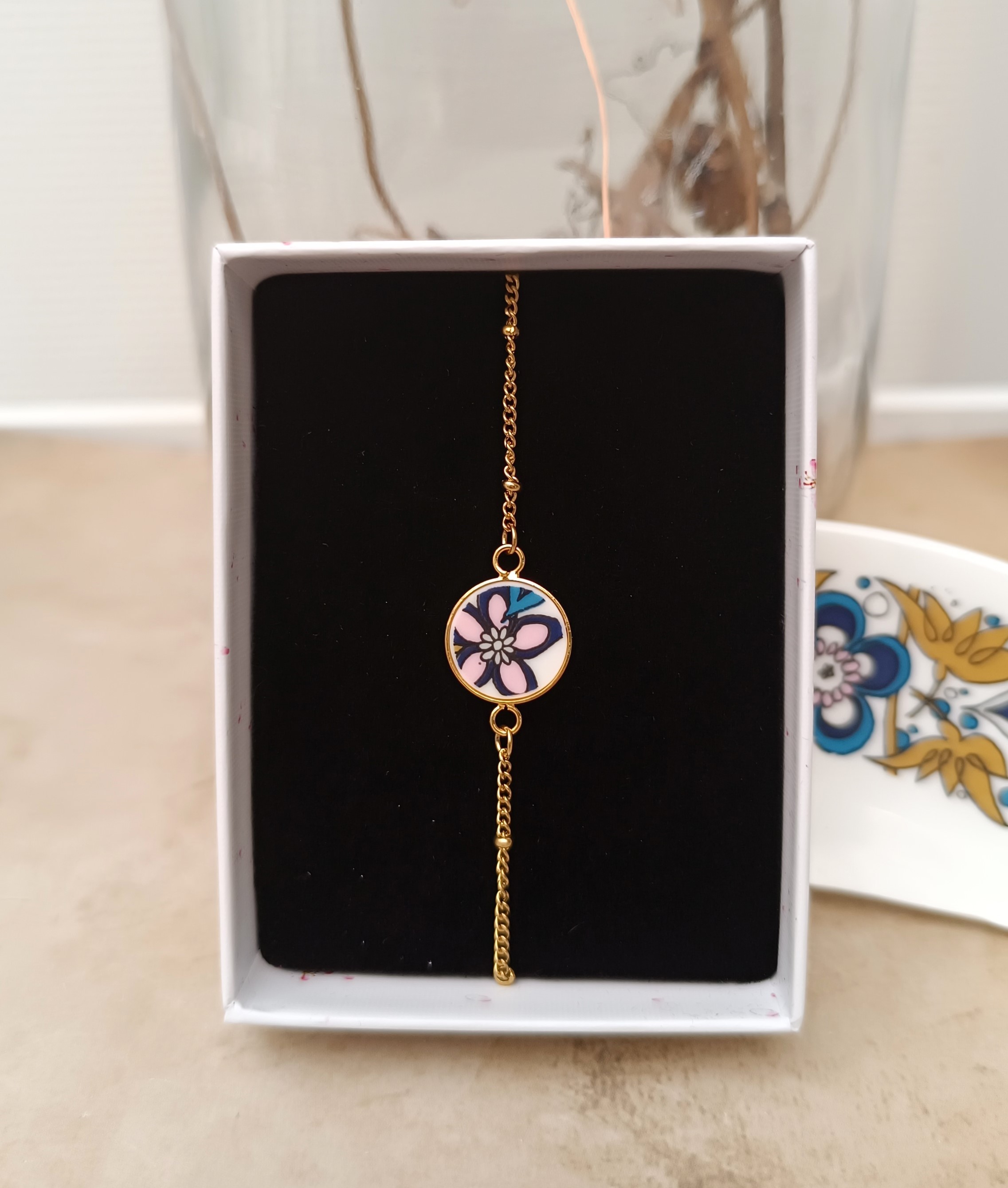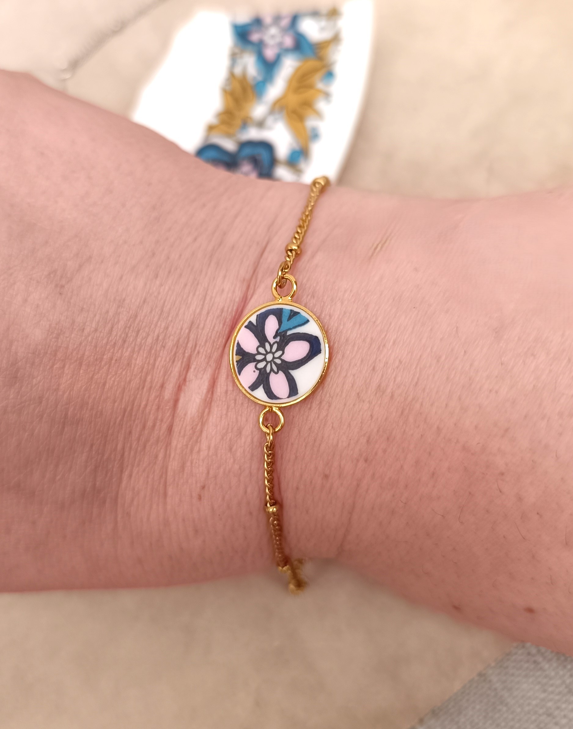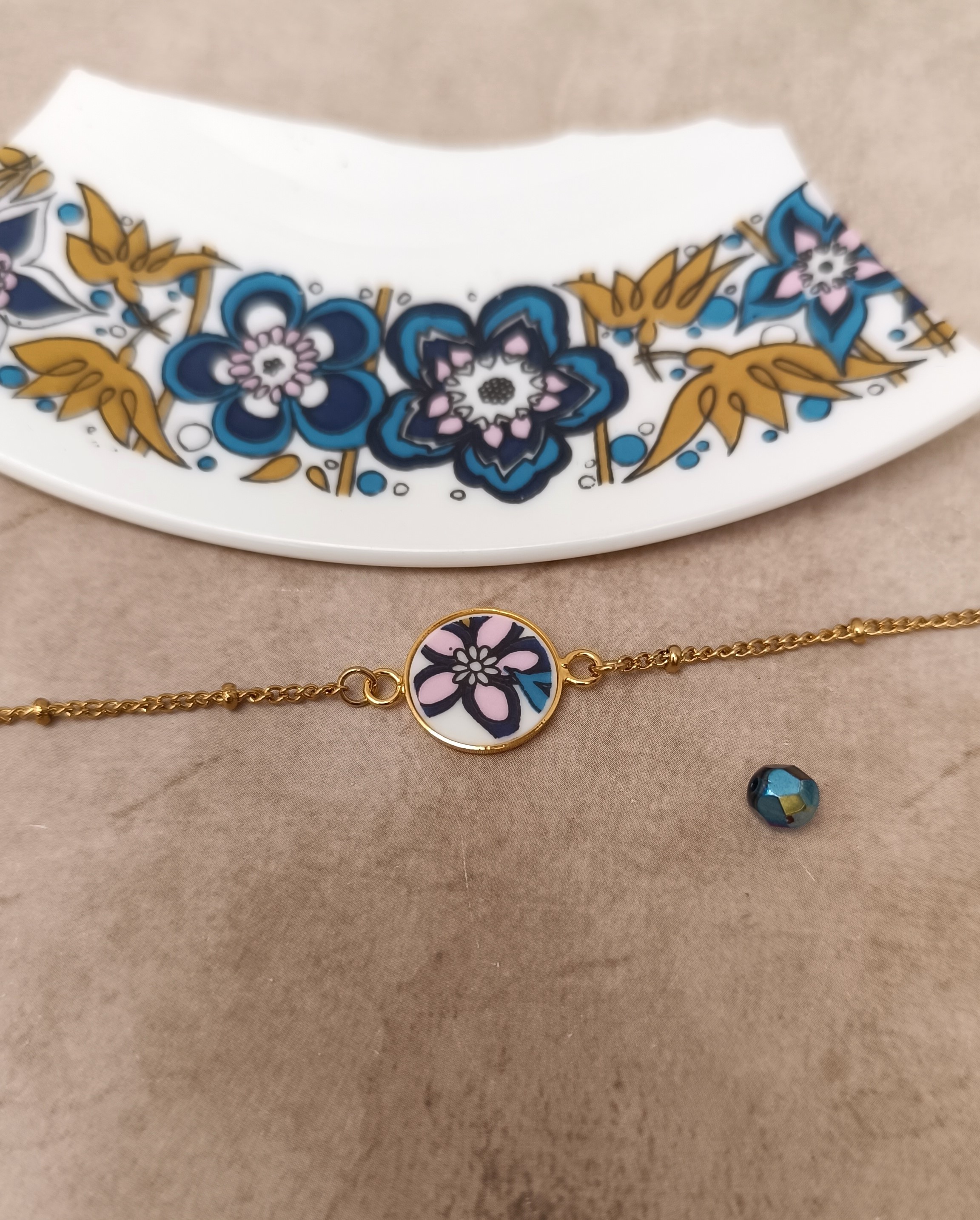 Ce bracelet a été façonné à partir d’une assiette modèle Nocturne de la maison Royal Tuscan.