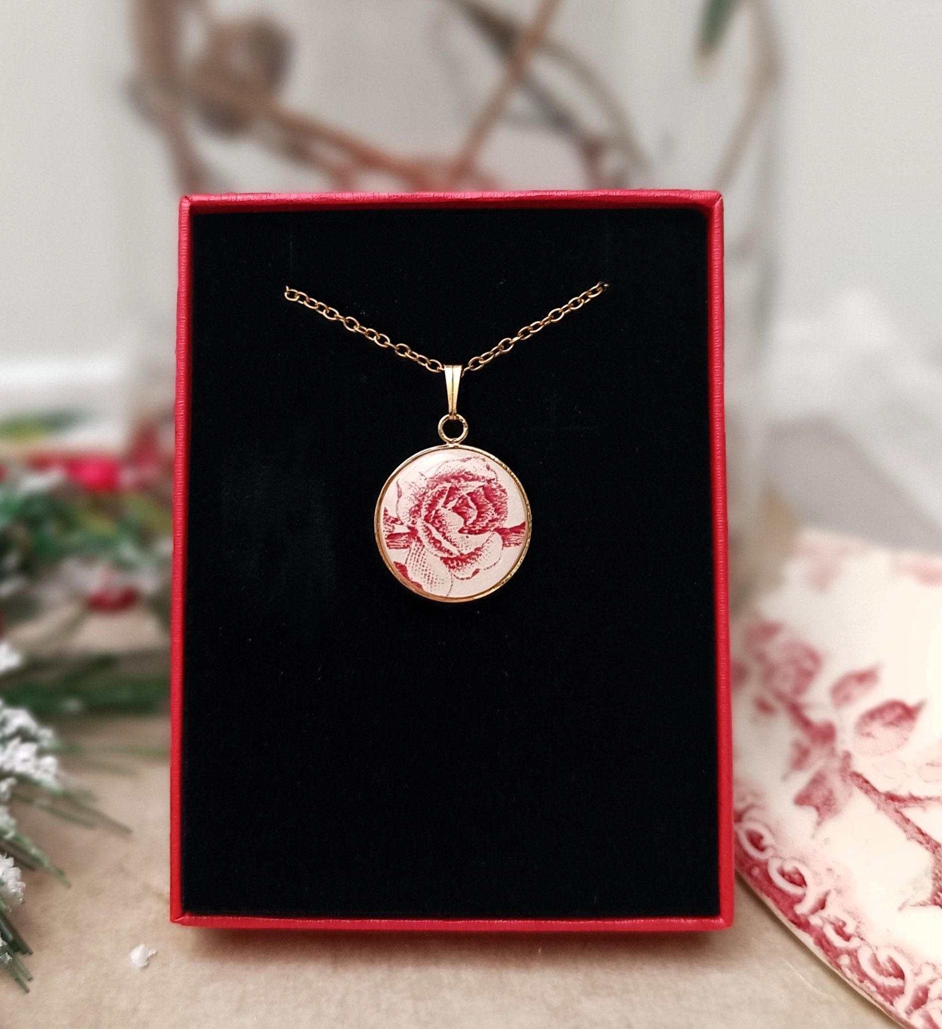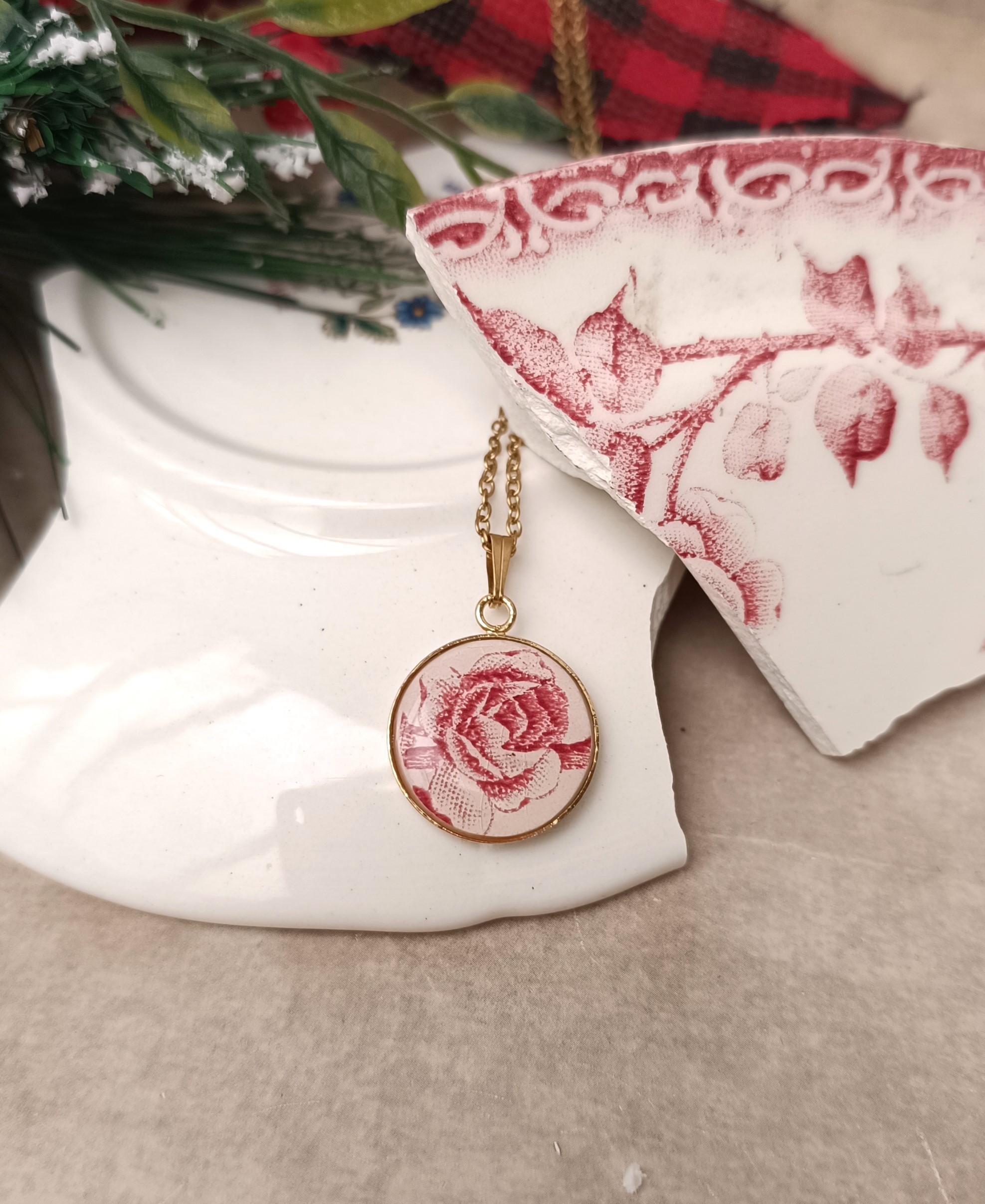 Romantika - Collier au pendentif plaqué or en faïence ancienne – Création artisanale française