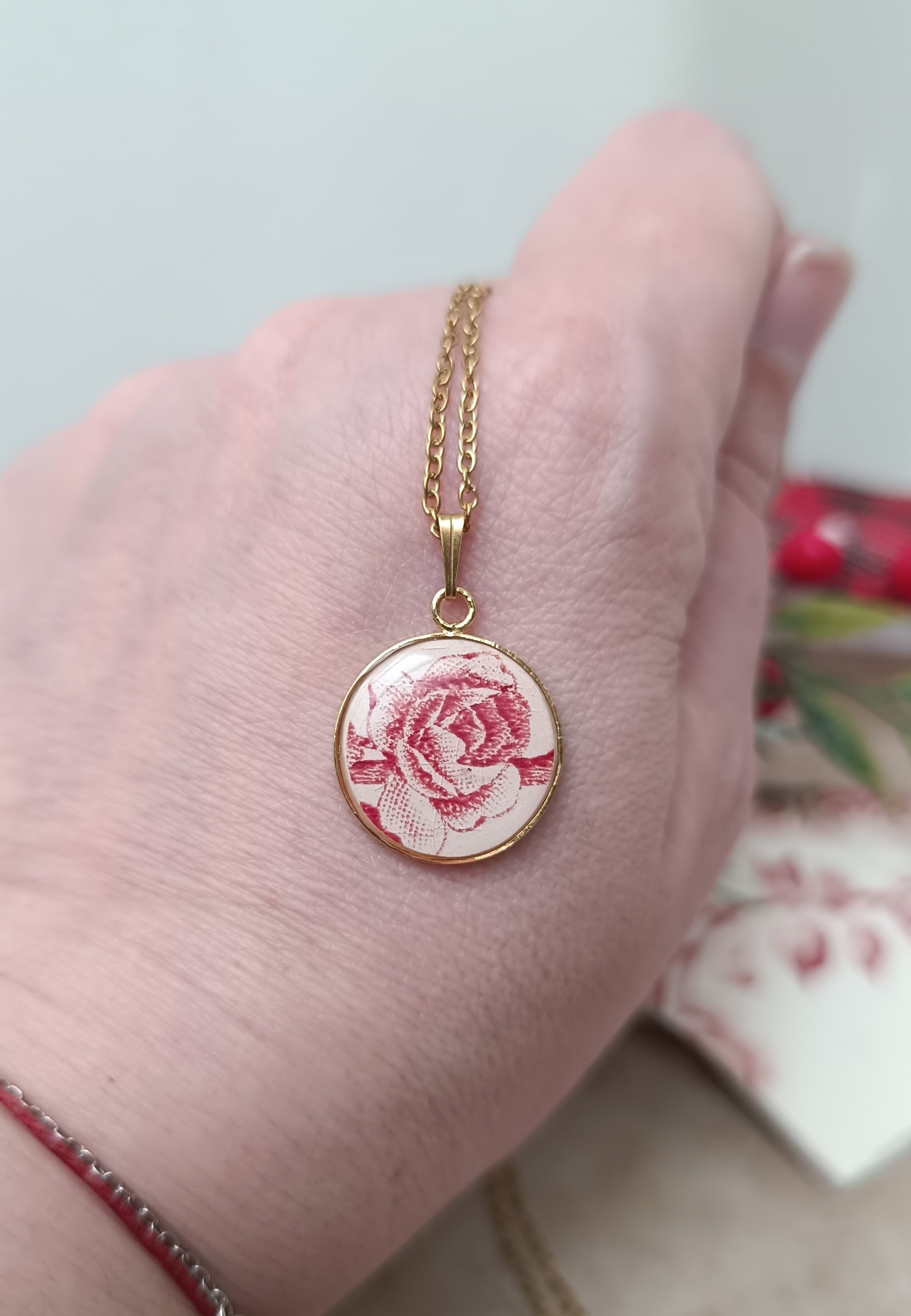 Chaque bijou est façonné à la main dans mon atelier à Calais à partir de vaisselle ancienne destinée à disparaître. Les marques du temps – éclats, patine, fêlures – se transforment en une signature, faisant de chaque pendentif une pièce unique, disponible en un seul exemplaire.