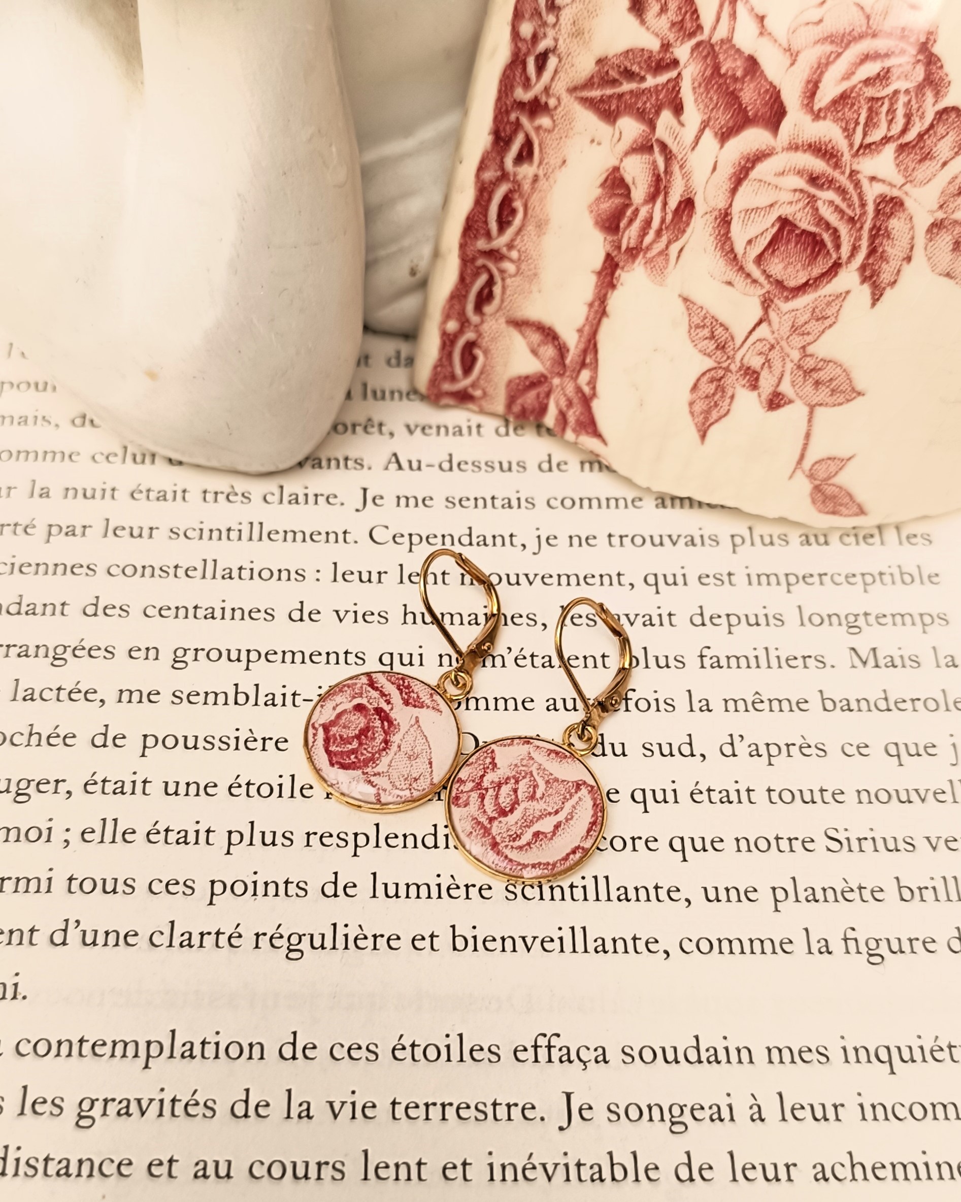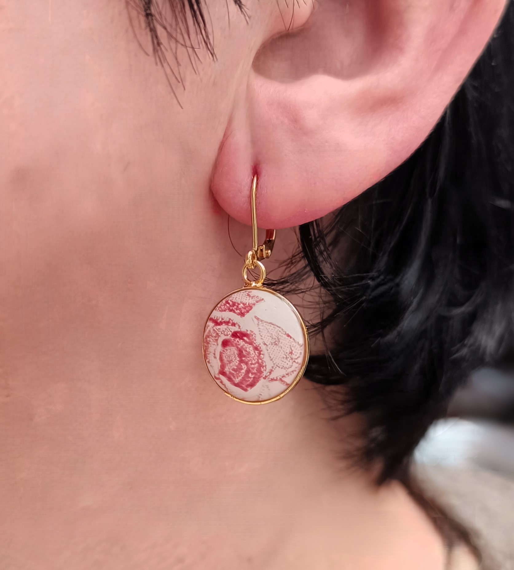 Ces boucles Romantika sont nées de la métamorphose d'un morceau de couvercle d'une soupière en faïence que j'ai reçue cassée. Leur délicate teinte crème et leurs motifs fleuris romantiques rappellent l’élégance des tables d’autrefois.