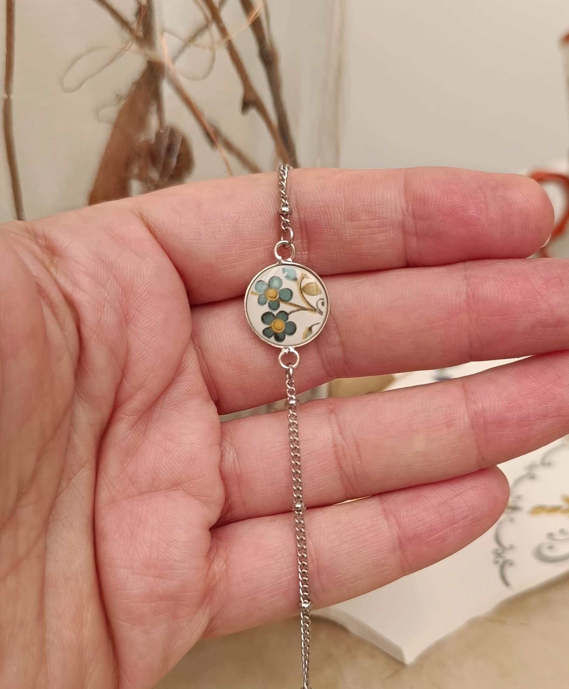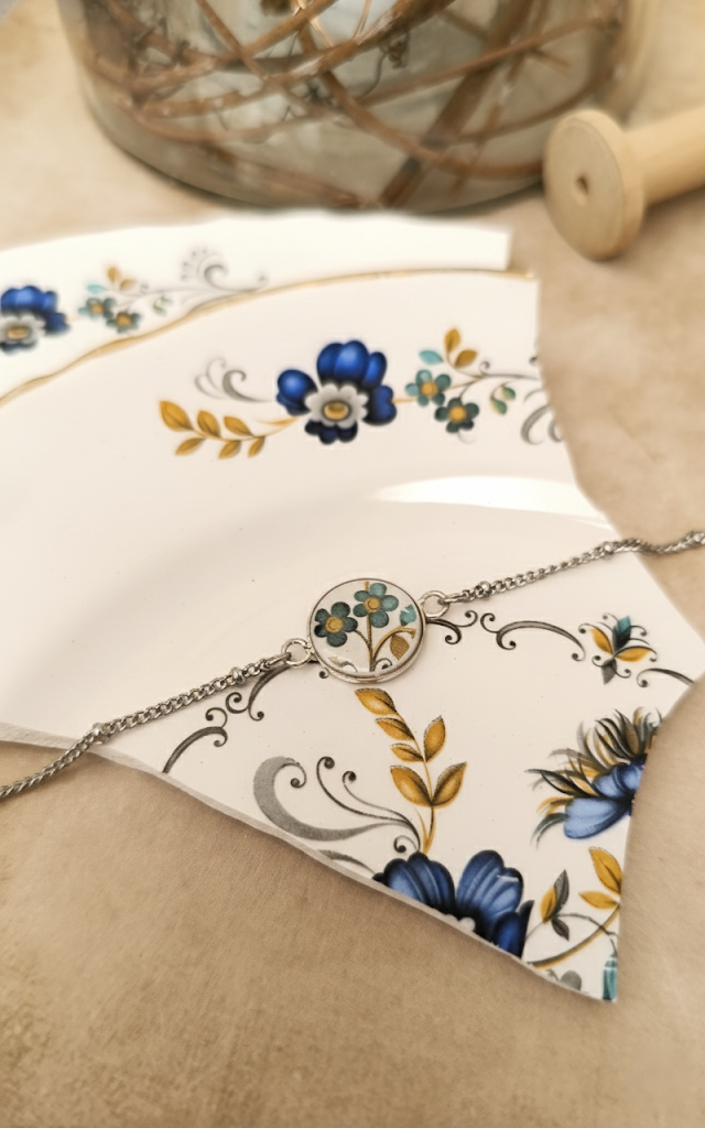 Ce bracelet artisanal est fabriqué à la main dans mon atelier à Calais à partir d’un fragment d’assiette en faïence ancienne Moulin des Loups, modèle Chaillot. Son magnifique motif fleuri bleu turquoise fait de chaque pièce un bijou unique, mêlant histoire, savoir-faire traditionnel et modernité.