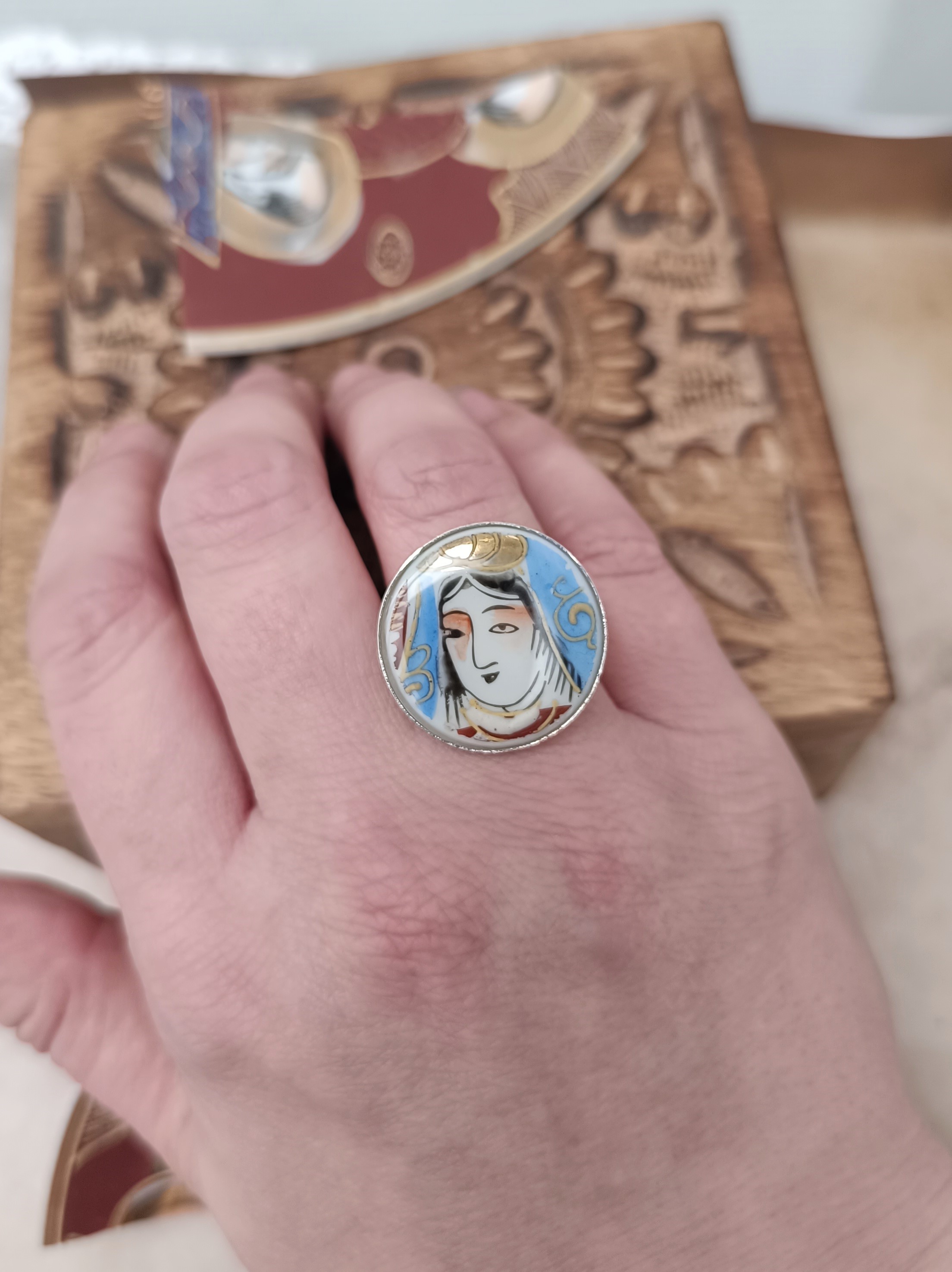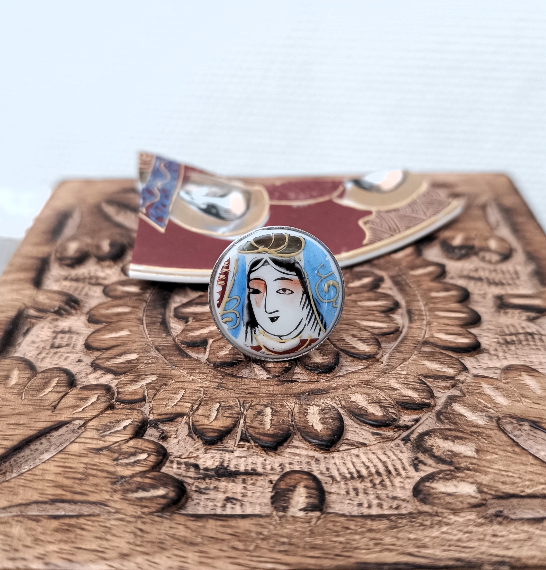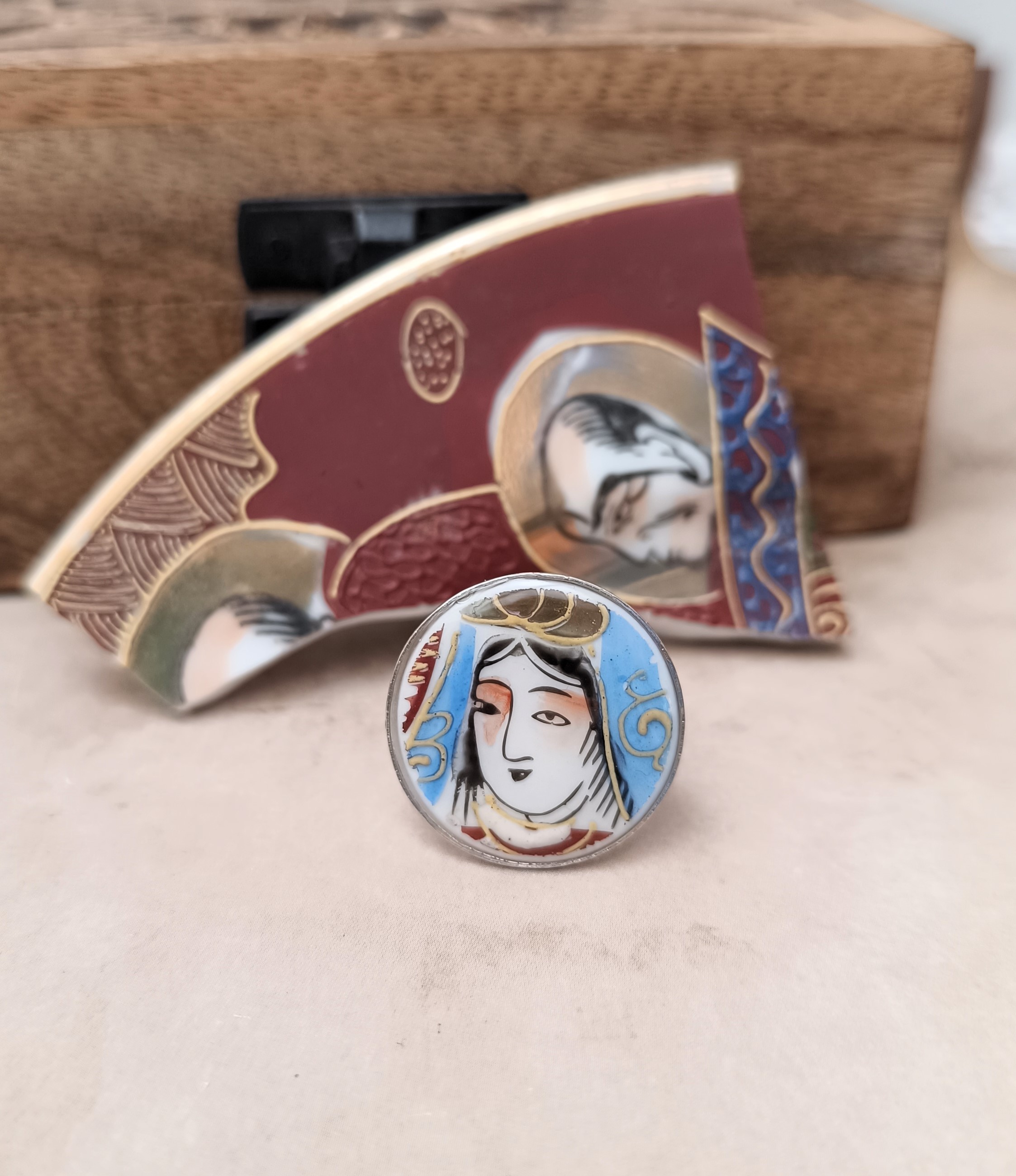 Cette bague unique est née d’un morceau de sous-tasse en porcelaine japonaise Satsuma, sauvé d’un service ancien abîmé par le temps. Sculpté, façonné et protégé par une fine couche de résine, il révèle toute la délicatesse d’un motif traditionnel représentant un personnage japonais.