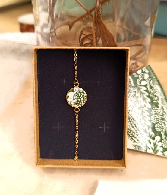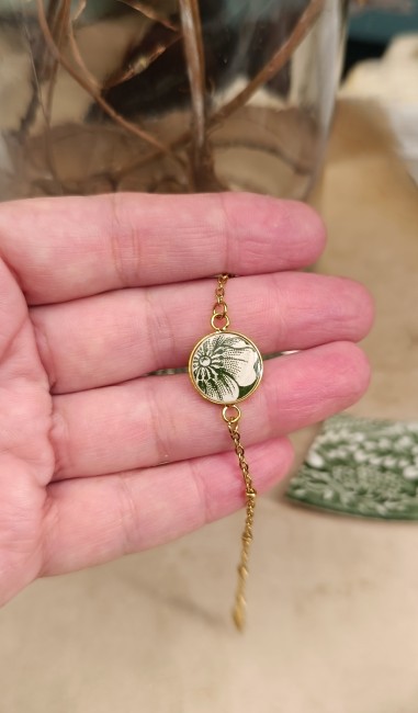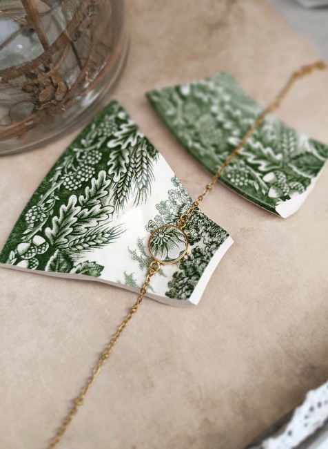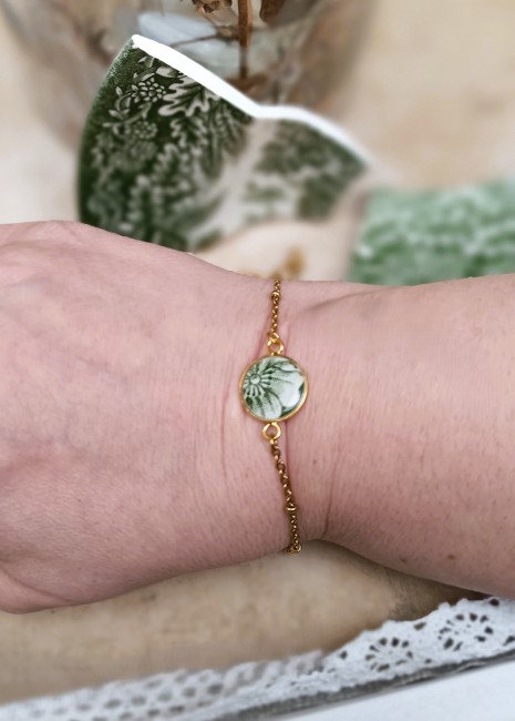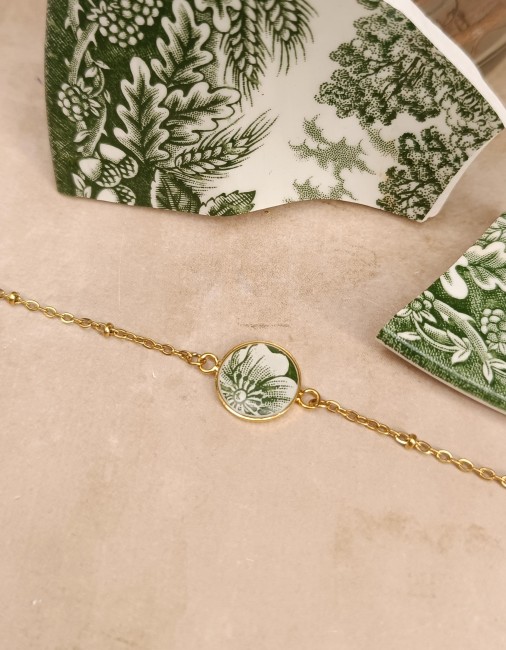 Ce bracelet est né d’une assiette en porcelaine anglaise reçue brisée mais j'ai vu toute la beauté d’un motif vert sauge évoquant la nature, la douceur et la poésie. J'ai voulu lui offrir une nouvelle vie.