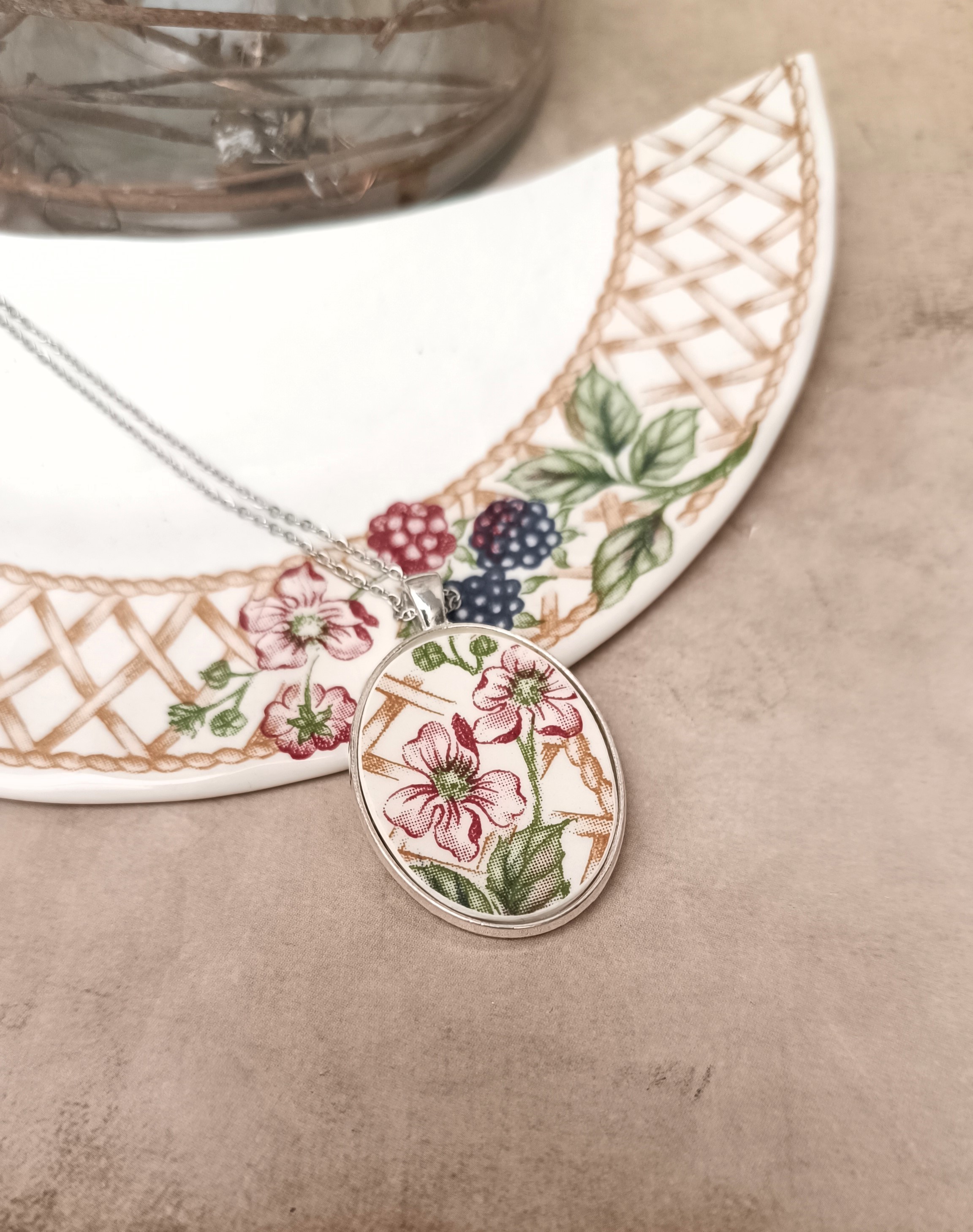 Chaque collier est une pièce unique, façonnée à la main à partir de vaisselle ancienne soigneusement chinée, pour créer un bijou durable, porteur de mémoire.