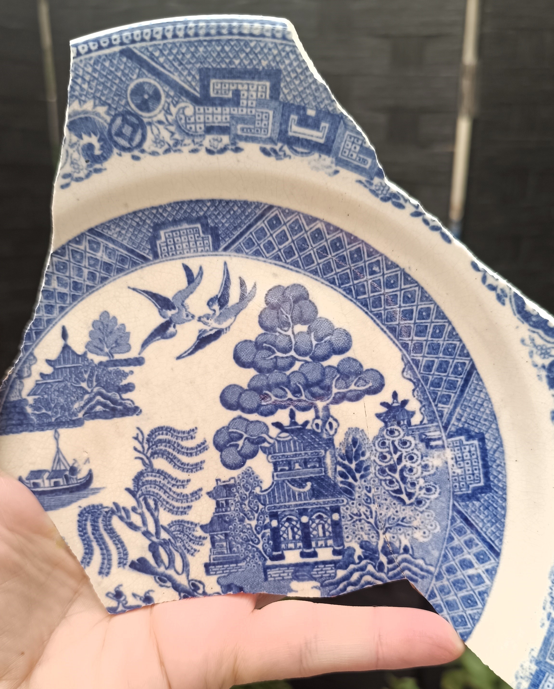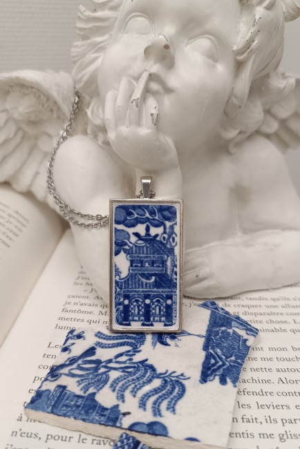 Et si je vous disais que ce pendentif a vécu sa première vie sur une assiette anglaise du célèbre décor Old Blue Willow ?