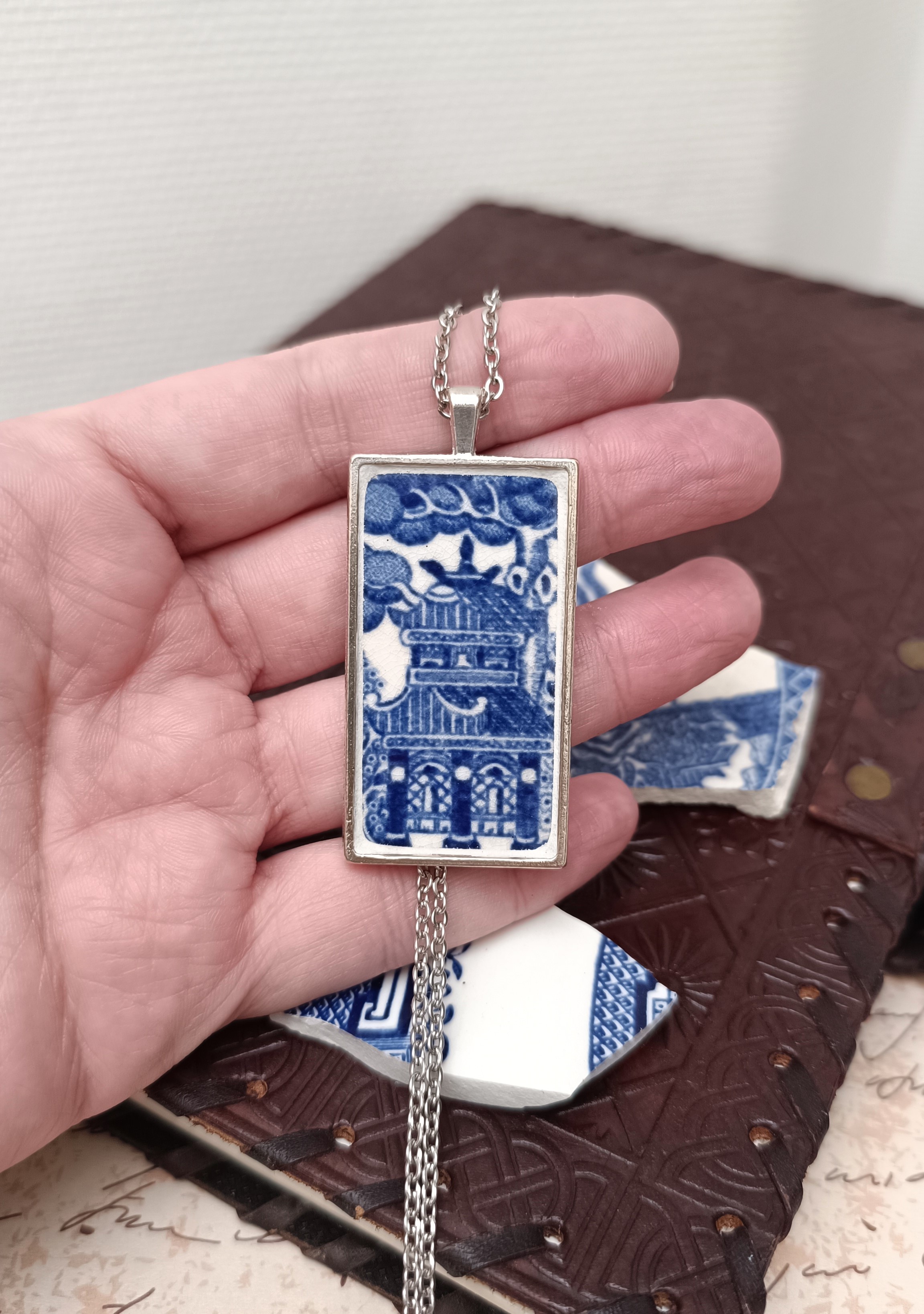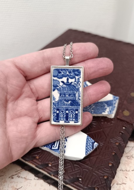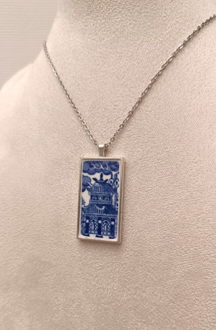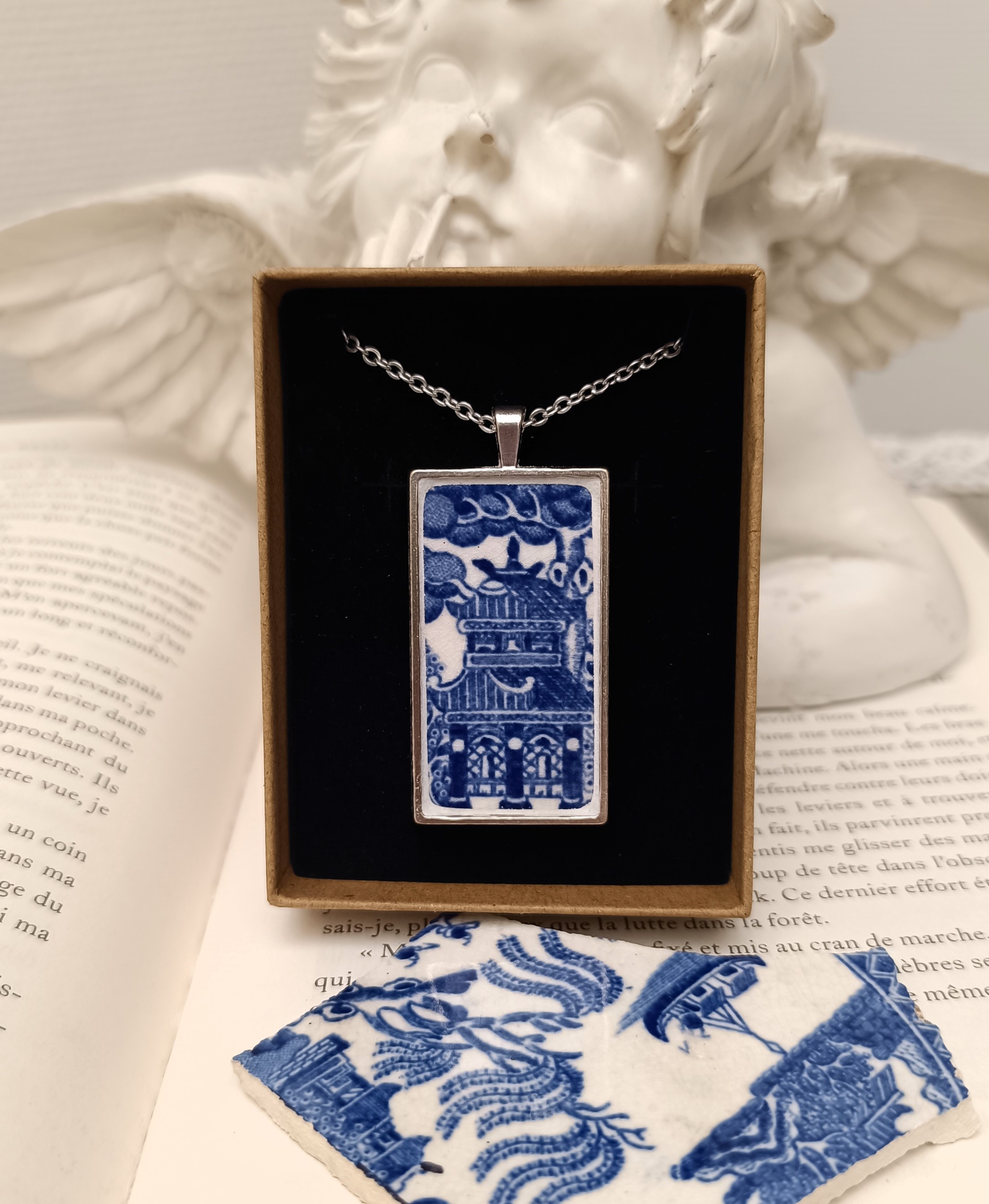COLLIER OLD BLUE WILLOW – Pendentif rectangulaire grand format – Création artisanale française