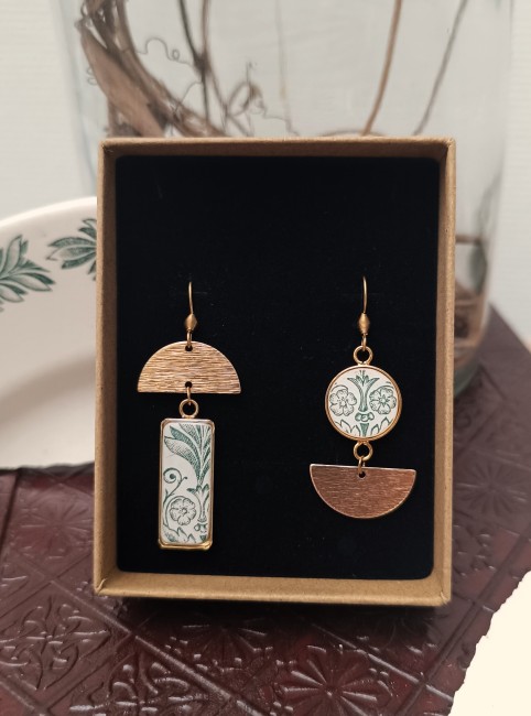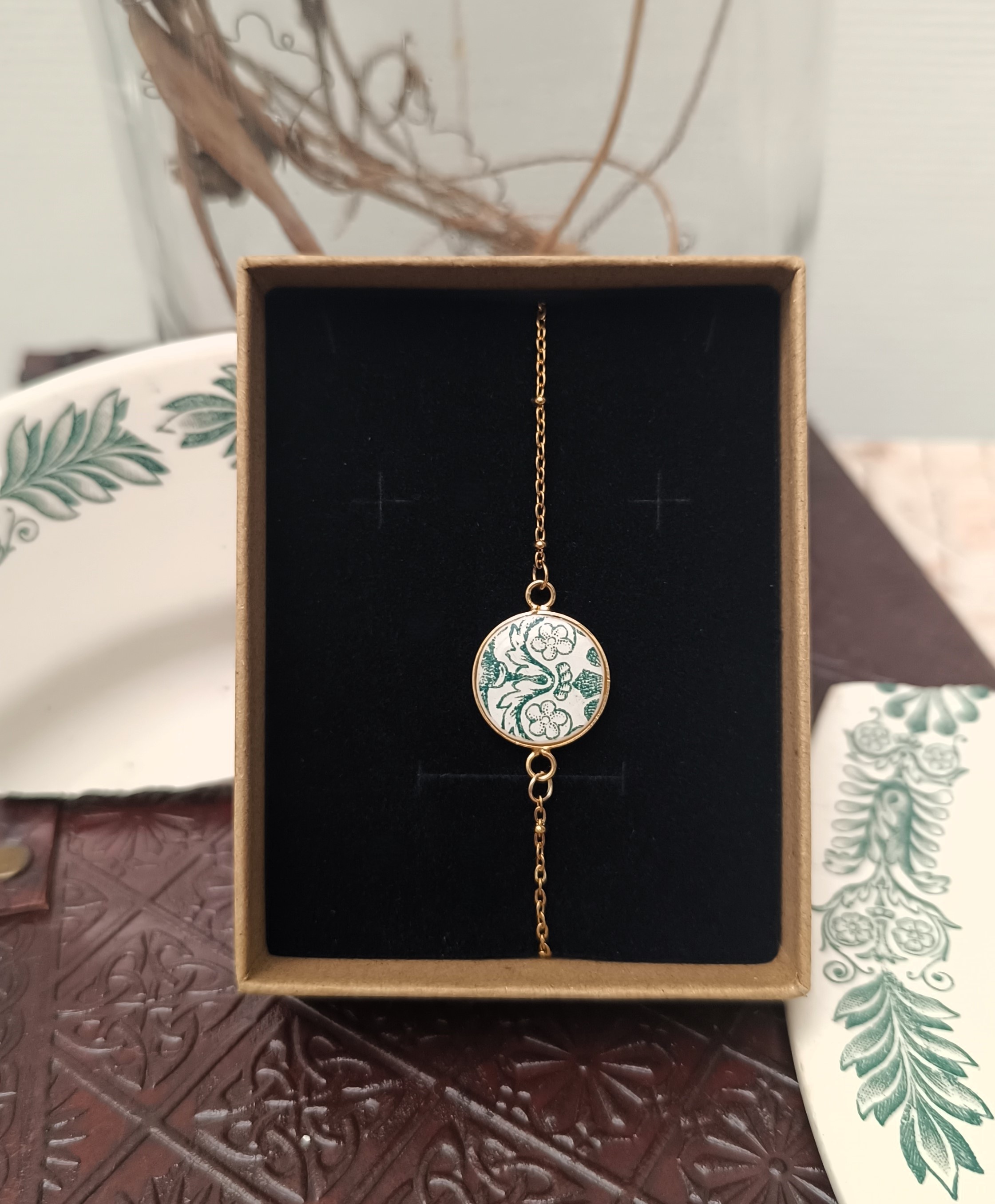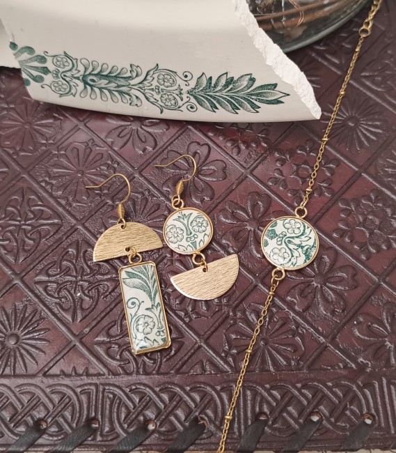 Une jolie faïence crème ornée de petites fleurs vertes, précieusement conservée par ma cliente et qui vient de sa grand mère, transformée aujourd’hui en parure unique.