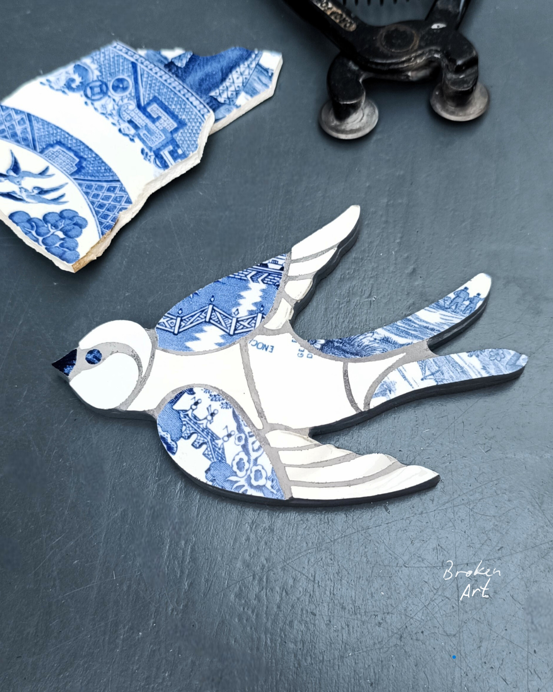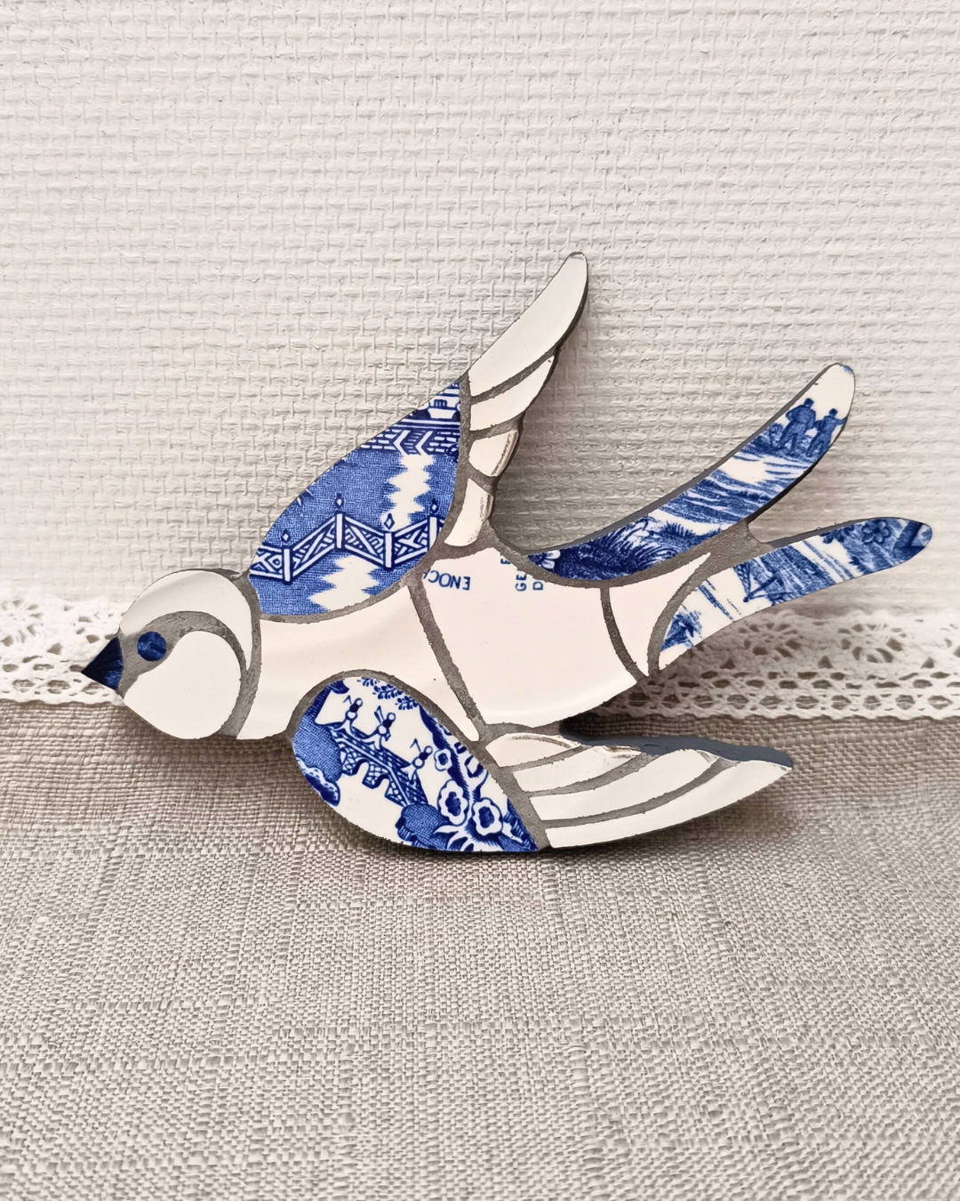 Cette hirondelle, façonnée à la main à partir de véritables morceaux de vaisselle ancienne Blue Willow et Moulin des Loups, capture le souffle du printemps et la beauté du réemploi.