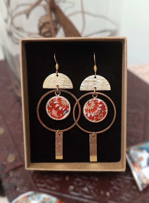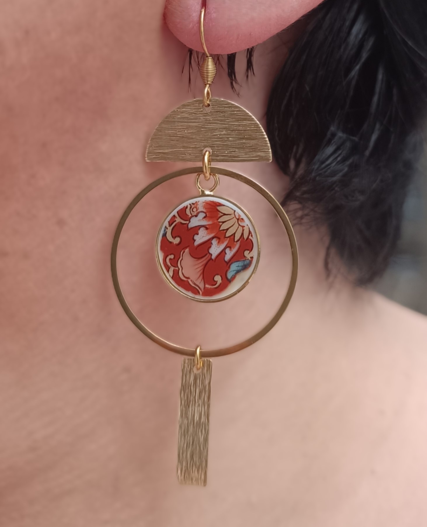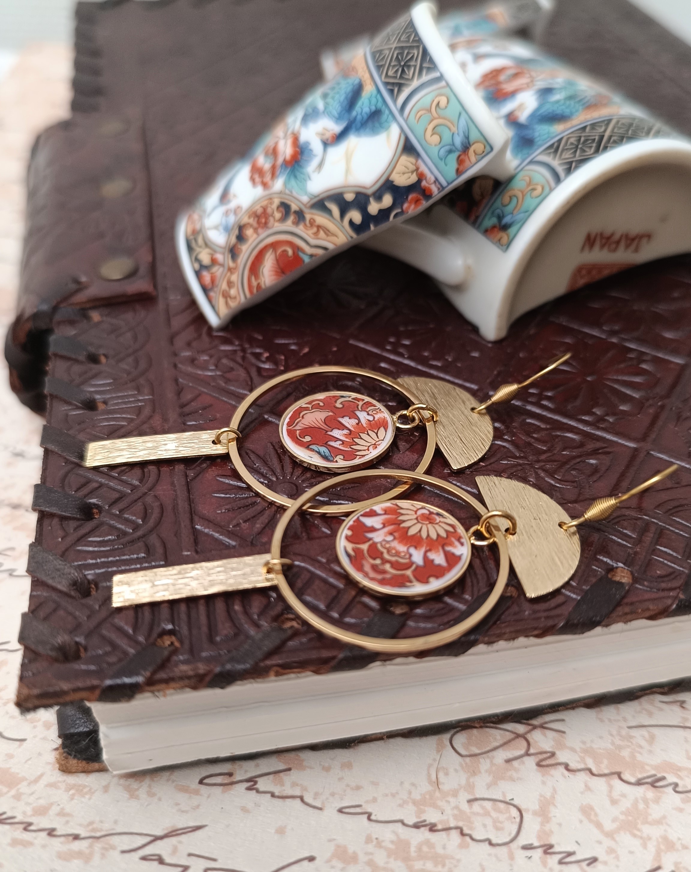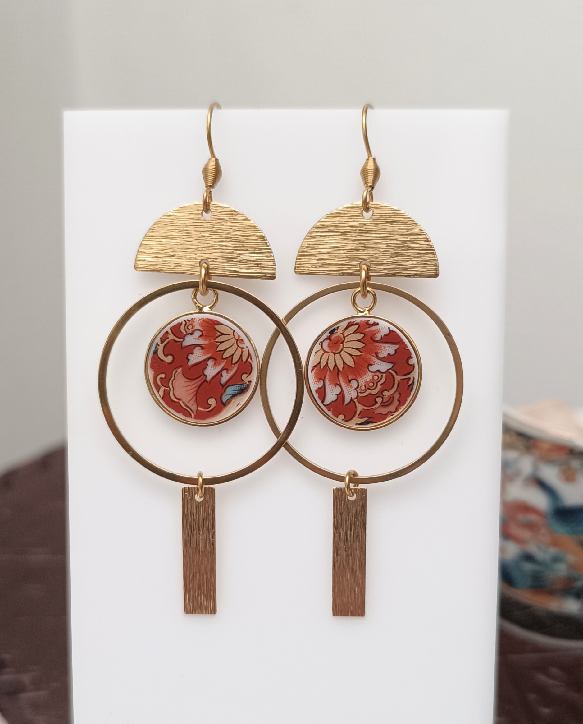 IMARI – Boucles d’oreilles asymétriques longues en porcelaine japonaise ancienne – Création artisanale française