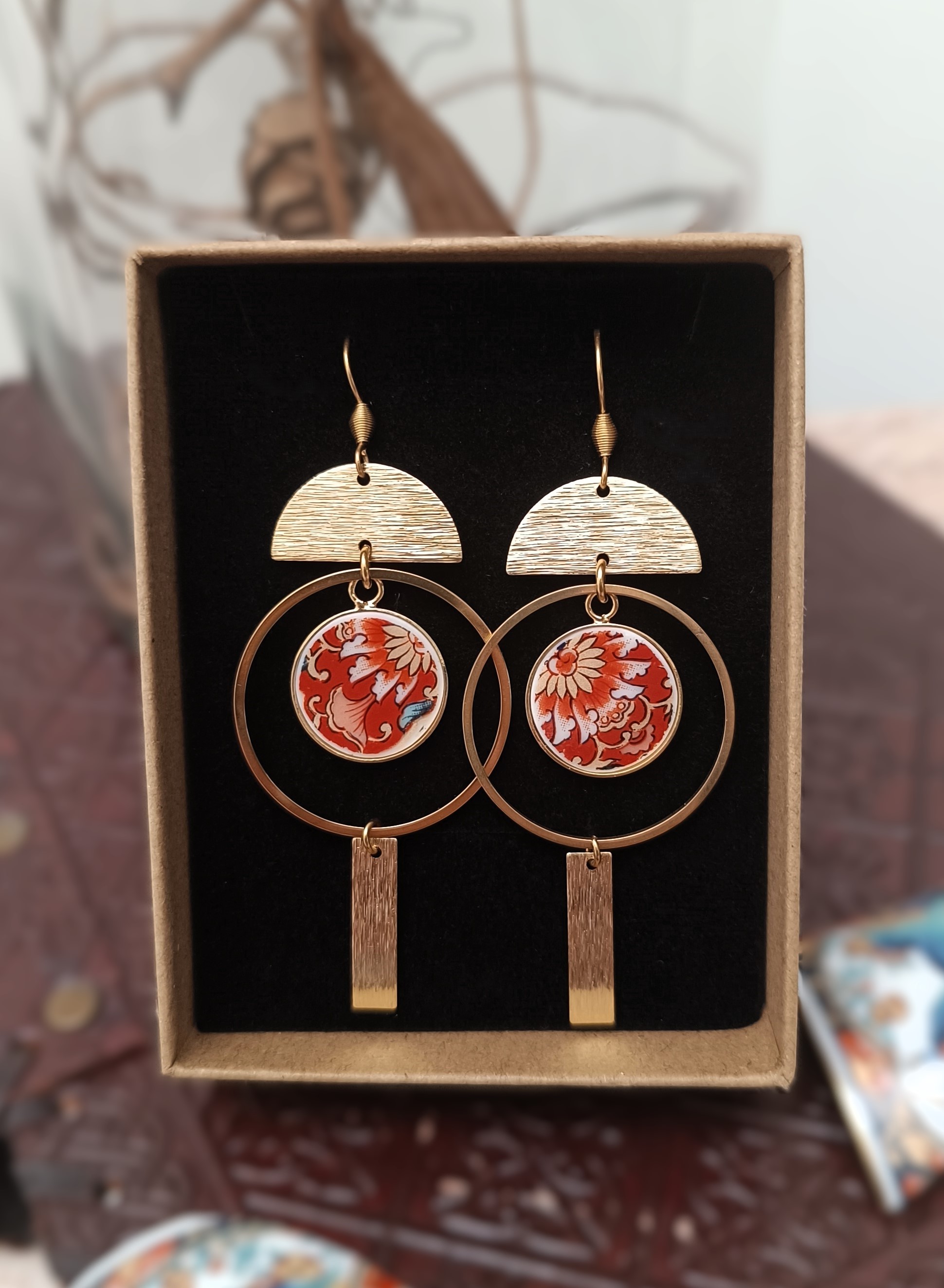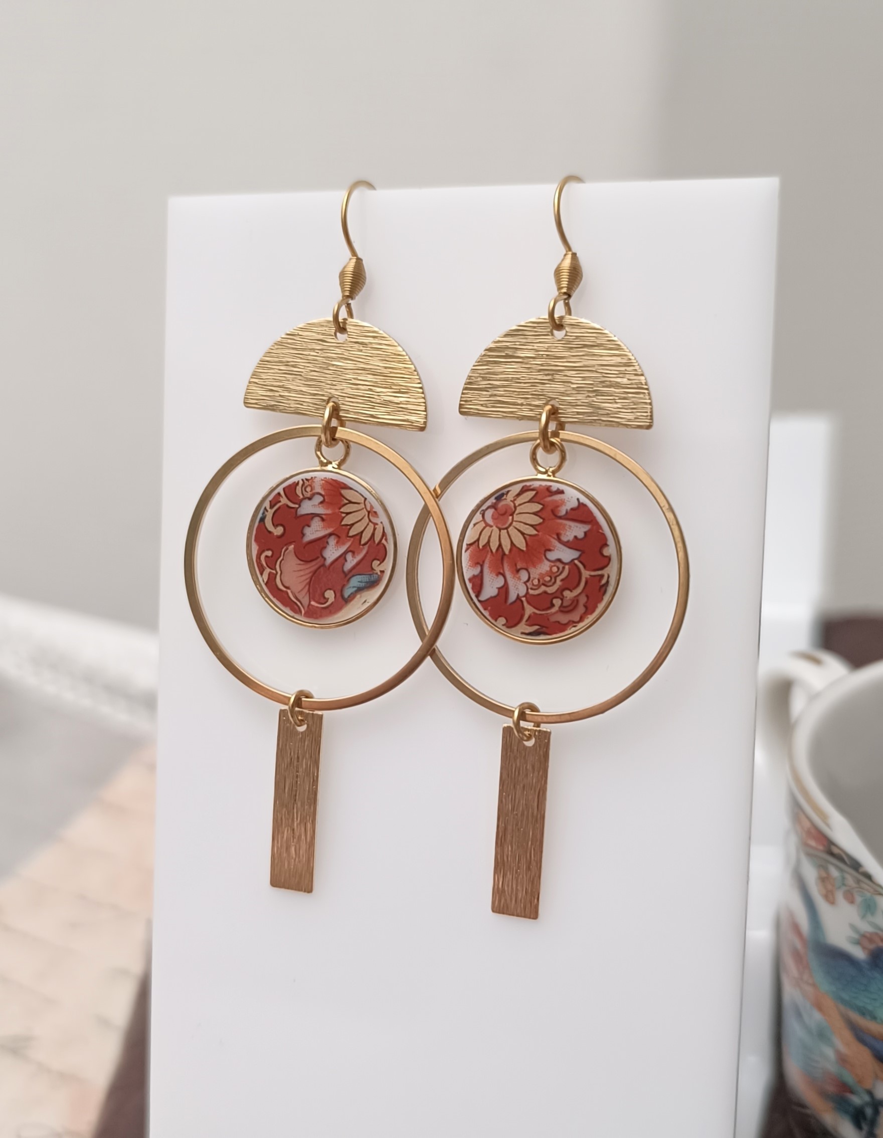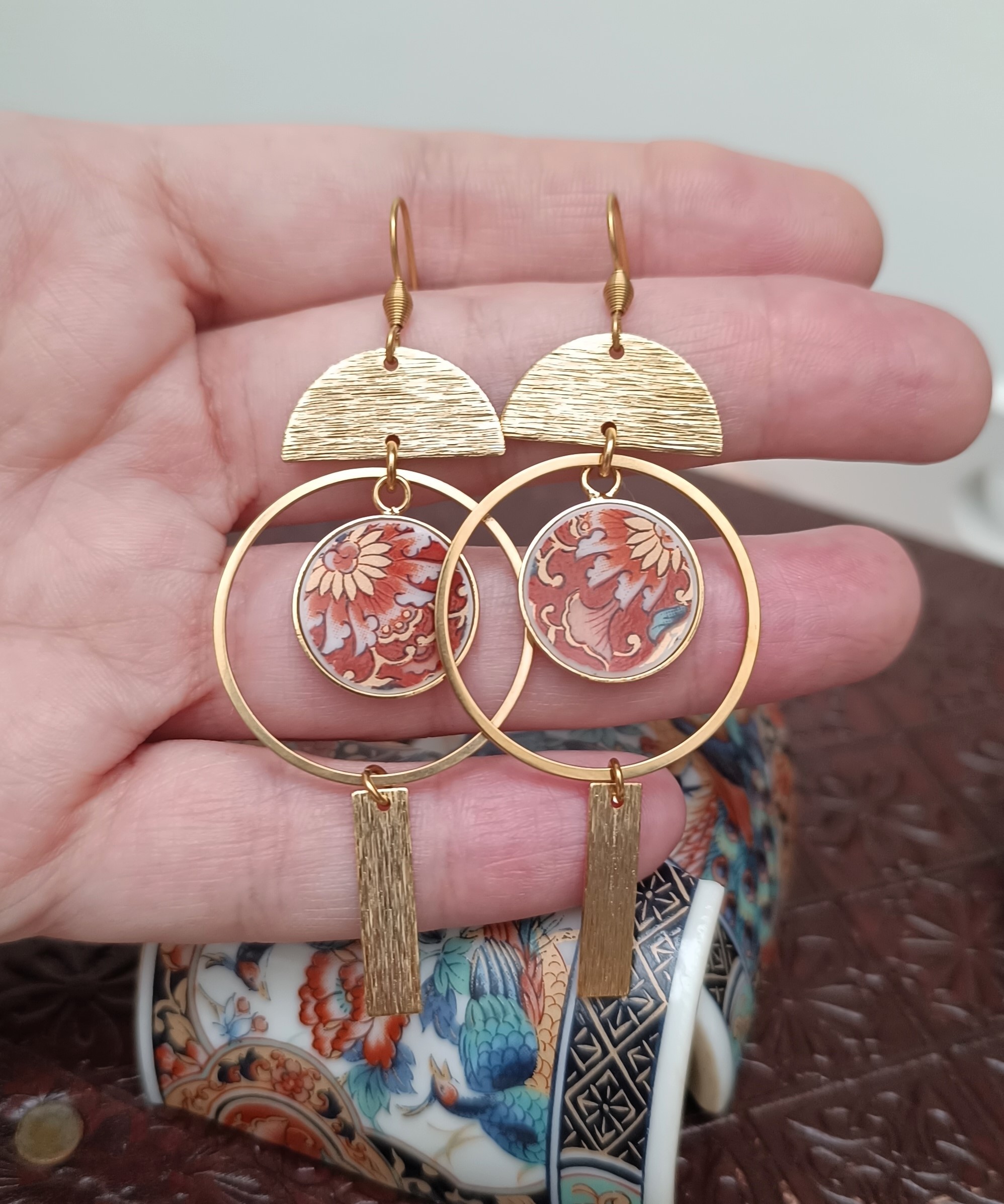 Chaque paire de boucles d’oreilles est une pièce unique, façonnée à la main à partir de vaisselle ancienne chinée avec soin.