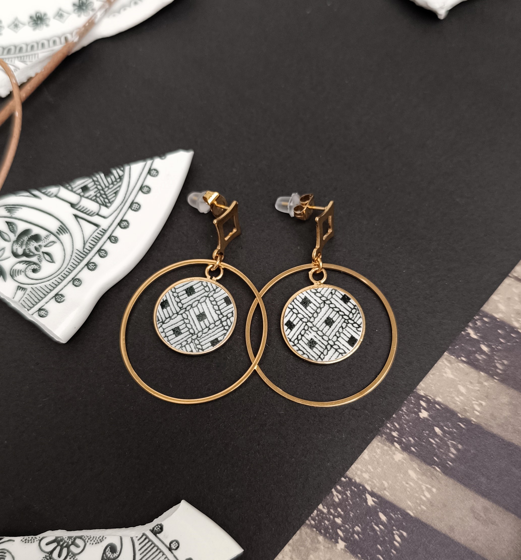 Ces boucles sont nées de la métamorphose d'une Assiette Parlante de la célèbre Faïencerie de Gien, datant d’environ 1870-1900, ornée de motifs en noir et blanc. Ce trésor du patrimoine français, oublié et fragmenté par le temps, a retrouvé vie sous mes mains, transformé en une paire de boucles d’oreilles en faïence ancienne, graphiques, poétiques et uniques.