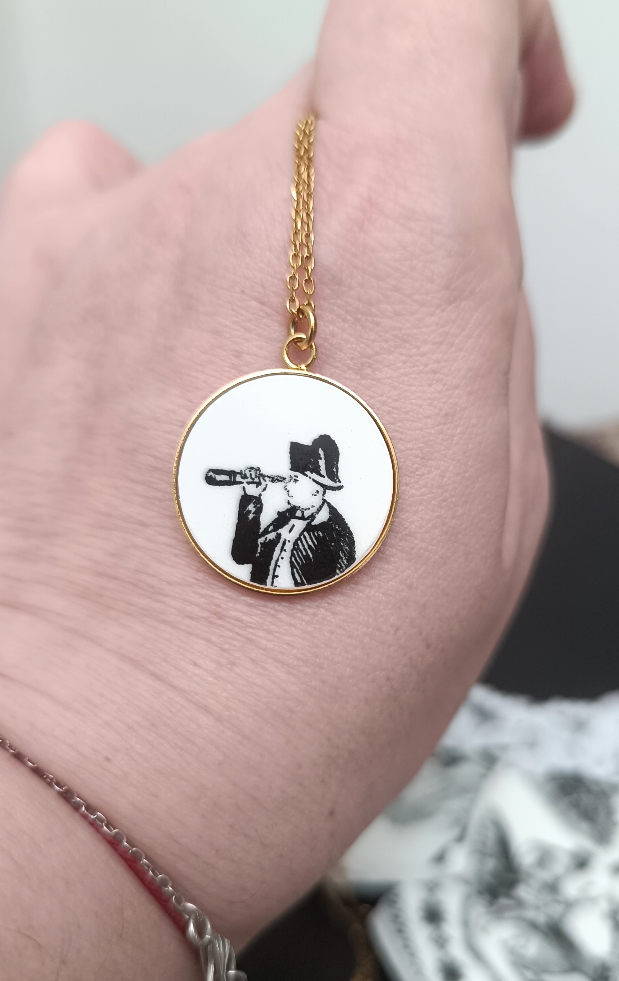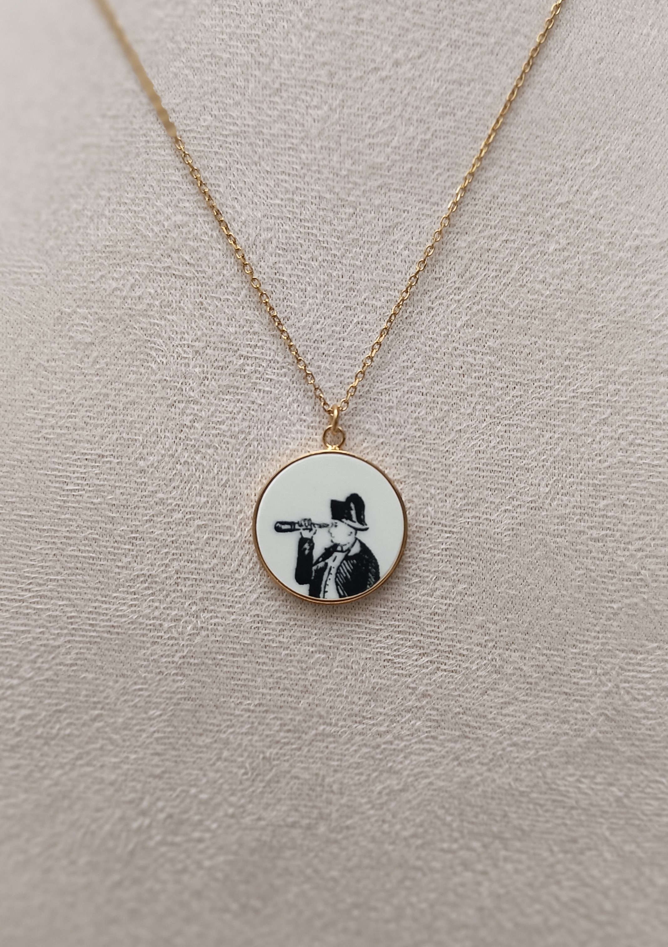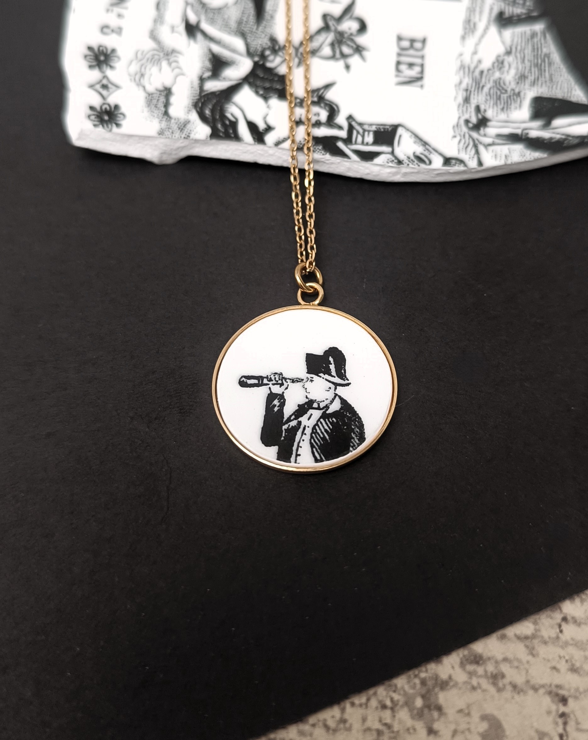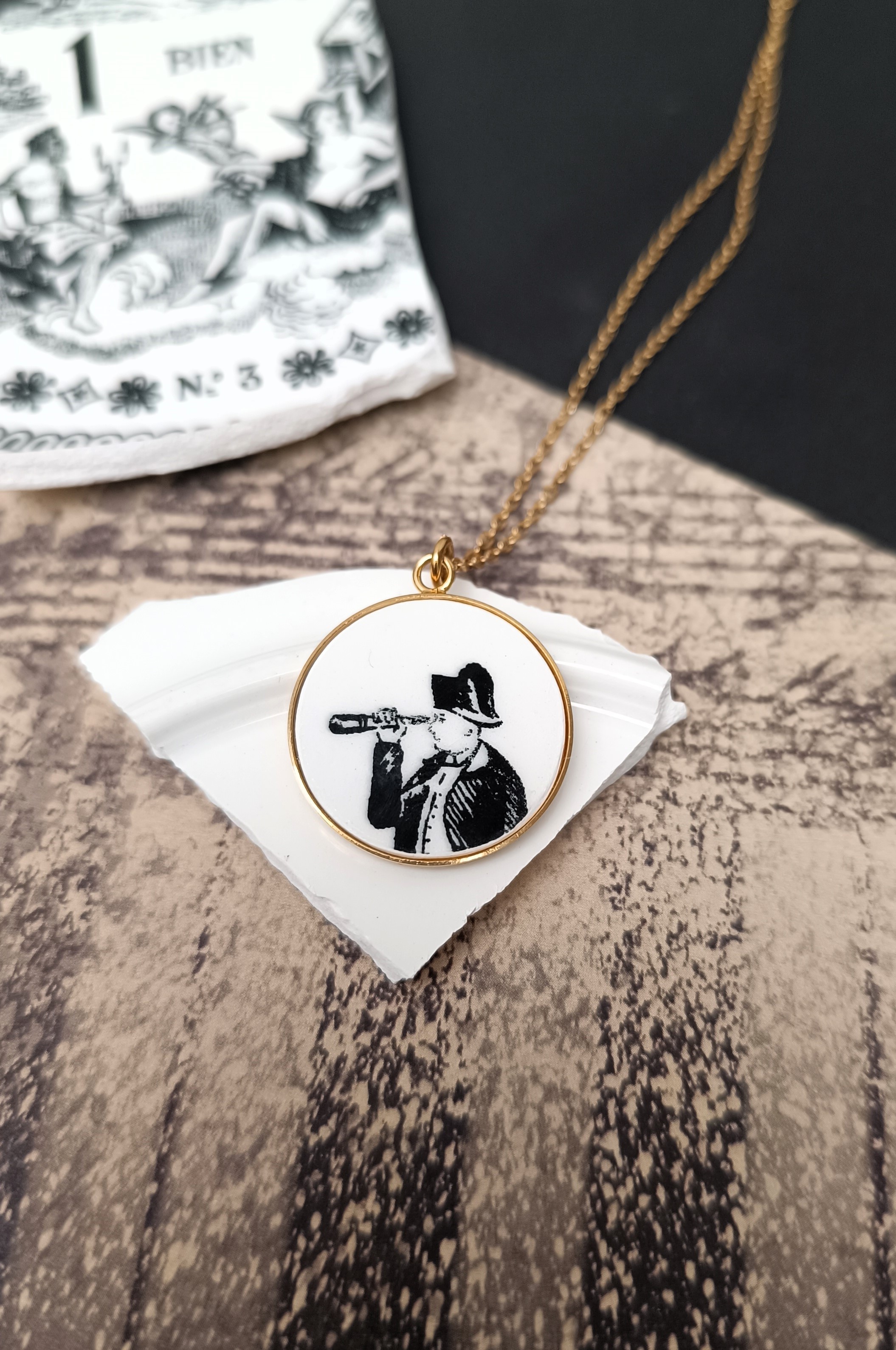 Ce sautoir est né de la métamorphose d'une Assiette Parlante de la célèbre Faïencerie de Gien, datant d’environ 1870-1900, ornée de motifs en noir et blanc. Ce trésor du patrimoine français, oublié et fragmenté par le temps, a retrouvé vie sous mes mains, transformé en un pendentif en faïence ancienne, graphique, poétique et unique.