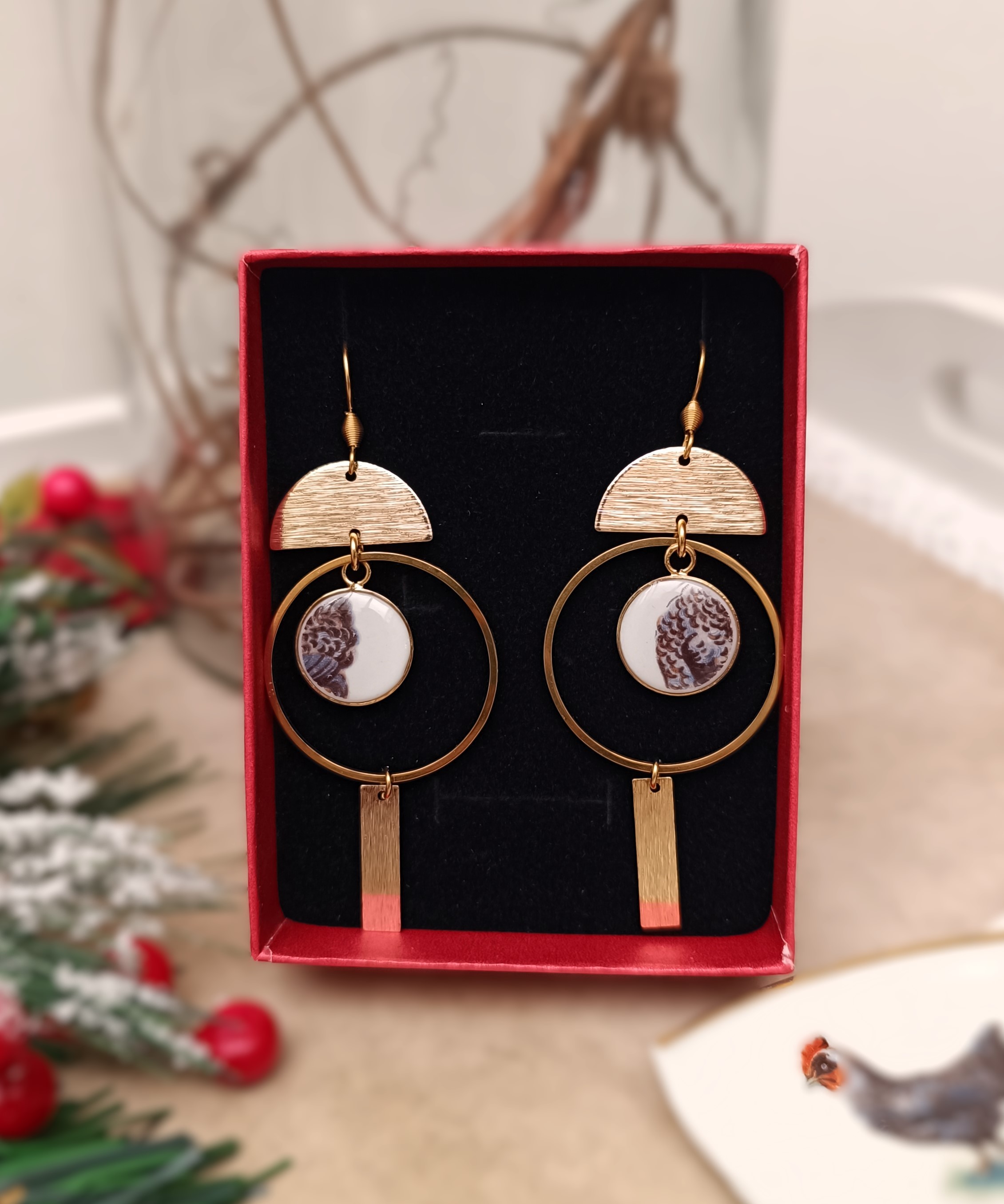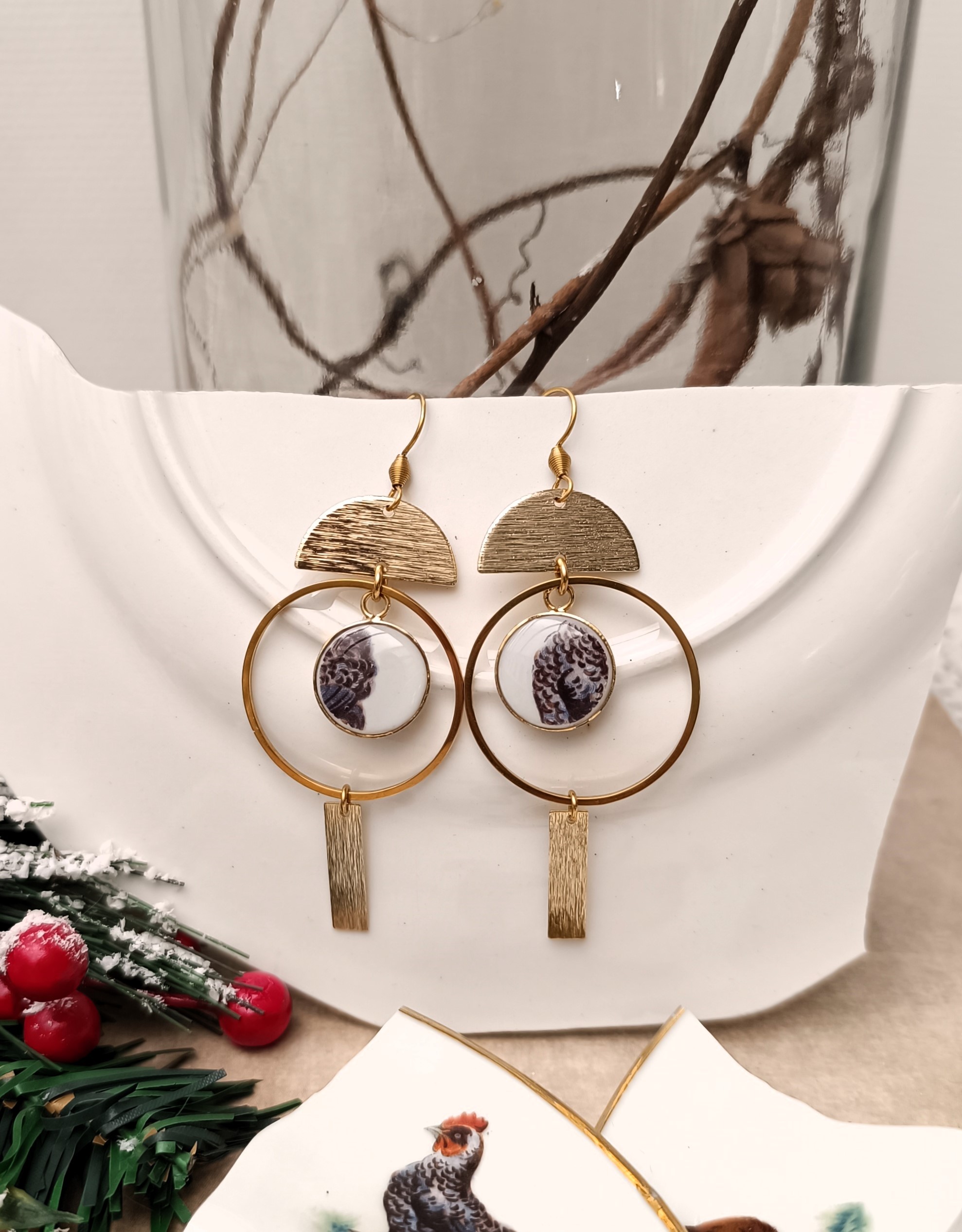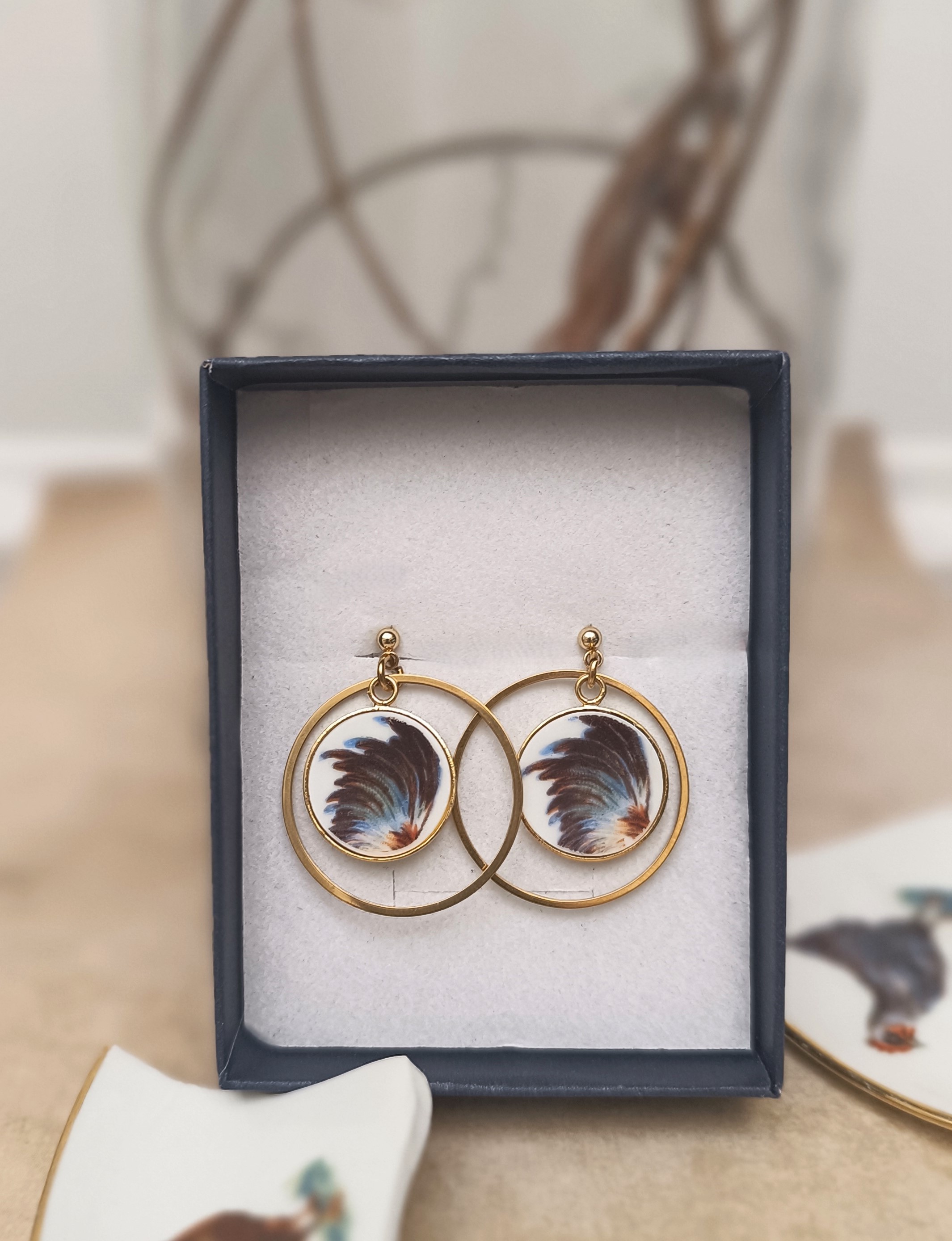Deux paires uniques nées de la transformation poétique d’une sous-tasse familiale ornée d’un motif de coqs. J’ai prélevé et découpé délicatement la zone des plumes pour en tirer une interprétation moderne, graphique et contemporaine, tout en respectant l’âme de l’objet d’origine.