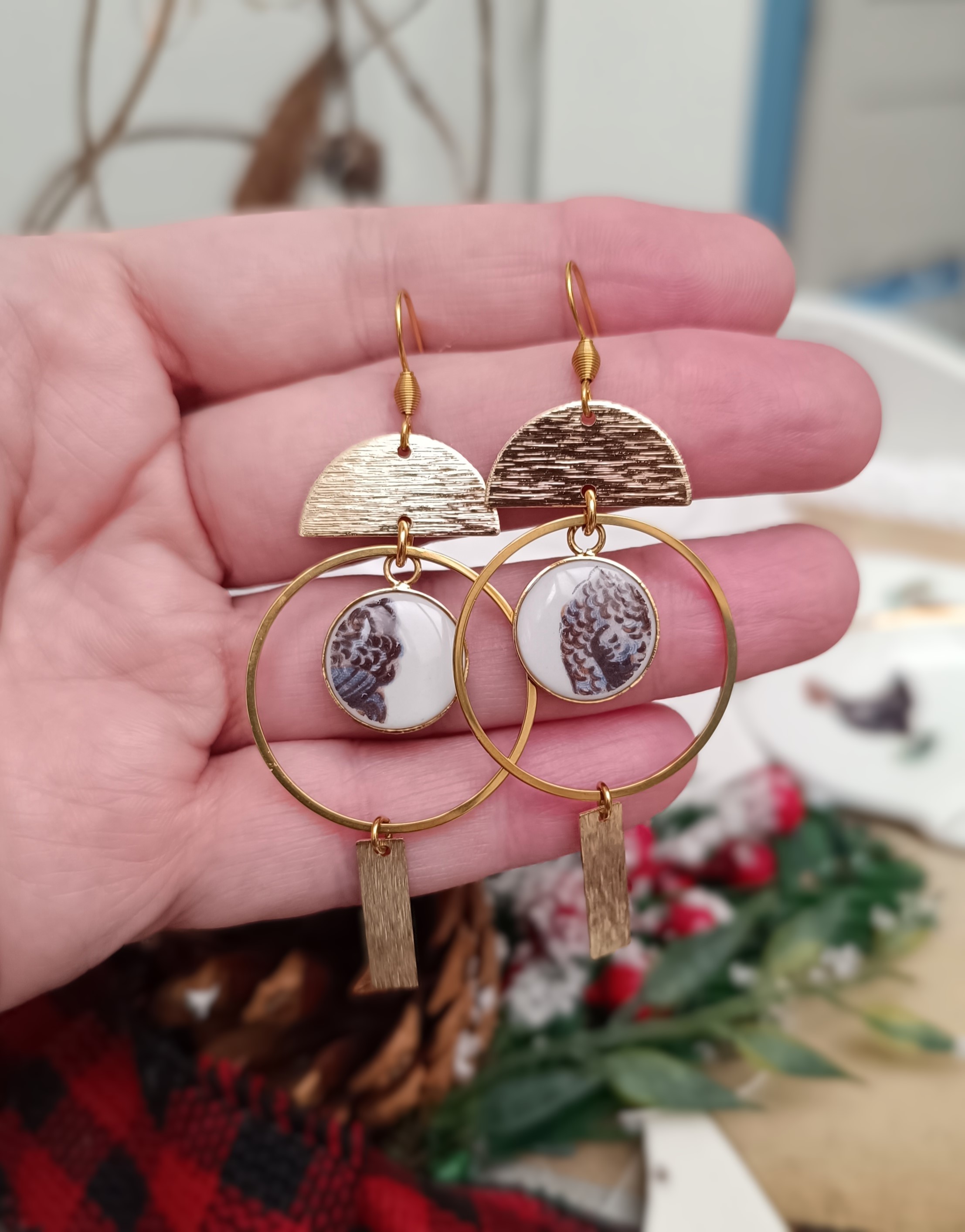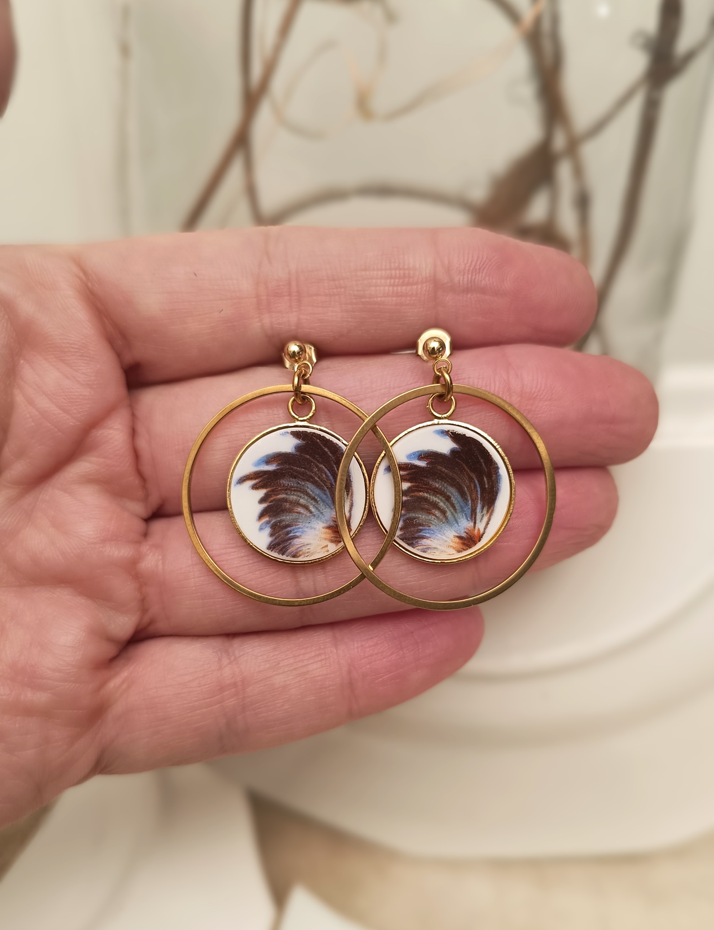 Boucles d’oreilles – Plumes de Coq – Porcelaine familiale ancienne transformée