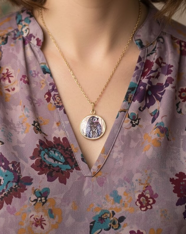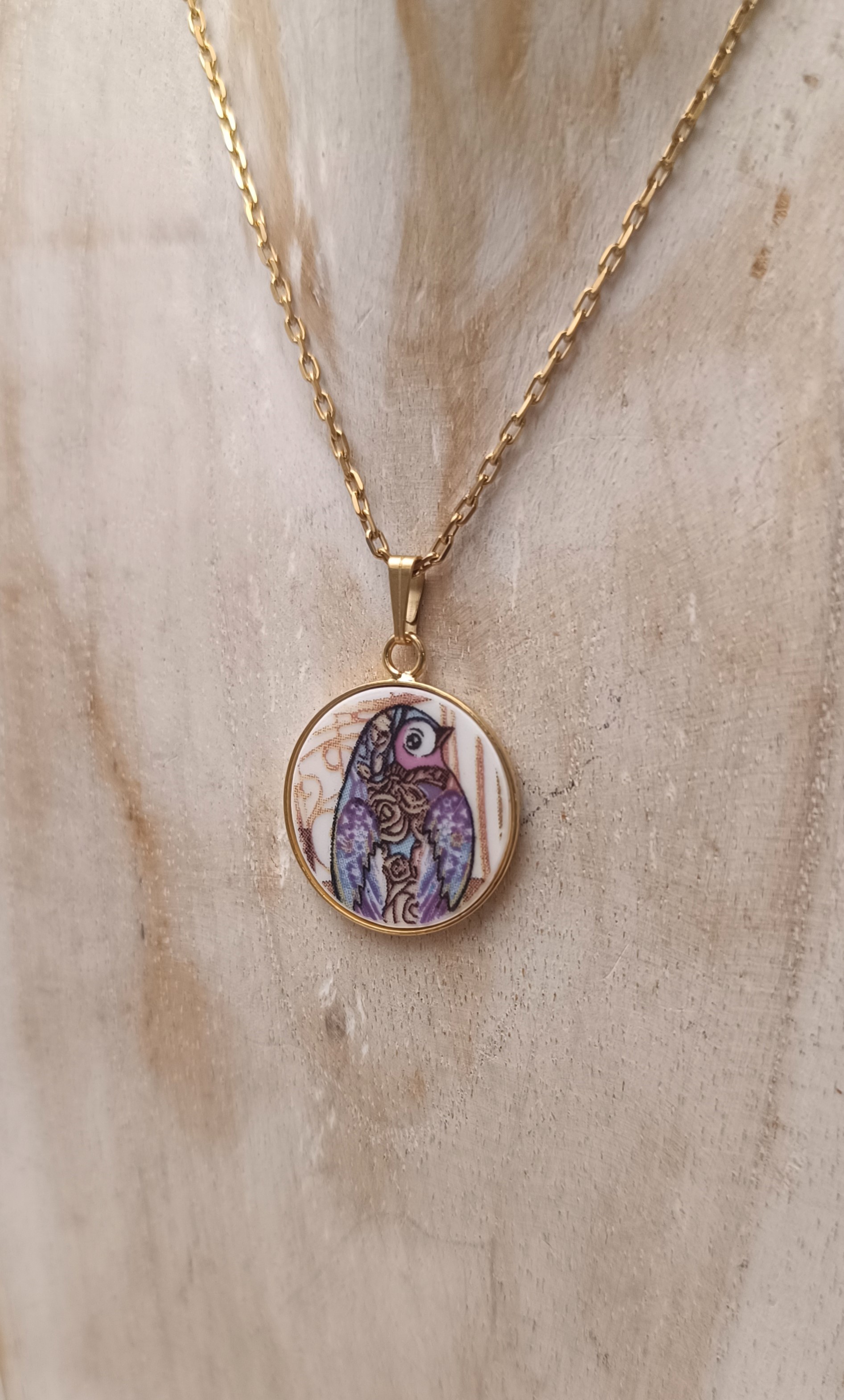 Ce collier unique est né de la transformation d’une sous-tasse en porcelaine chinée avec soin. Le pendentif ovale, délicatement découpé et sculpté, révèle un joli motif d'un petit oiseau soigneusement sélectionné. Chaque fragment de porcelaine a été sublimé et serti dans un support en laiton de grande qualité, finition antique, donnant au bijou un style à la fois poétique et intemporel.