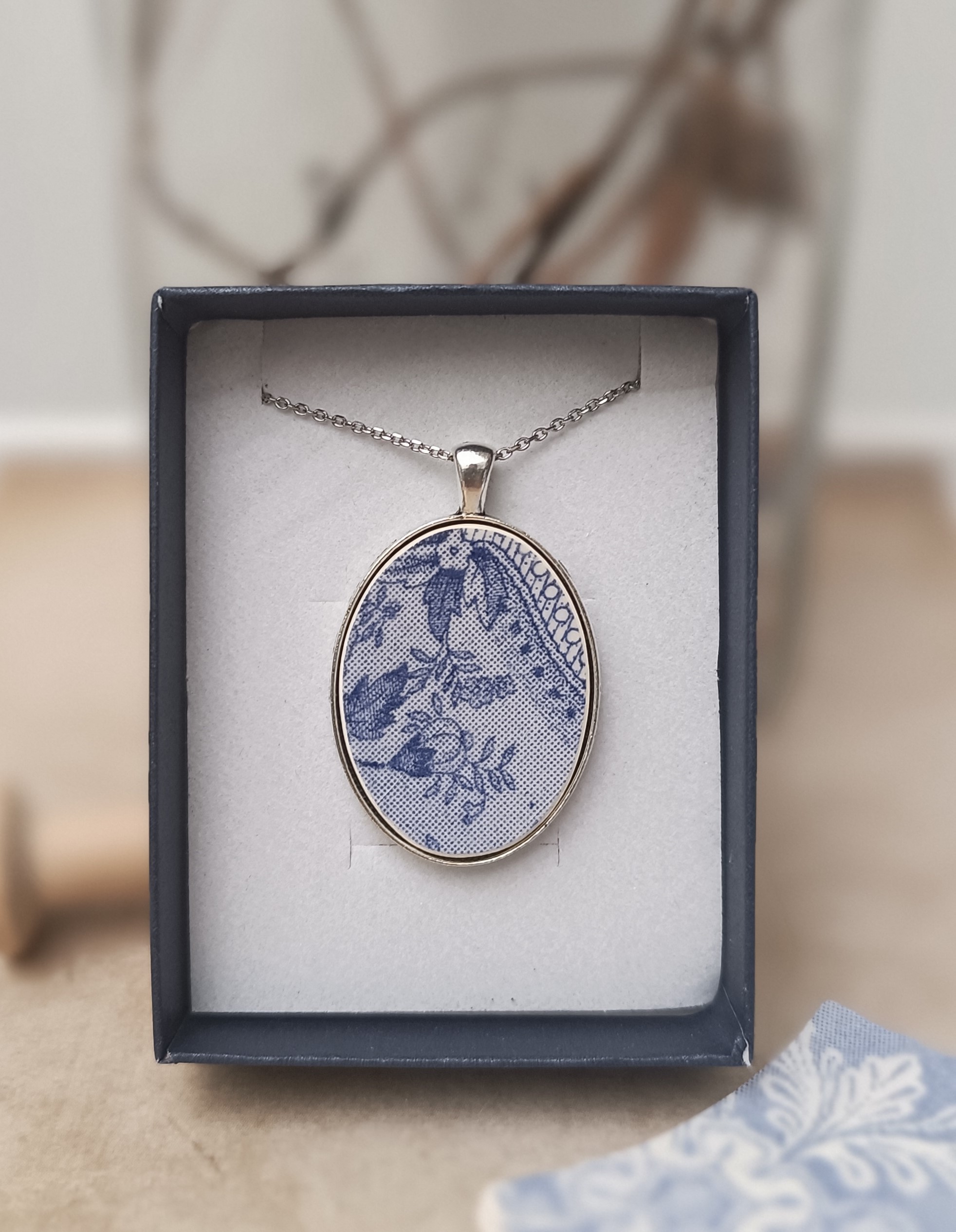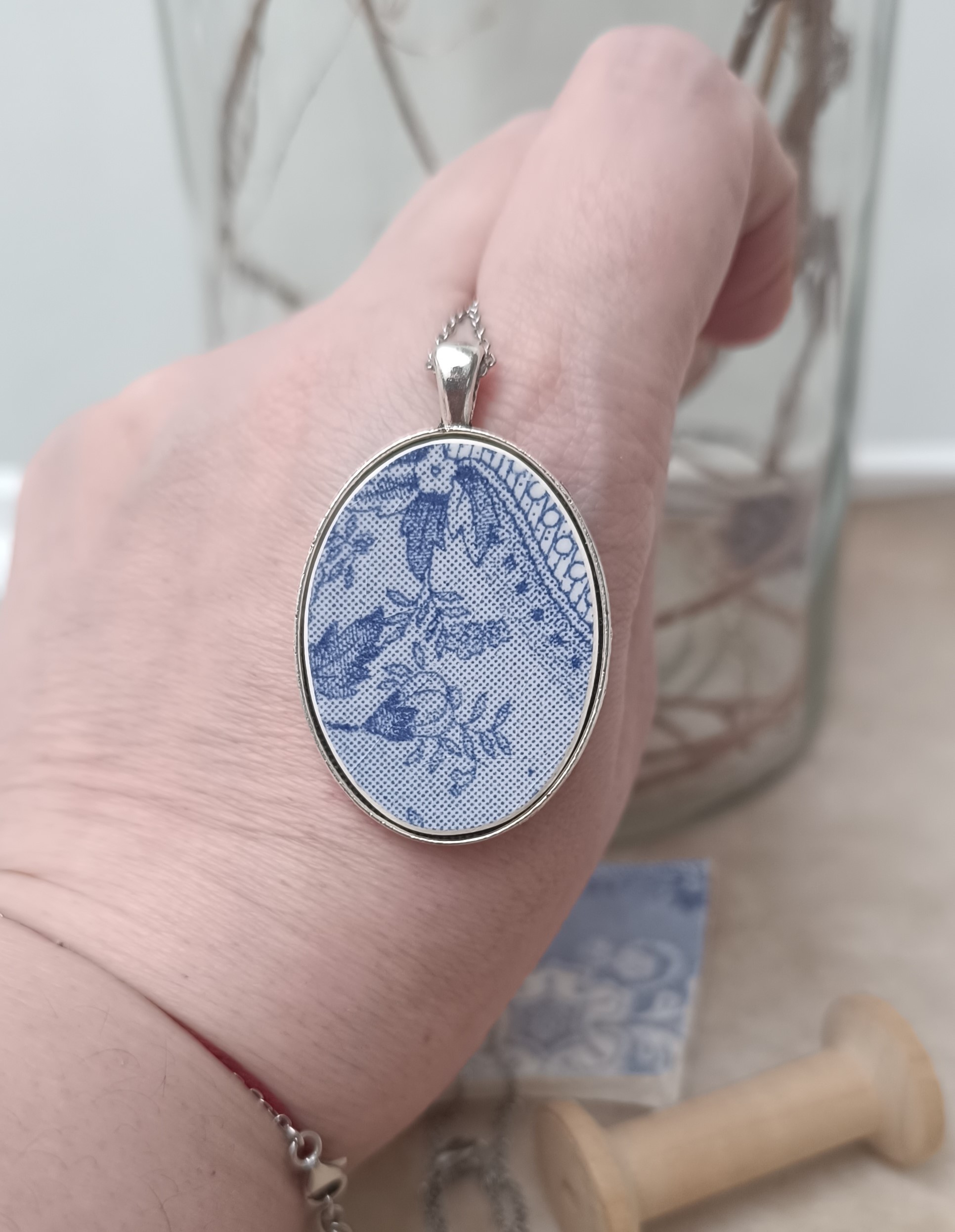 Ce pendentif est issu de la transformation d’une ancienne assiette en faïence anglaise.