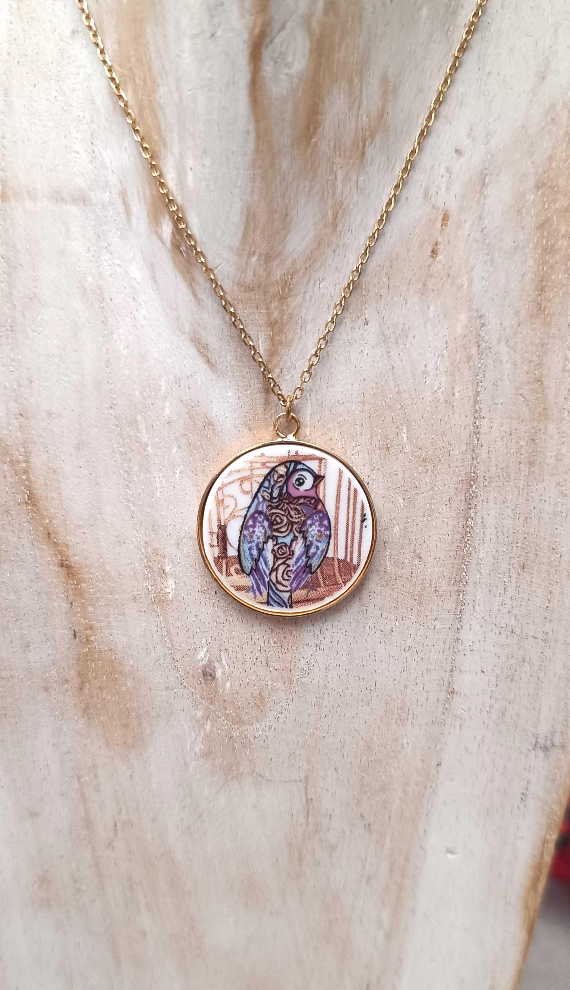 Le collier À la Volette est une pièce unique issue de la transformation d’une sous-tasse en porcelaine. Son pendentif rond de 25 mm, soigneusement découpé, meulé et sculpté à la main, laisse apparaître un oiseau délicat extrait au cœur du motif d’origine. Une miniature poétique, préservée de l’oubli et réinventée en bijou.
