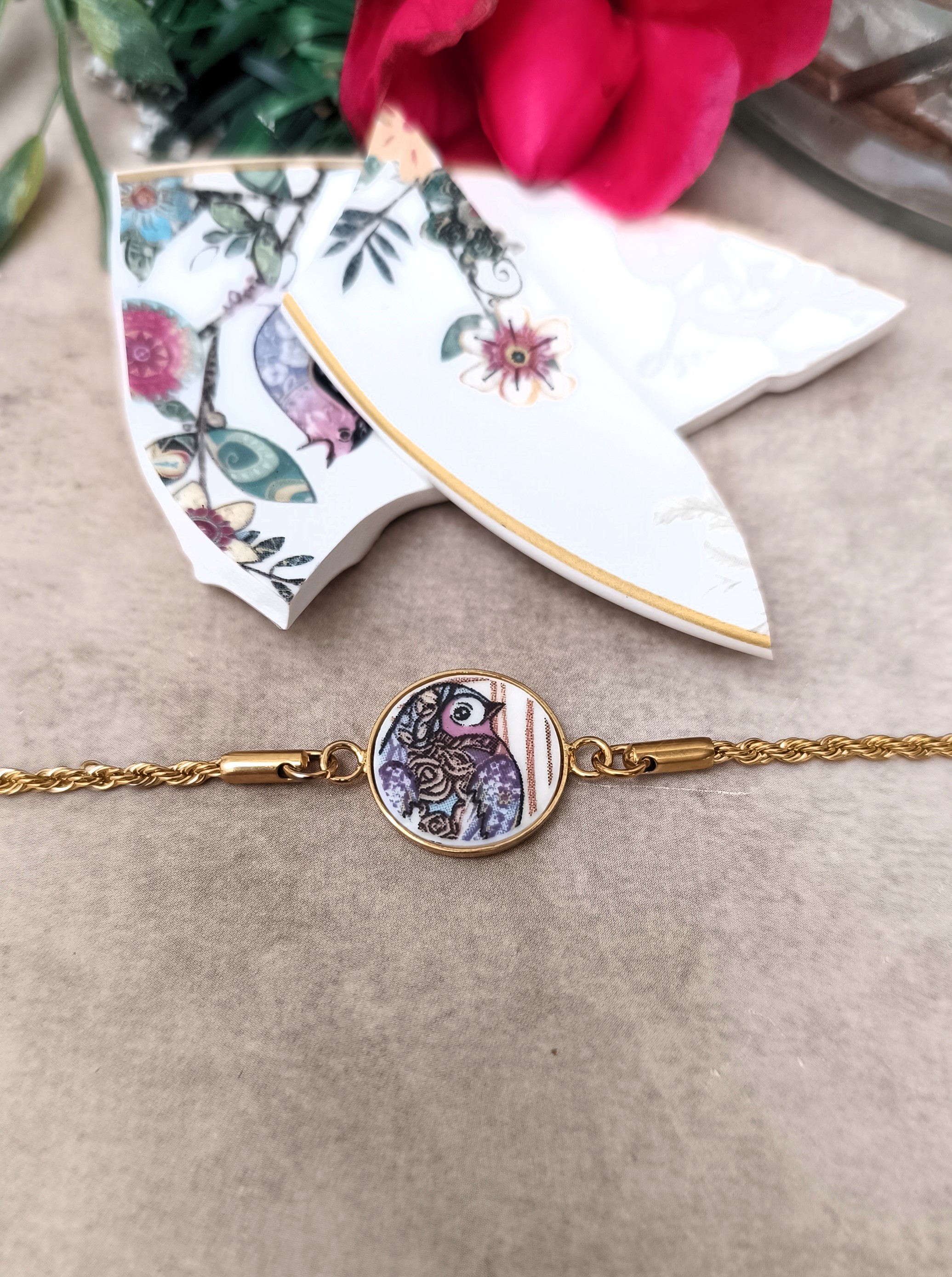 Le bracelet À la Volette est une pièce unique issue de la transformation d’une sous-tasse en porcelaine. Son support rond de 16 mm, soigneusement découpé, meulé et sculpté à la main, révèle un motif délicat d’oiseau, préservé de l’oubli et réinventé en bijou poétique.
