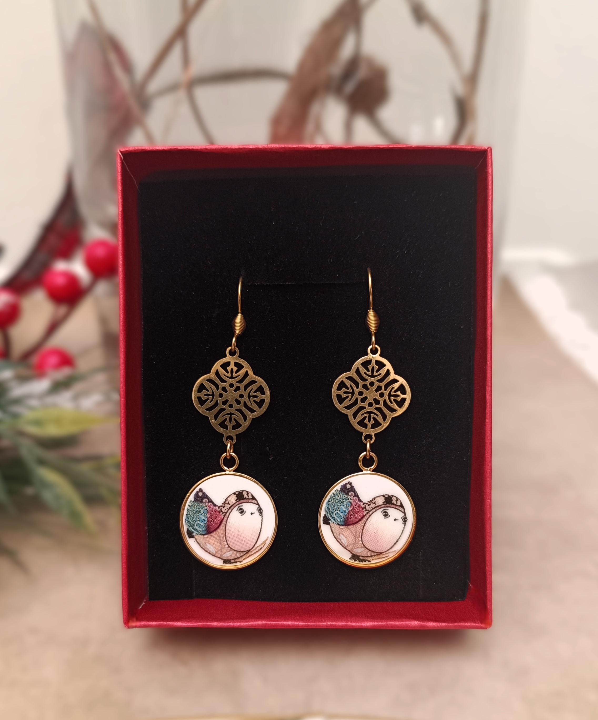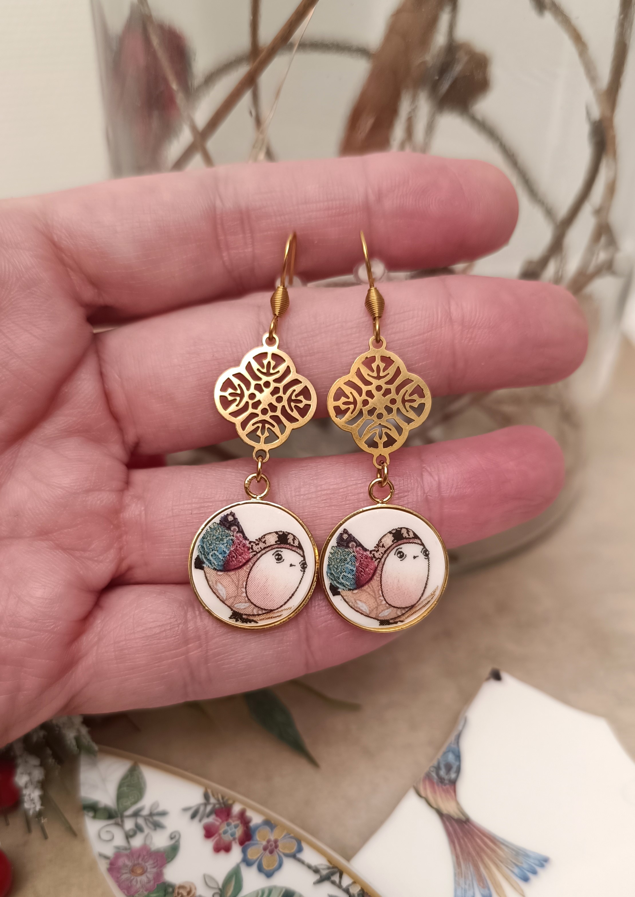 Ces boucles uniques sont nées de la transformation d’une sous-tasse en porcelaine soigneusement sélectionnée. Leurs supports ronds de 18 mm, délicatement découpés et sculptés à la main, révèlent un motif de fleurs et de feuilles, sublimé par le savoir-faire artisanal.