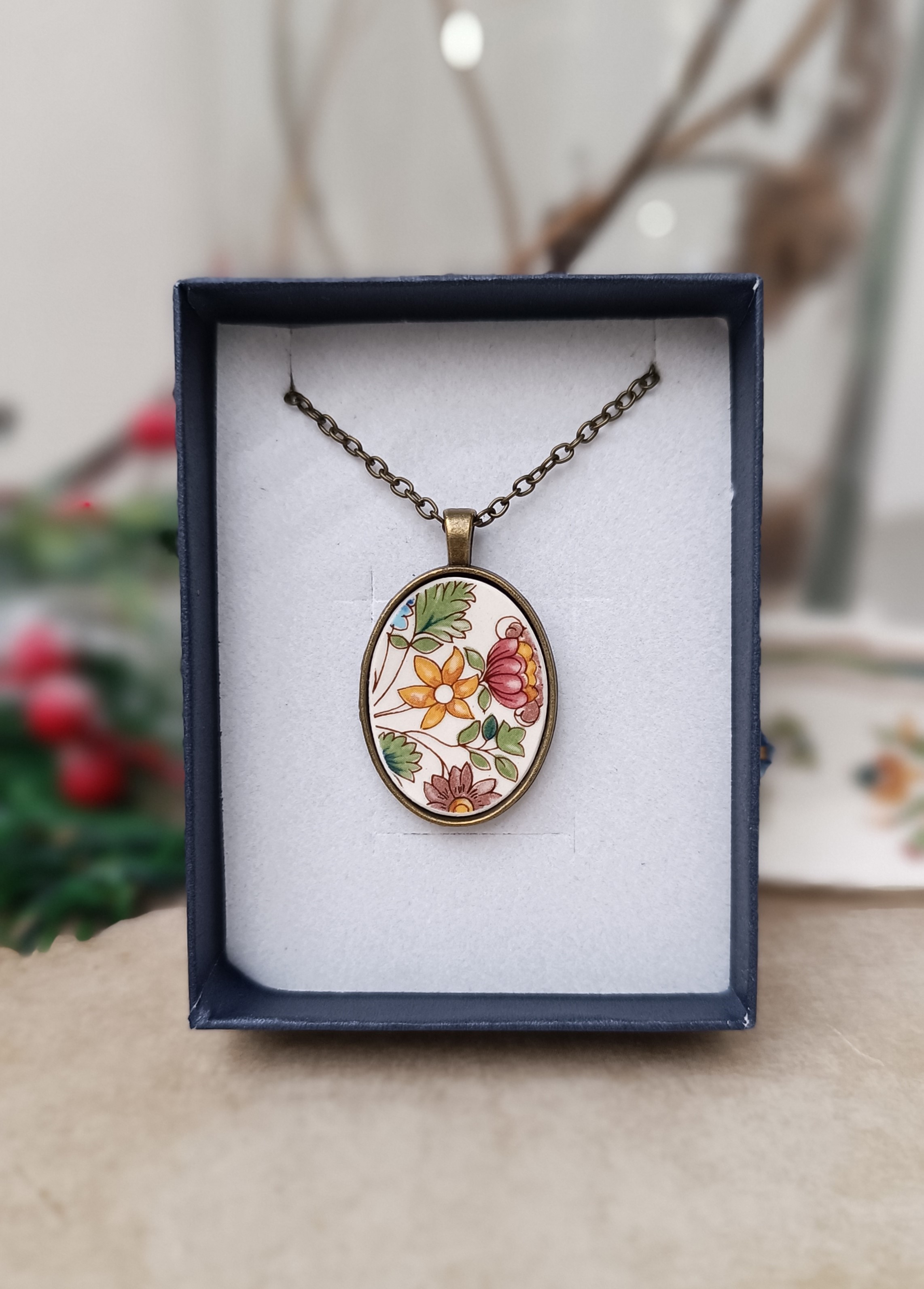 Ce collier a été créé à partir d’un fragment soigneusement découpé dans une assiette familiale en porcelaine.