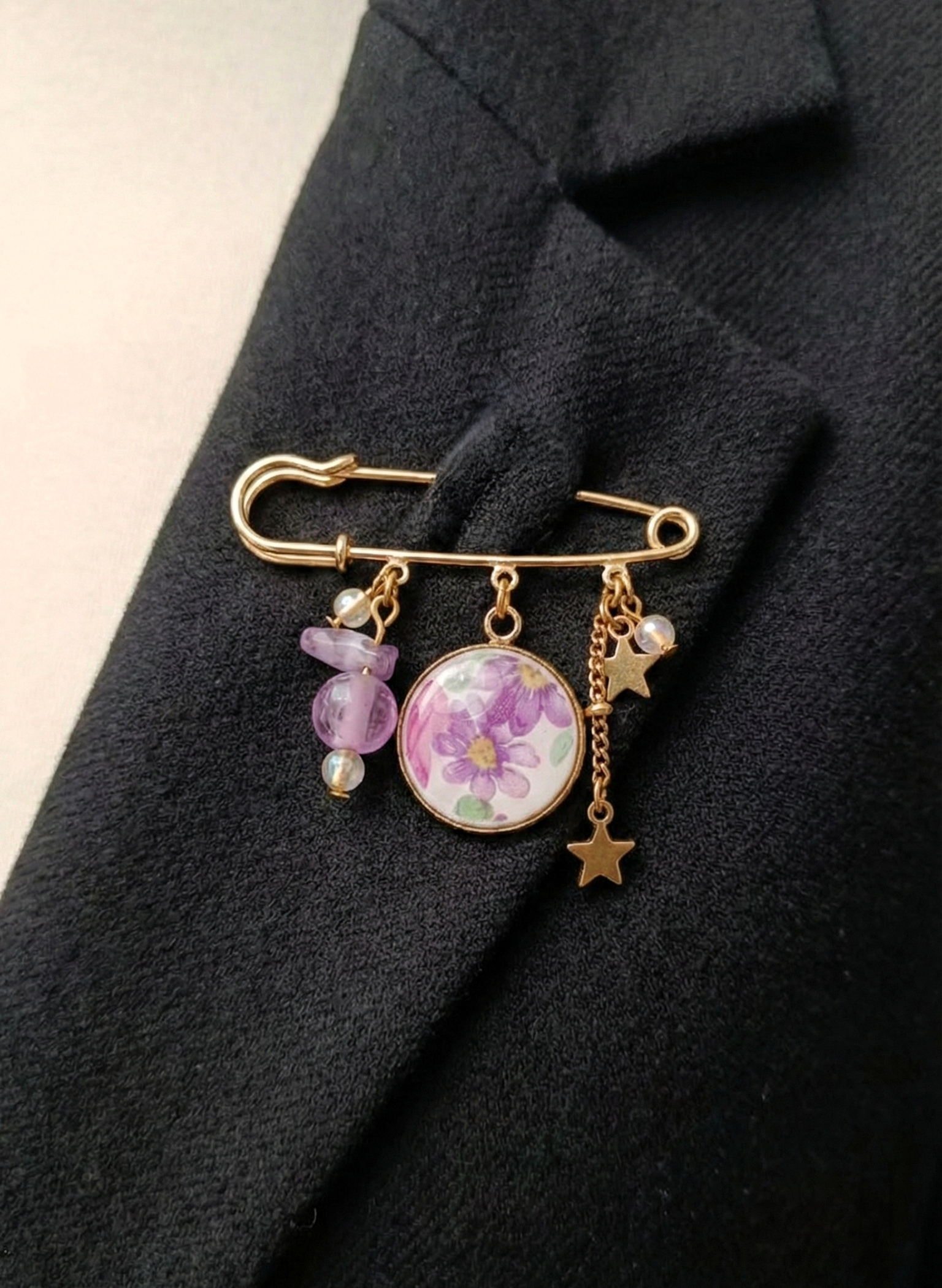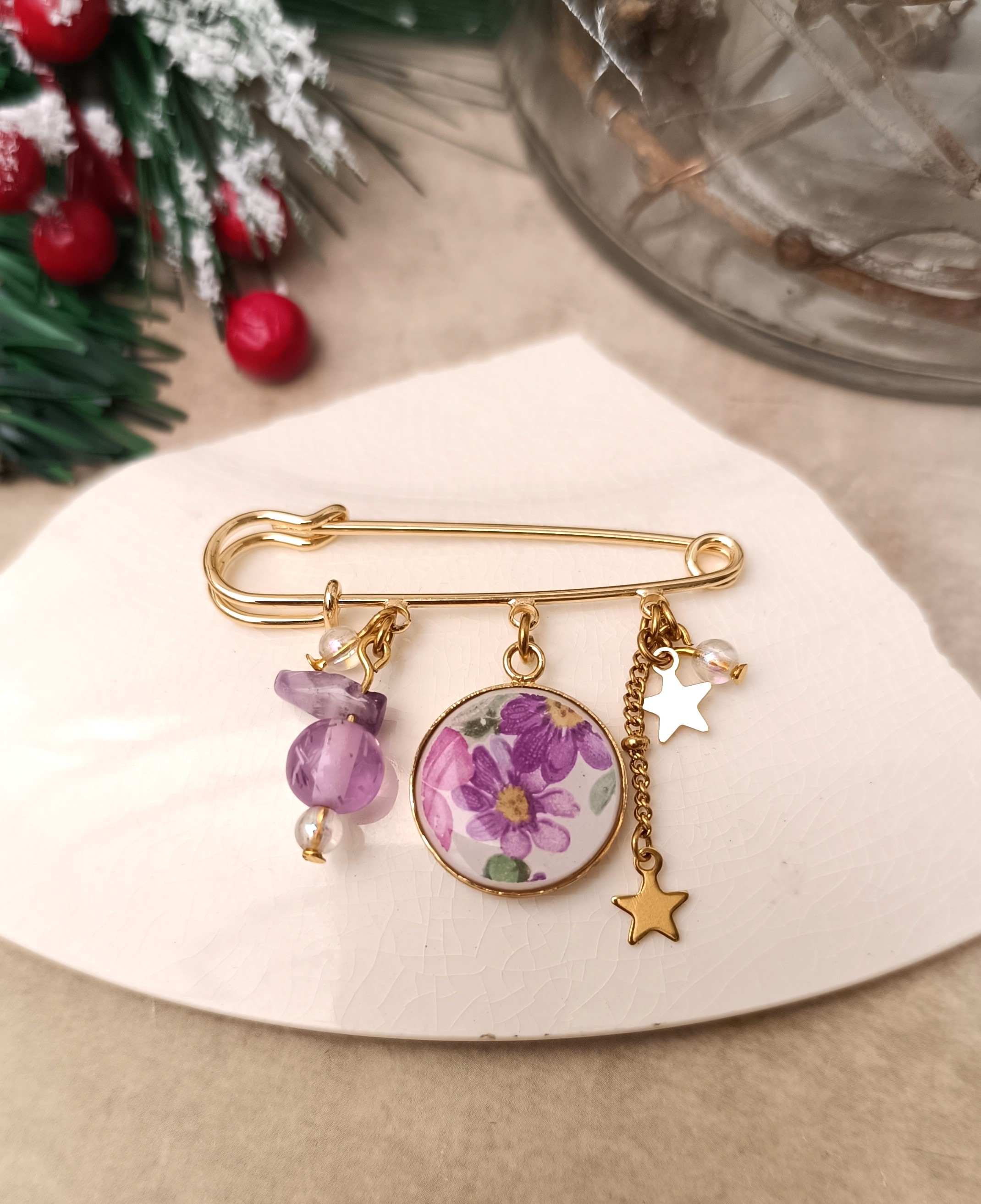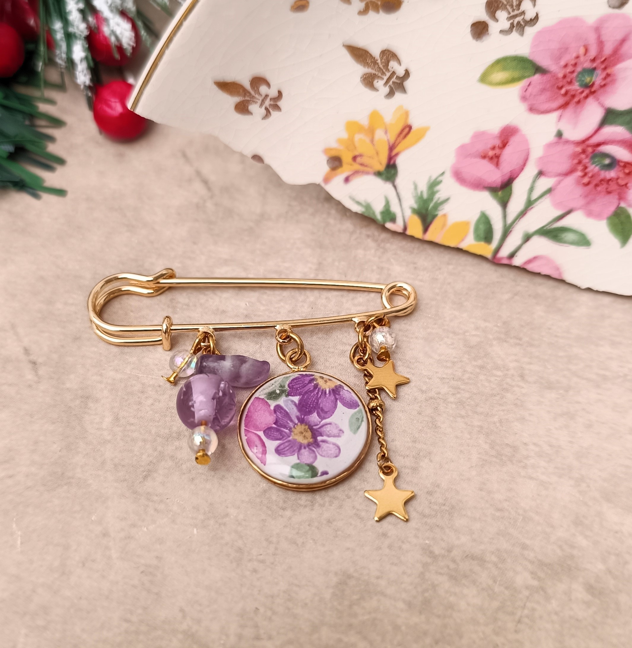 Le motif fleuri violet, rehaussé de touches vertes et roses, est mis en valeur par une fine couche de résine qui protège et fait briller la faïence. Des perles recyclées, petites breloques et chaînettes complètent la création, pour un bijou poétique et élégant.