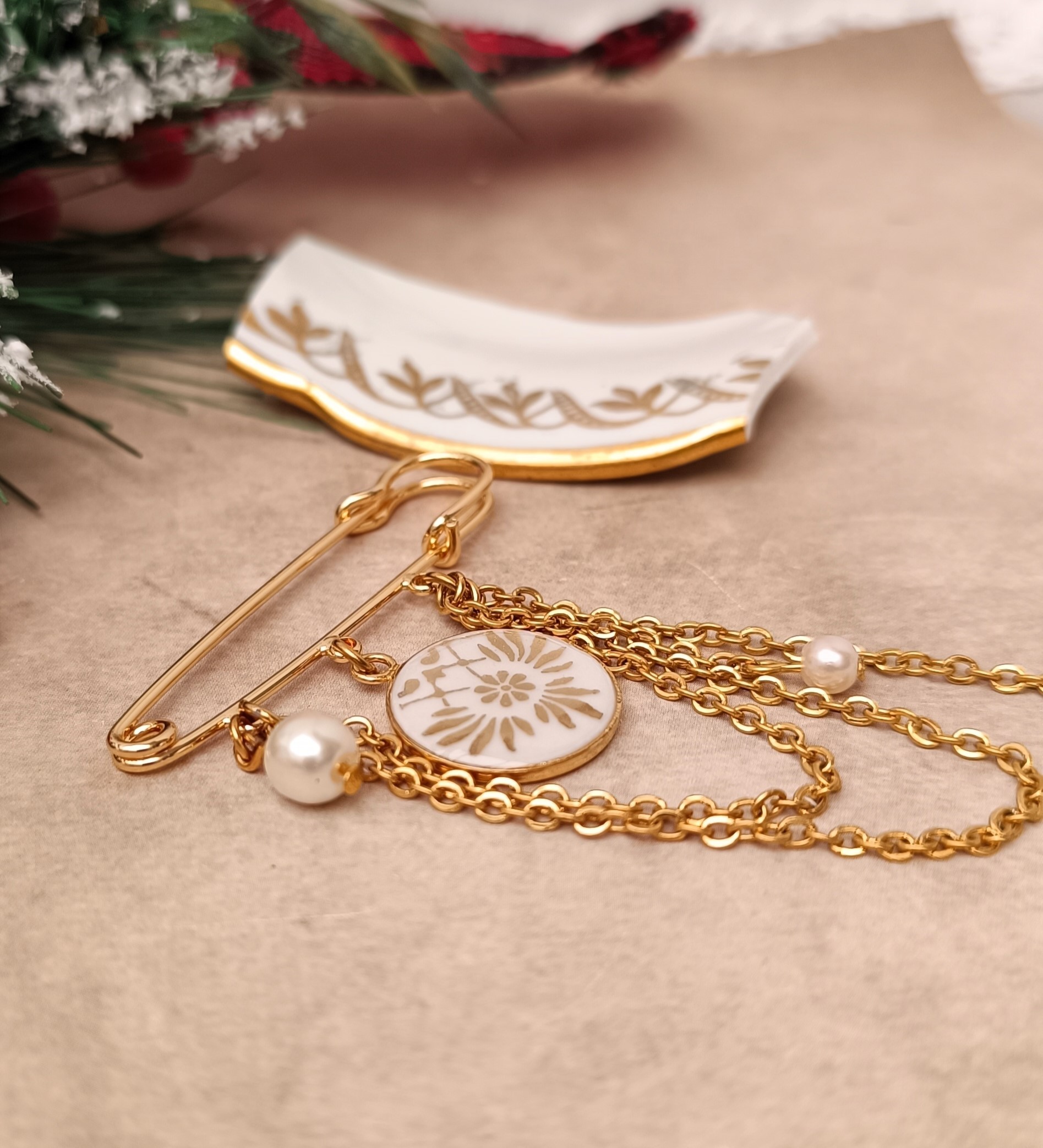 Céleste est une broche née d’un fragment d’assiette en porcelaine de Limoges, soigneusement découpé, poli et métamorphosé. Sa surface blanche et son filet d’or confèrent une élégance intemporelle, tandis que les chaînettes, les perles nacrées recyclées apportent une dynamique délicatement céleste.