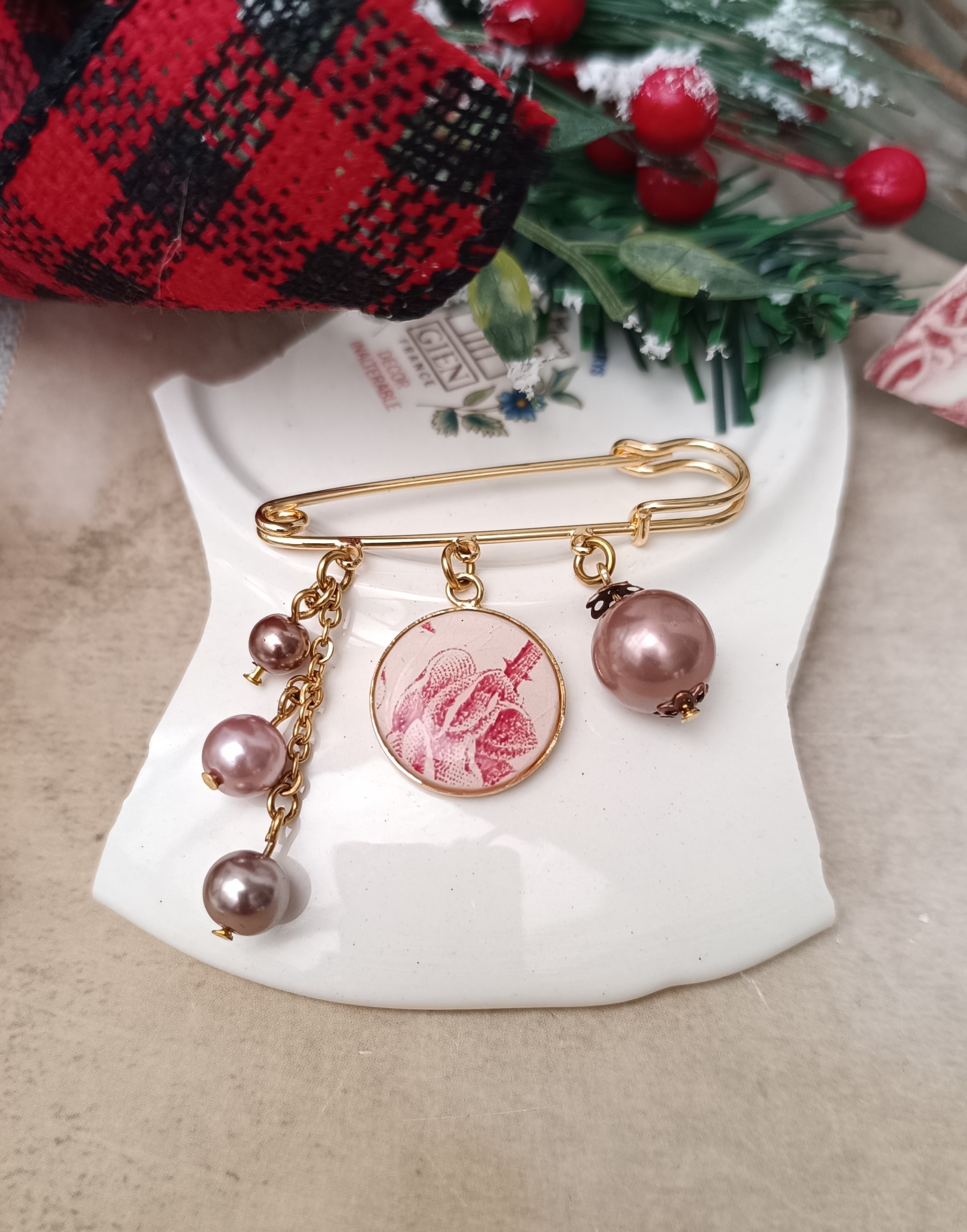 Cette broche unique est née d’un fragment de soupière ancienne en faïence Terre de Fer, soigneusement transformé dans mon atelier à Calais.