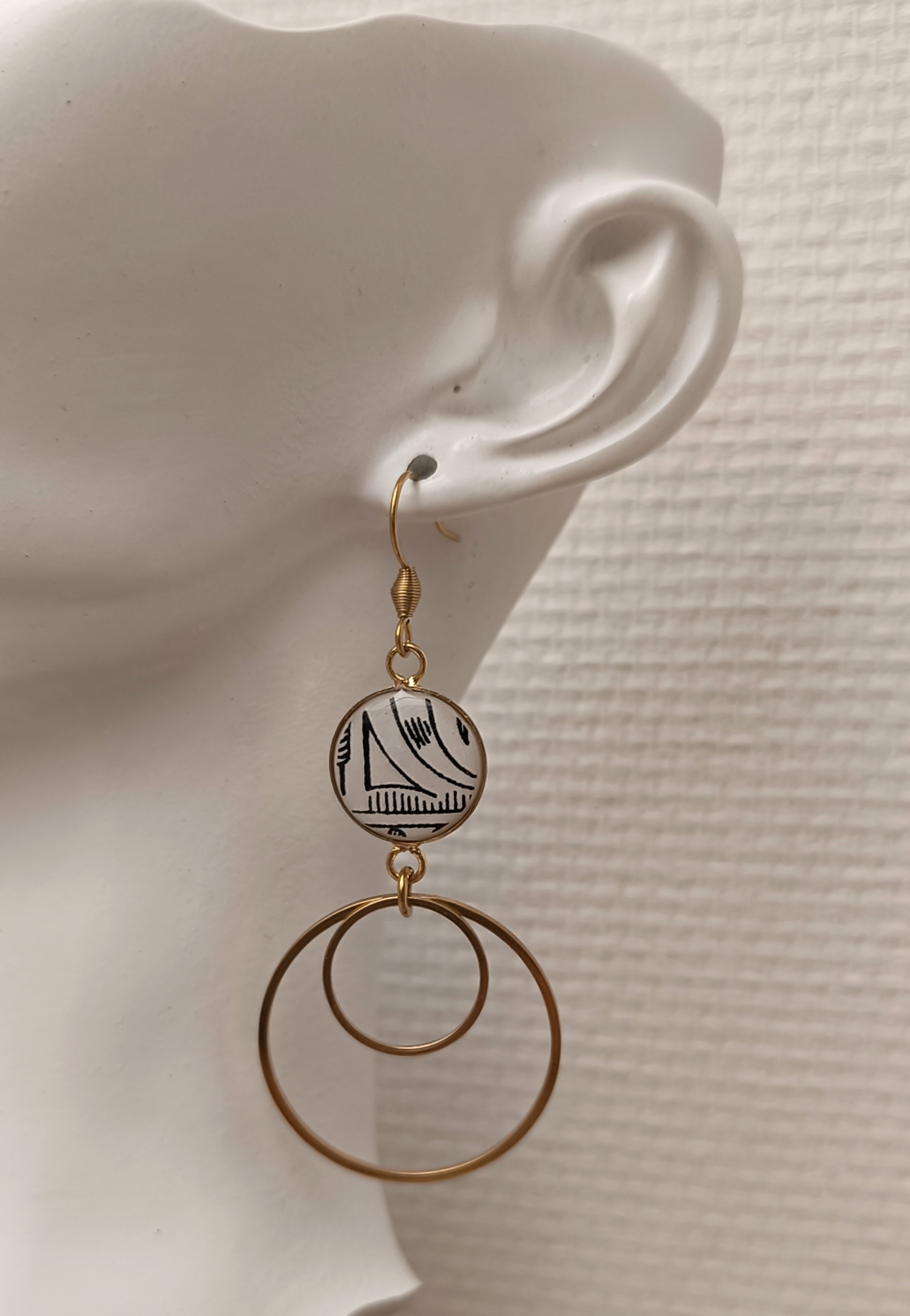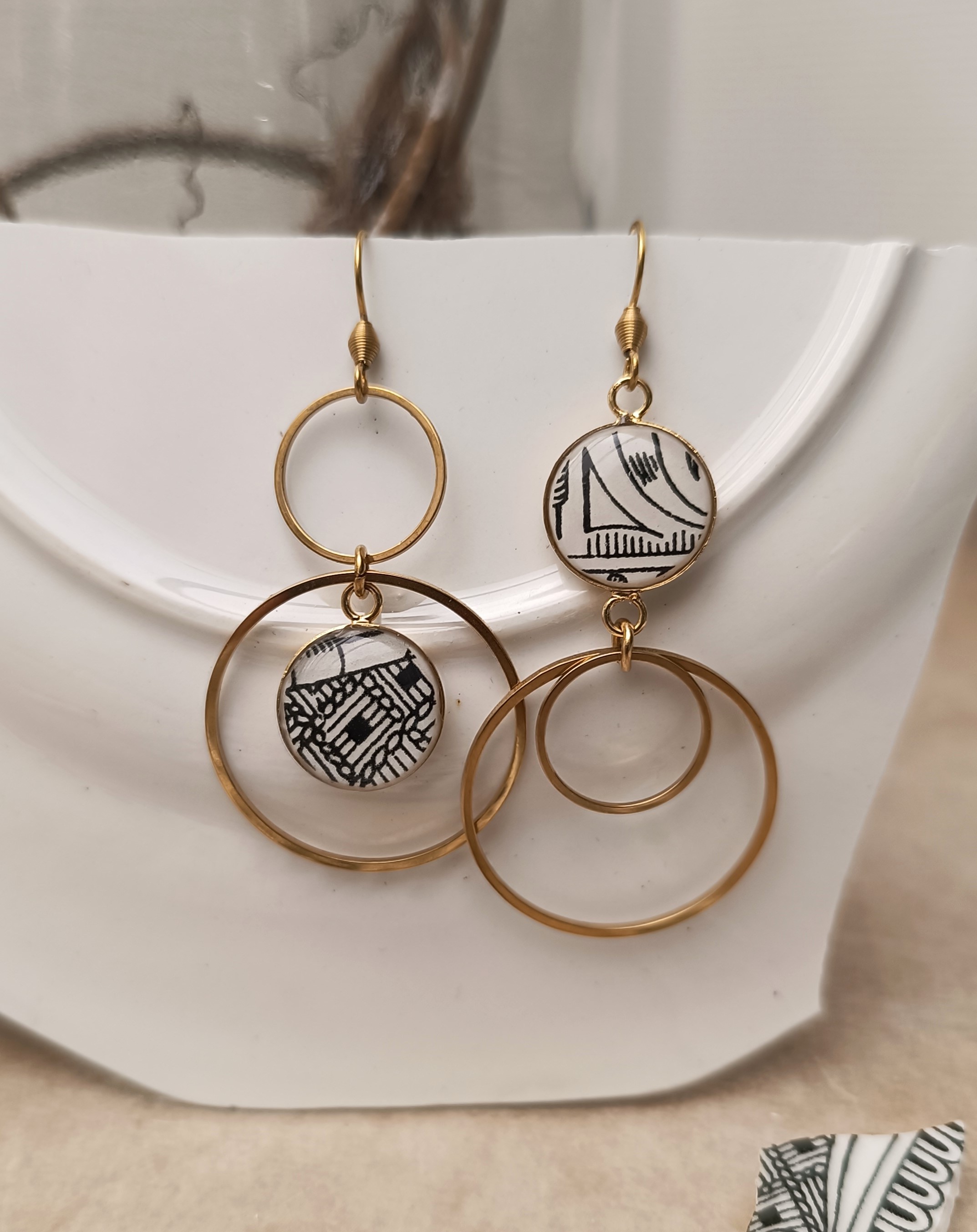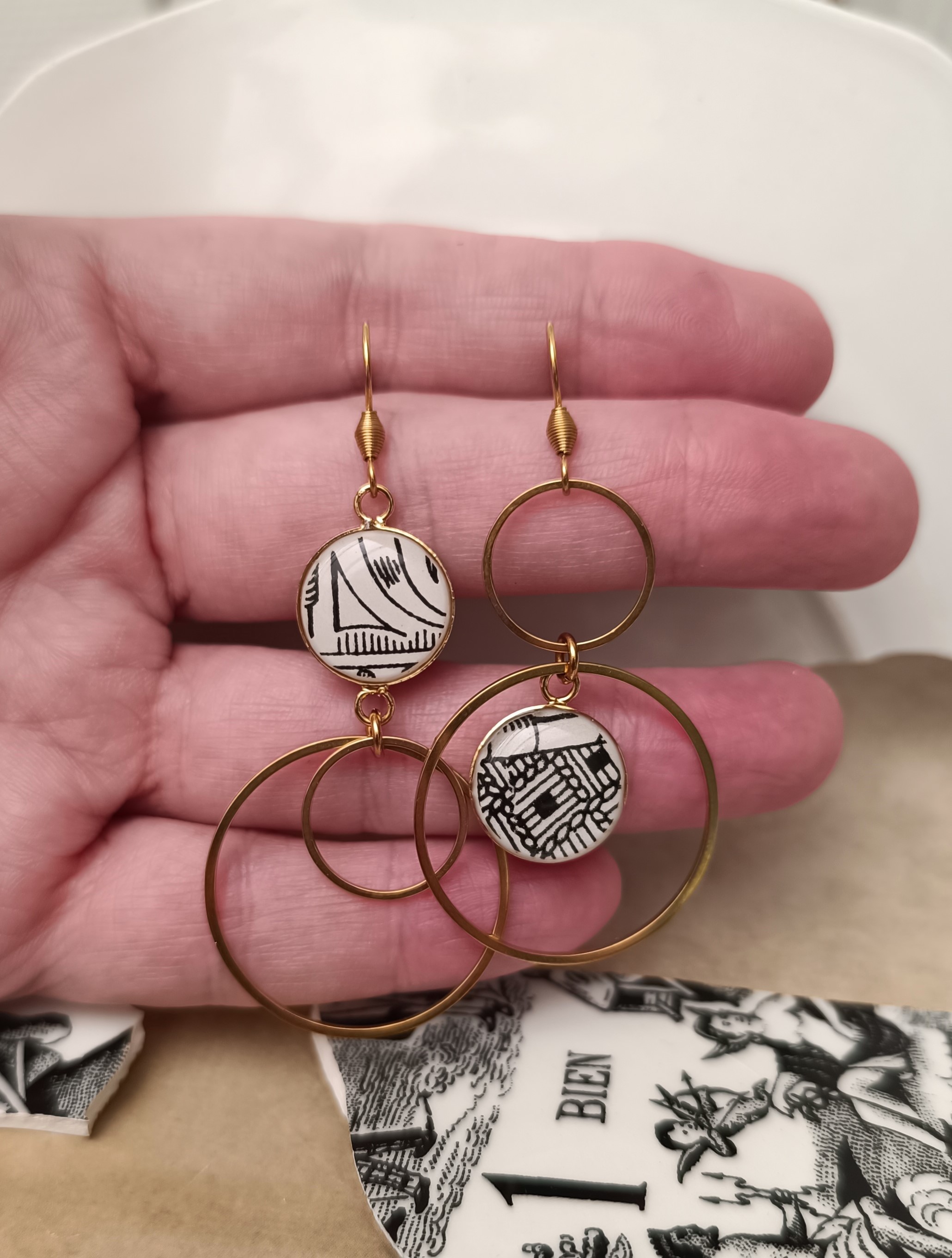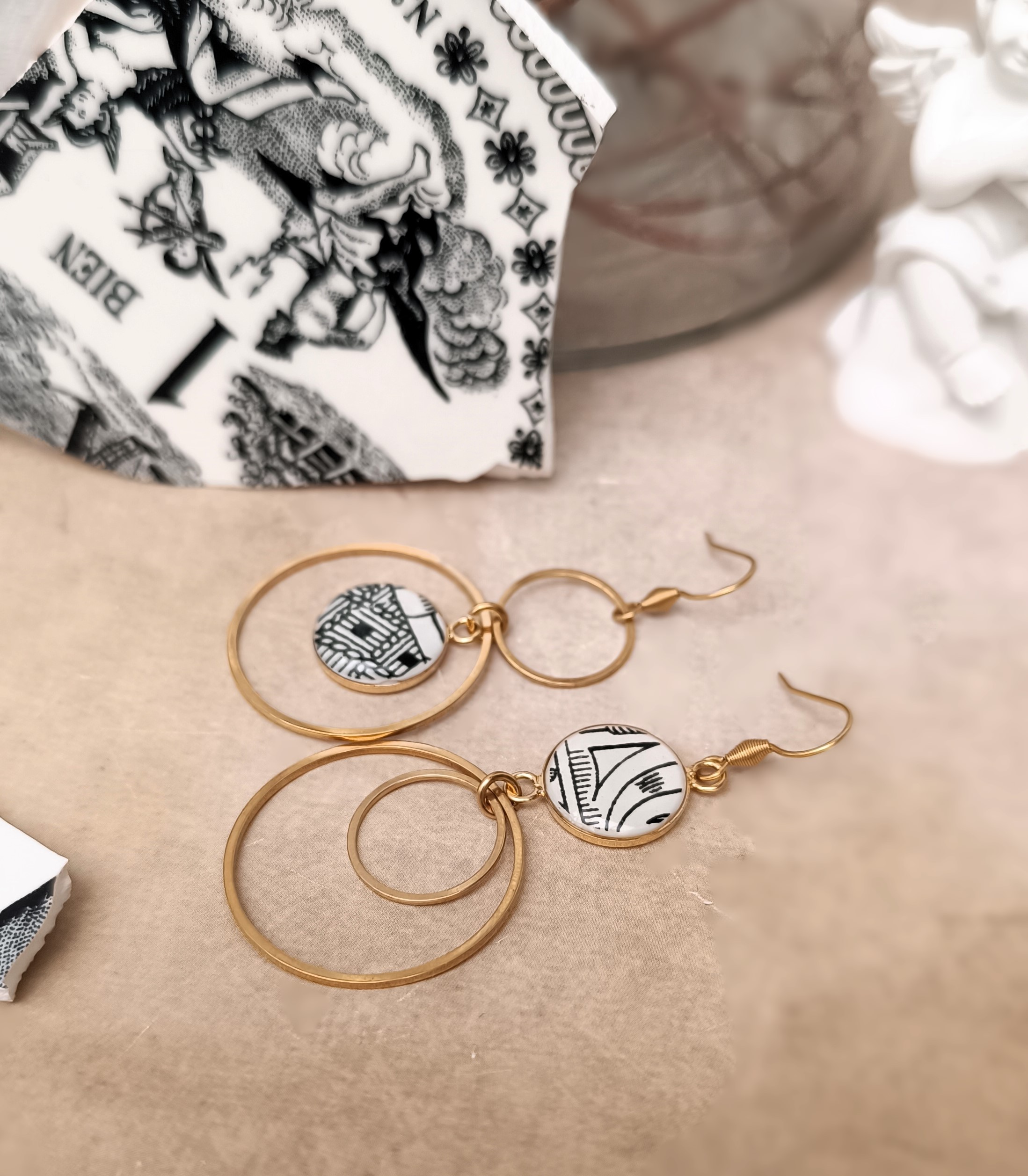 Ces boucles sont nées de la métamorphose d'une Assiette Parlante de la célèbre Faïencerie de Gien, datant d’environ 1870-1900, ornée de motifs en noir et blanc. Ce trésor du patrimoine français, oublié et fragmenté par le temps, a retrouvé vie sous mes mains, transformé en une paire de boucles en faïence ancienne unique.