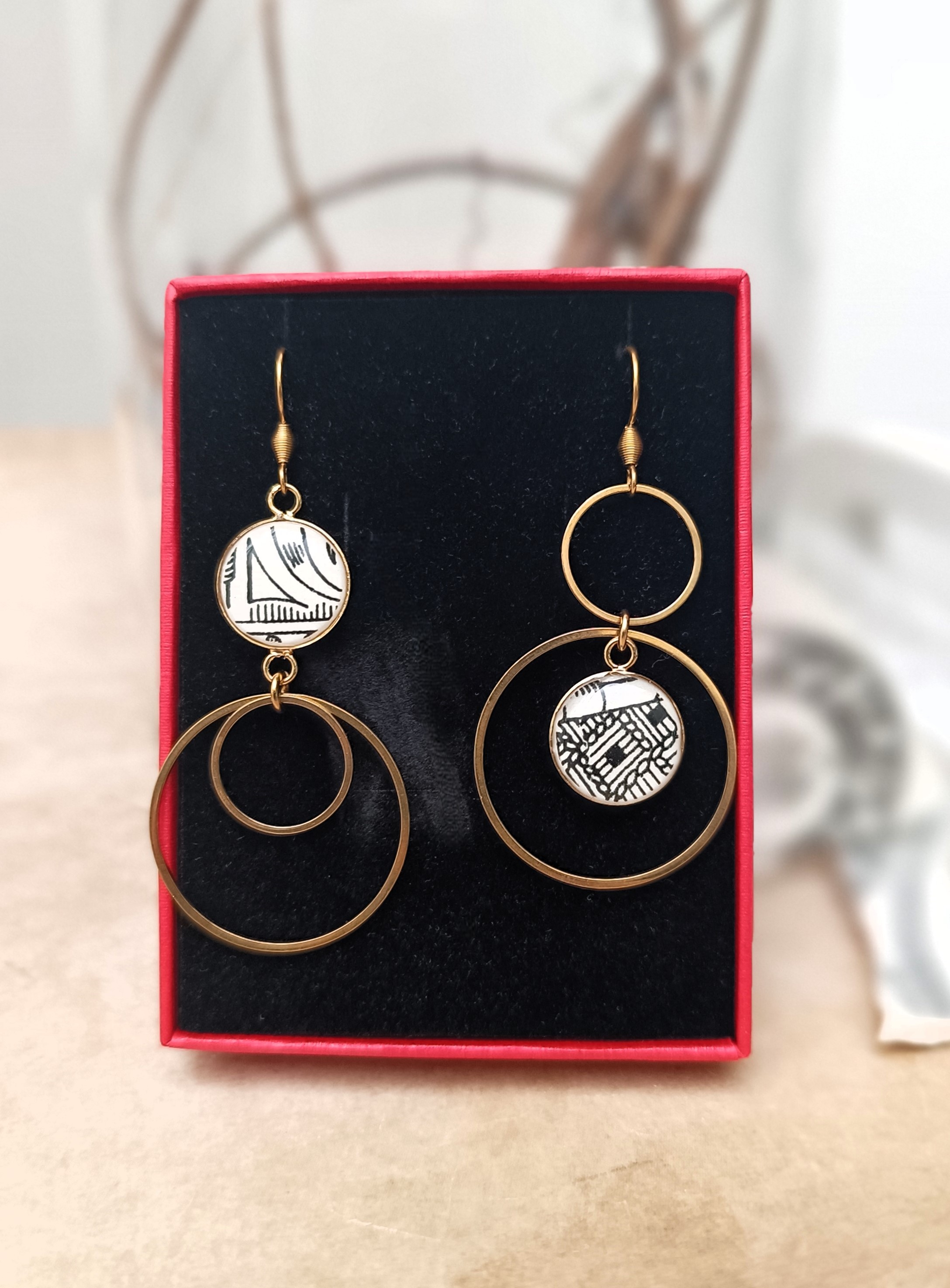 SONATE – Boucles d'oreilles asymétriques en faïence ancienne – Bijoux artisanaux français uniques