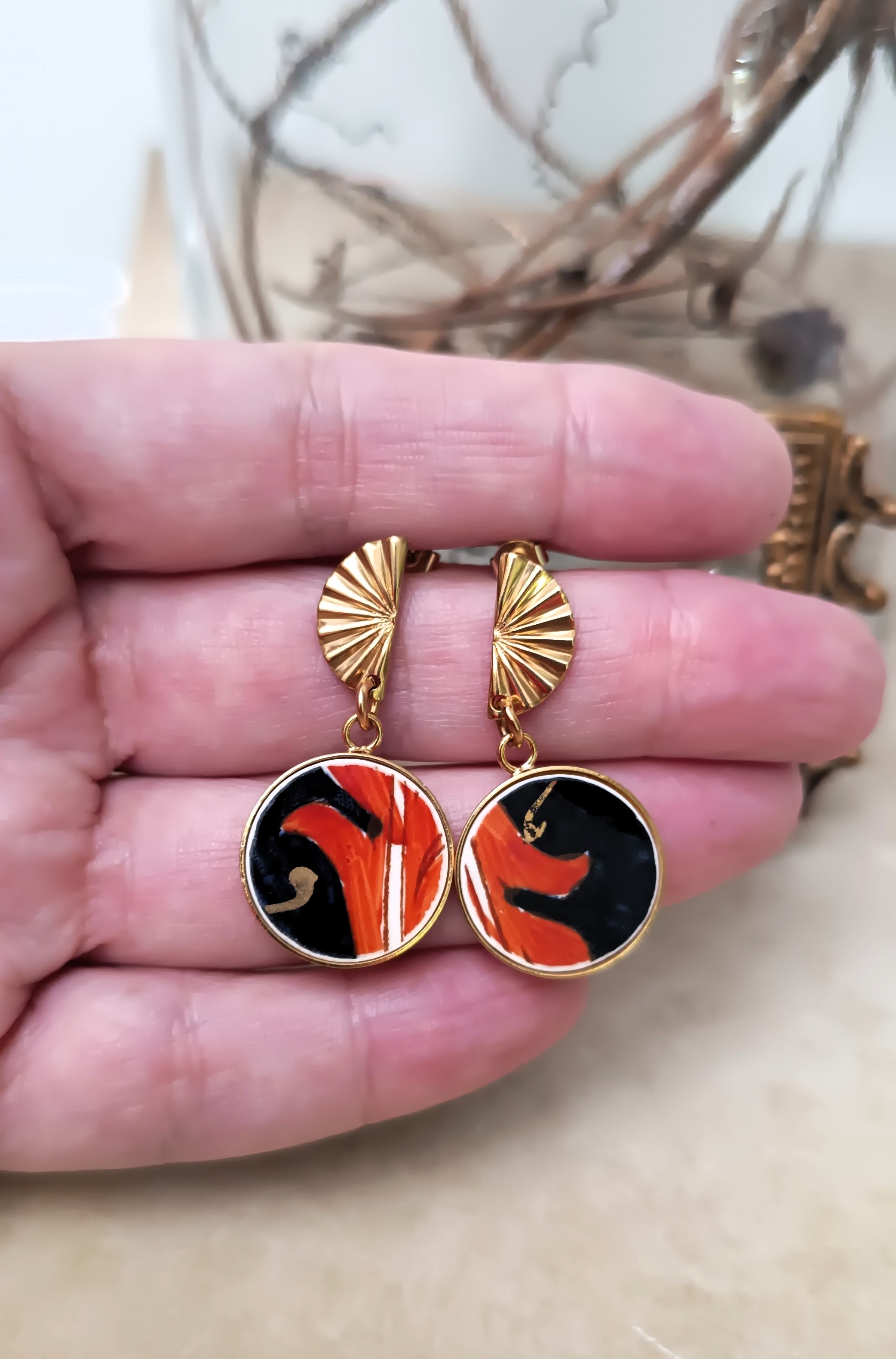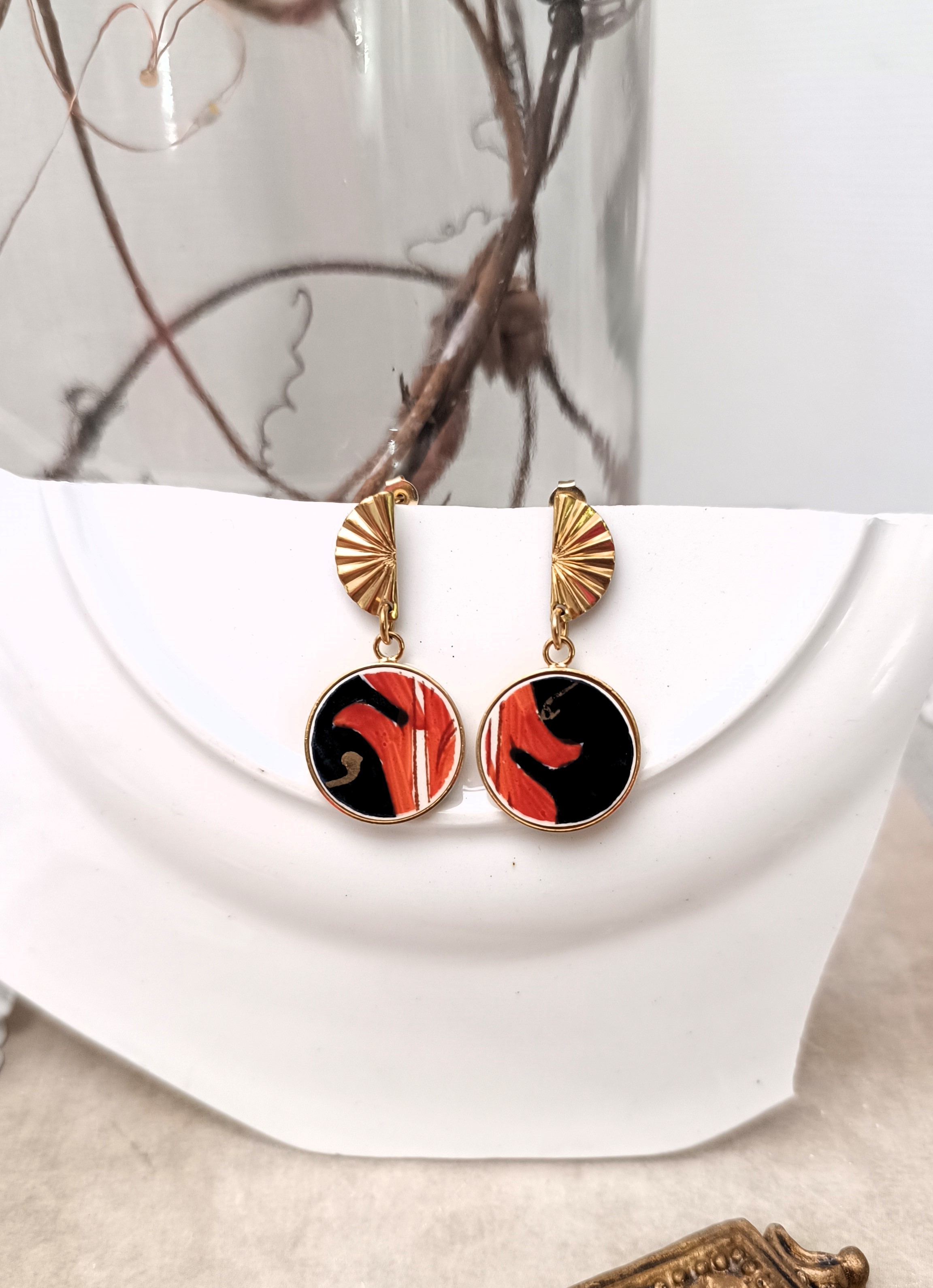 Ces boucles d’oreilles ont été façonnées à partir d’un fragment d’assiette en porcelaine vintage Royal Doulton – décor Matsumai, un modèle emblématique produit entre 1902 et 1939.