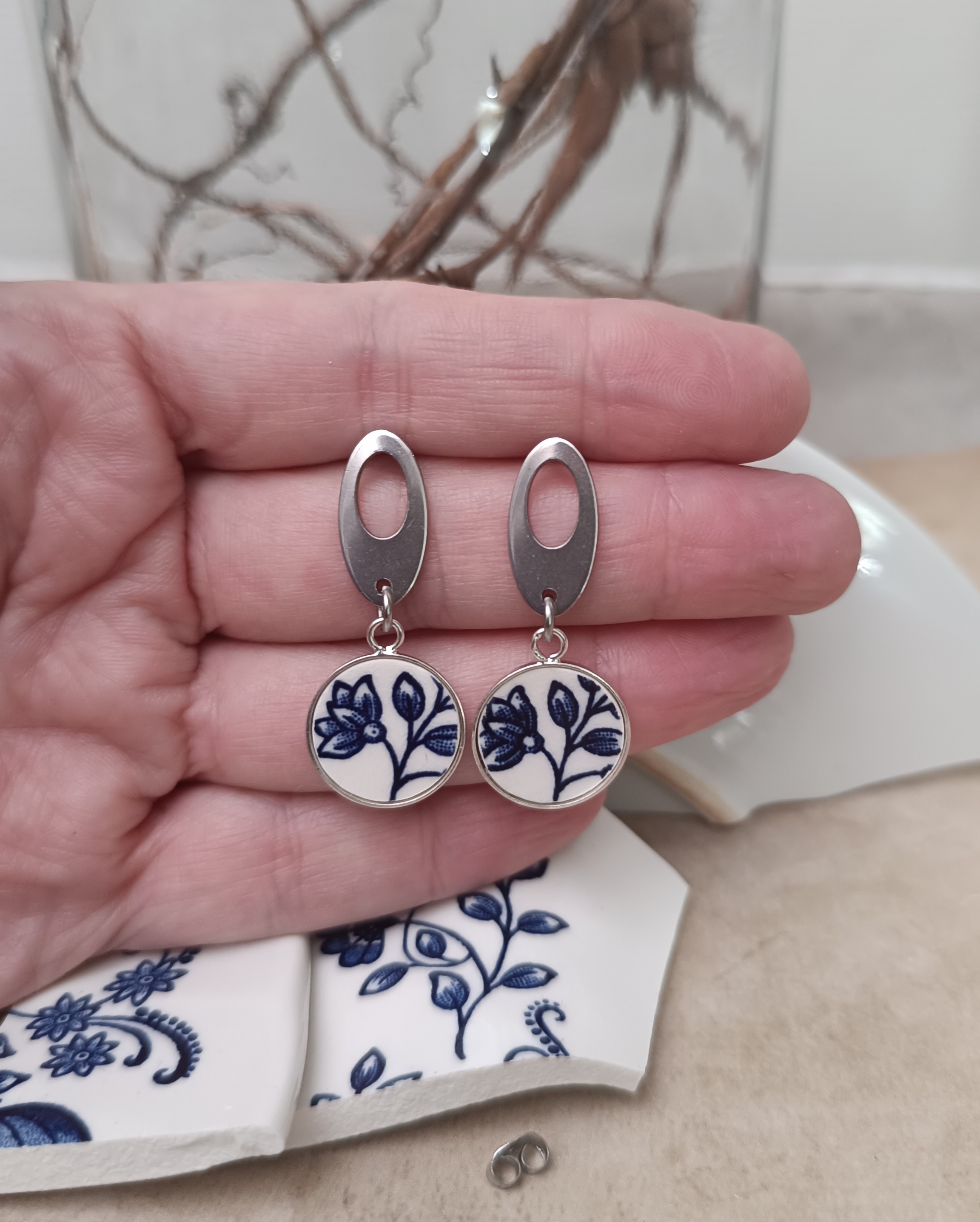 Ces boucles d’oreilles Bleu Vintage sont nées de la transformation d’un fragment de vaisselle anglaise ancienne, chinée mais malheureusement abîmée.