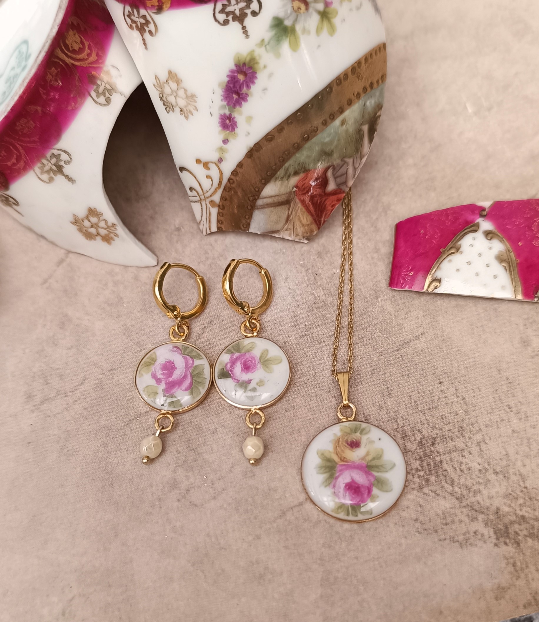 Découvrez également les boucles d’oreilles Romantika, réalisées à partir de la même vaisselle ancienne Royal Braemar, pour composer une parure romantique et harmonieuse.