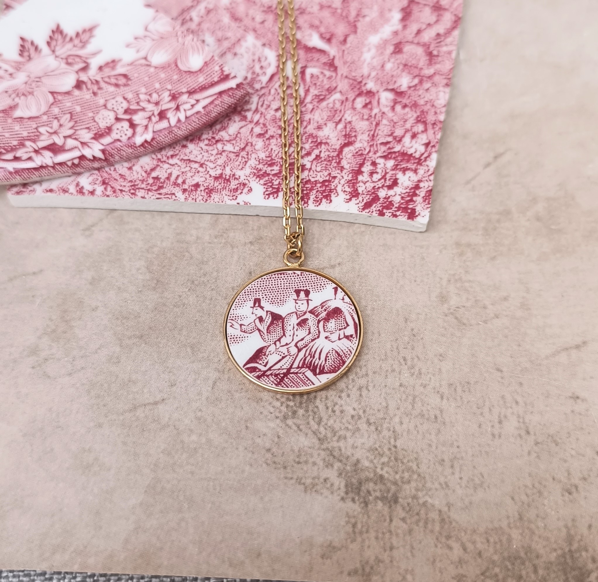 Le collier SIROPI a été façonné à la main à partir d’une assiette en porcelaine anglaise vintage, soigneusement chinée.