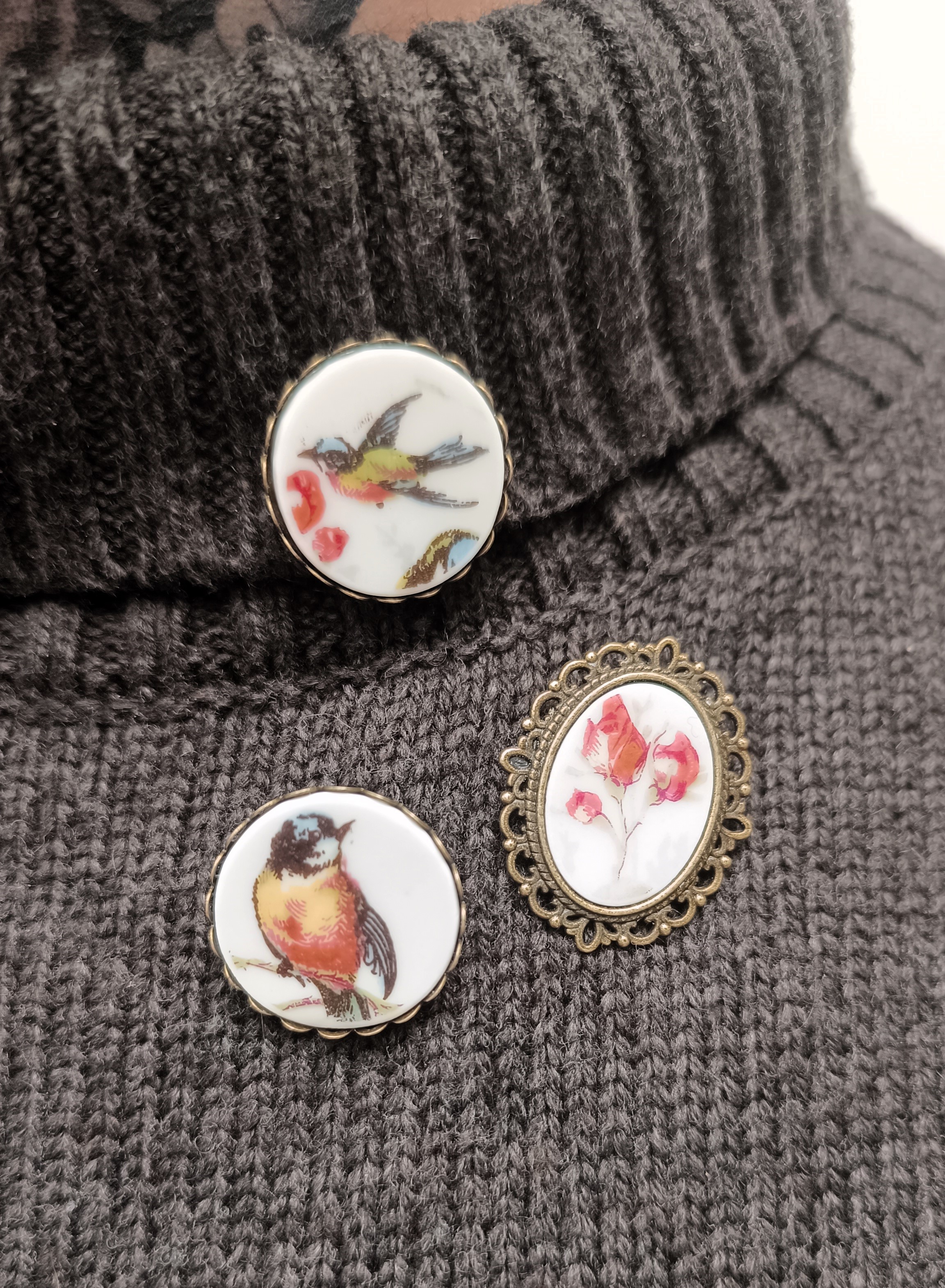 Ensemble de trois broches né de la transformation d’une assiette en porcelaine ancienne, récupérée ébréchée et sauvée de l’oubli.