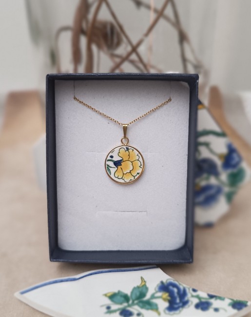 Ce pendentif rectangulaire de grand format est né de la transformation d’une assiette en porcelaine anglaise Blue Willow, un classique de la vaisselle anglaise au décor emblématique. Chaque fragment raconte une histoire : une pagode, un arbre et des paysages typiques prennent vie dans ce bijou, entre élégance et poésie.
