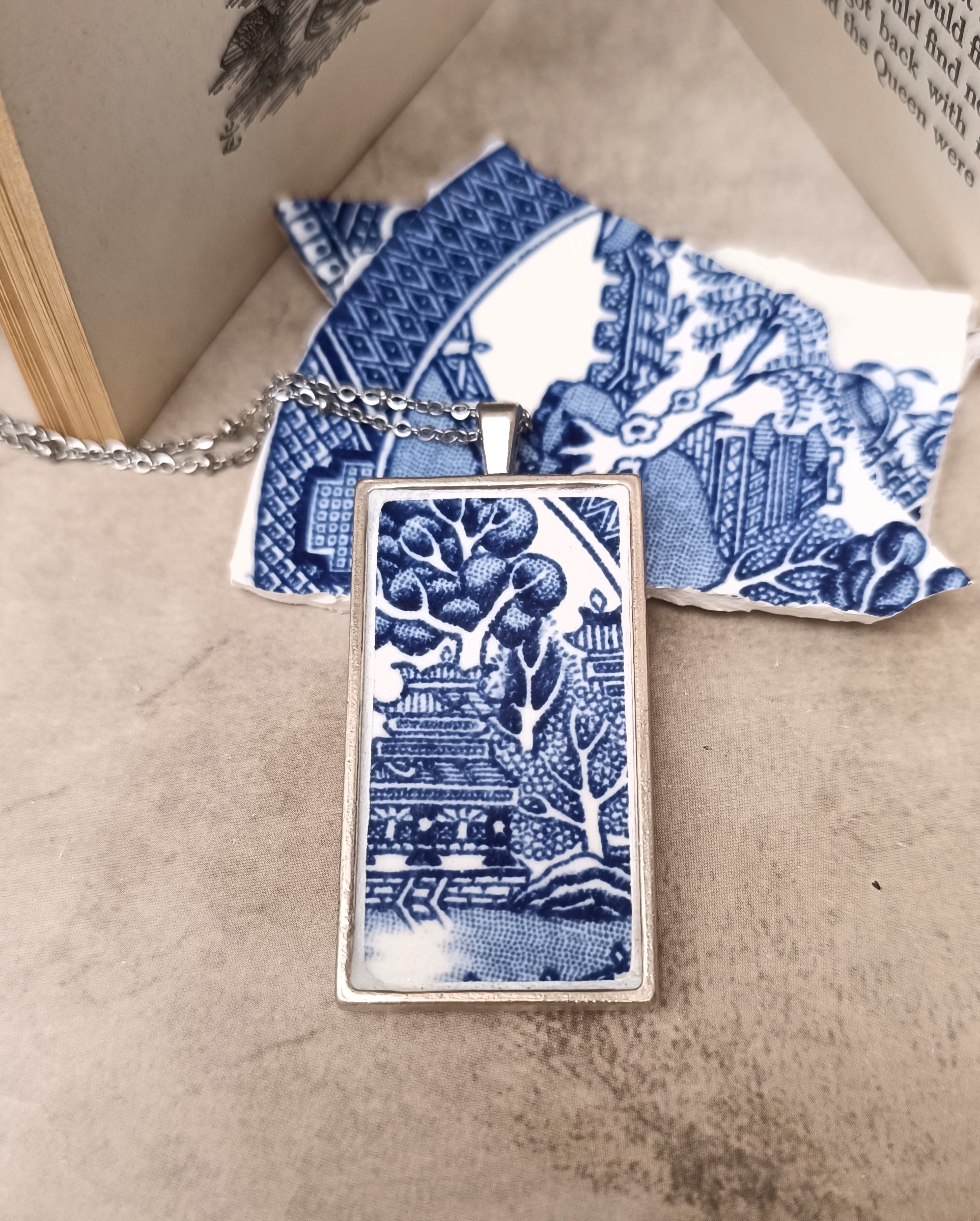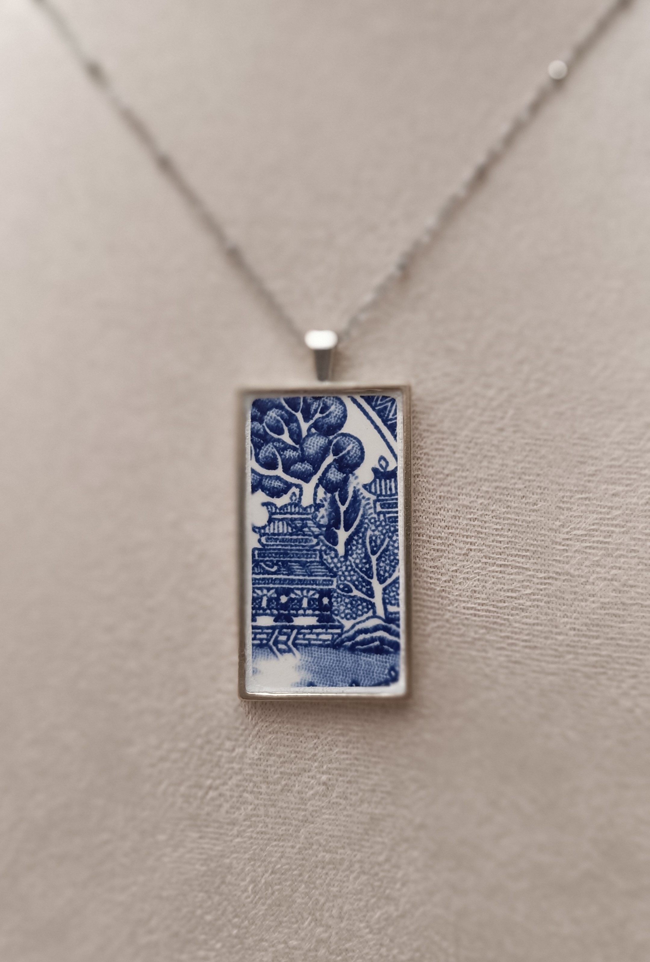 Grand pendentif Rectangulaire – Blue Willow | Bijou artisanal unique
