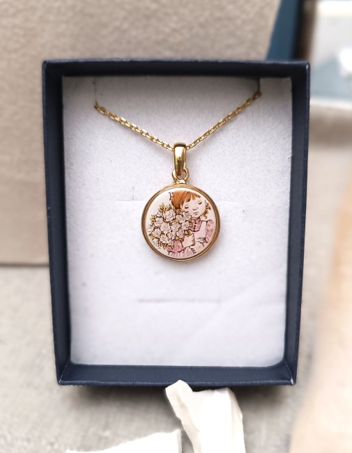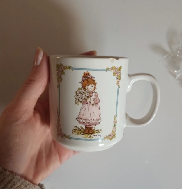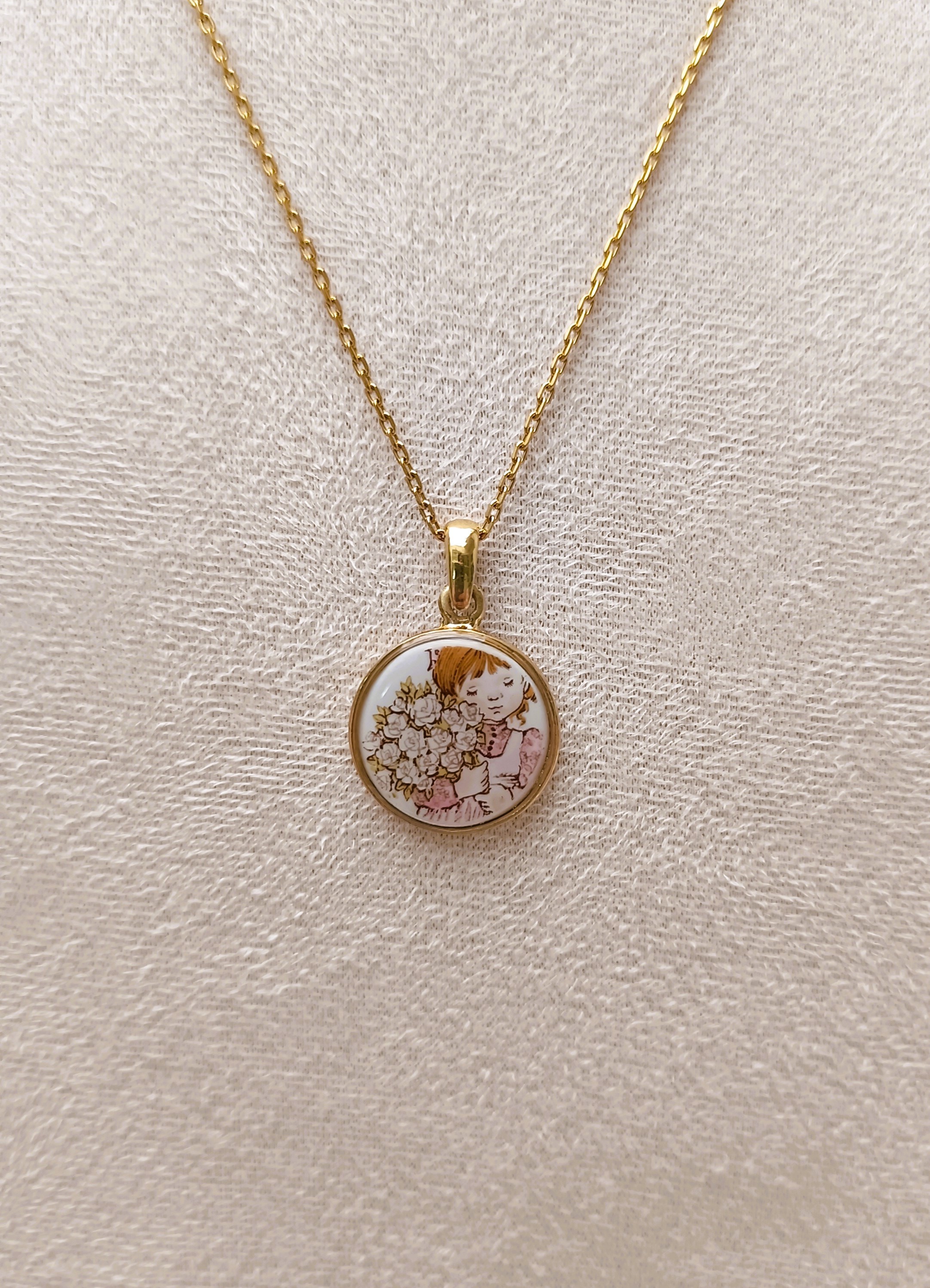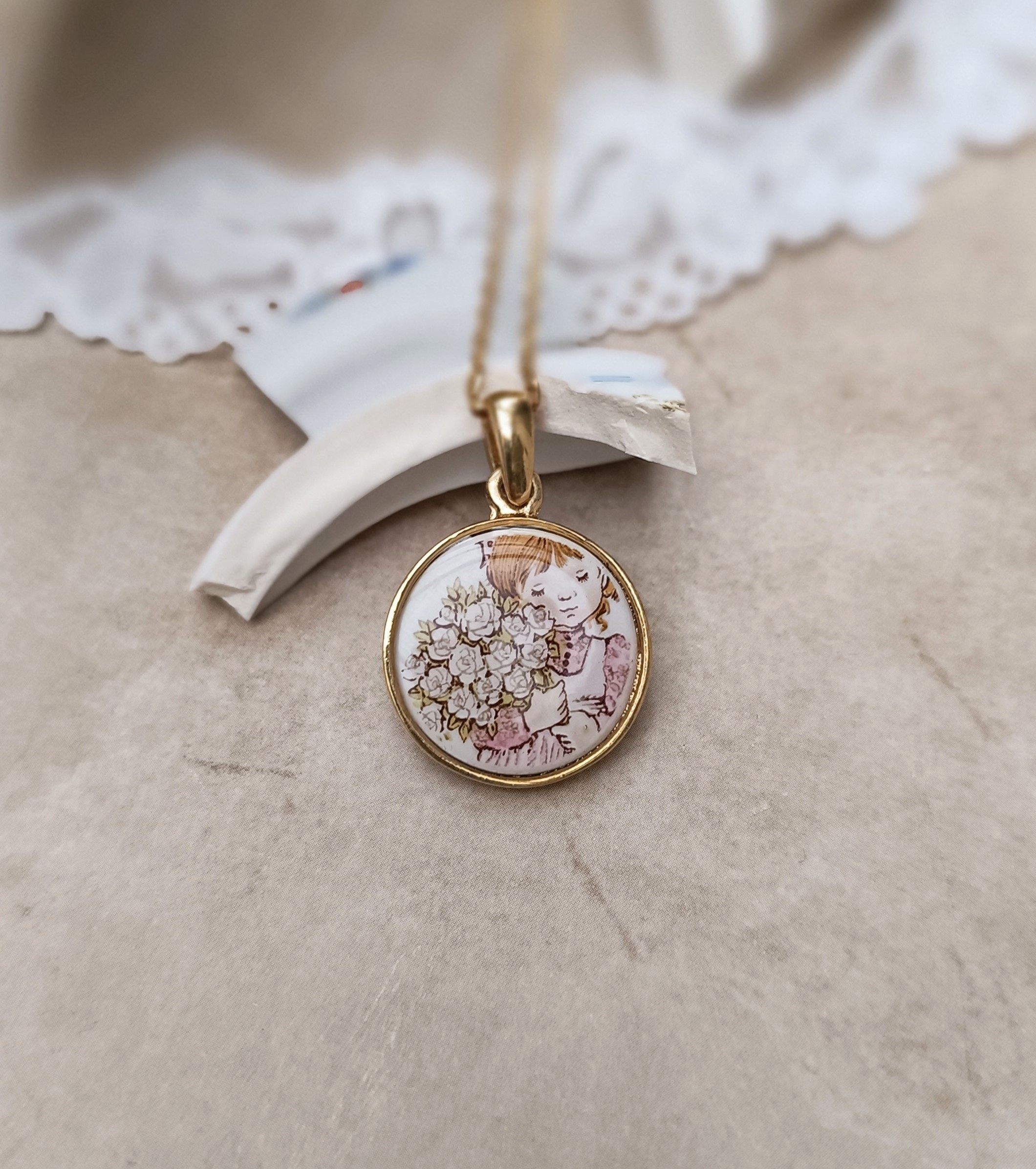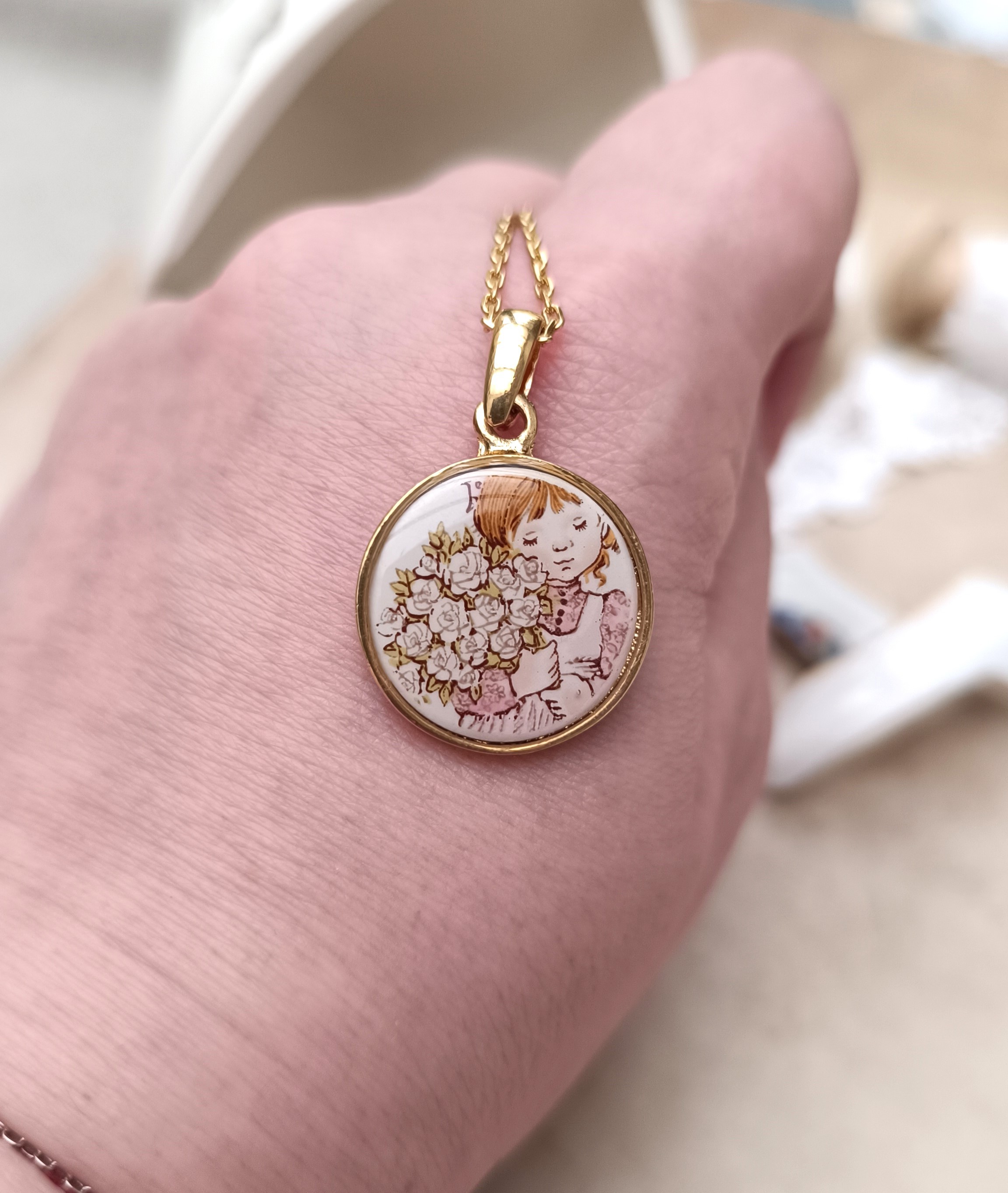 Ce collier Sarah Kay est une création artisanale unique, née de la transformation d’une tasse ébréchée en porcelaine vintage, décorée des personnages tendres et emblématiques de l’univers Sarah Kay.
