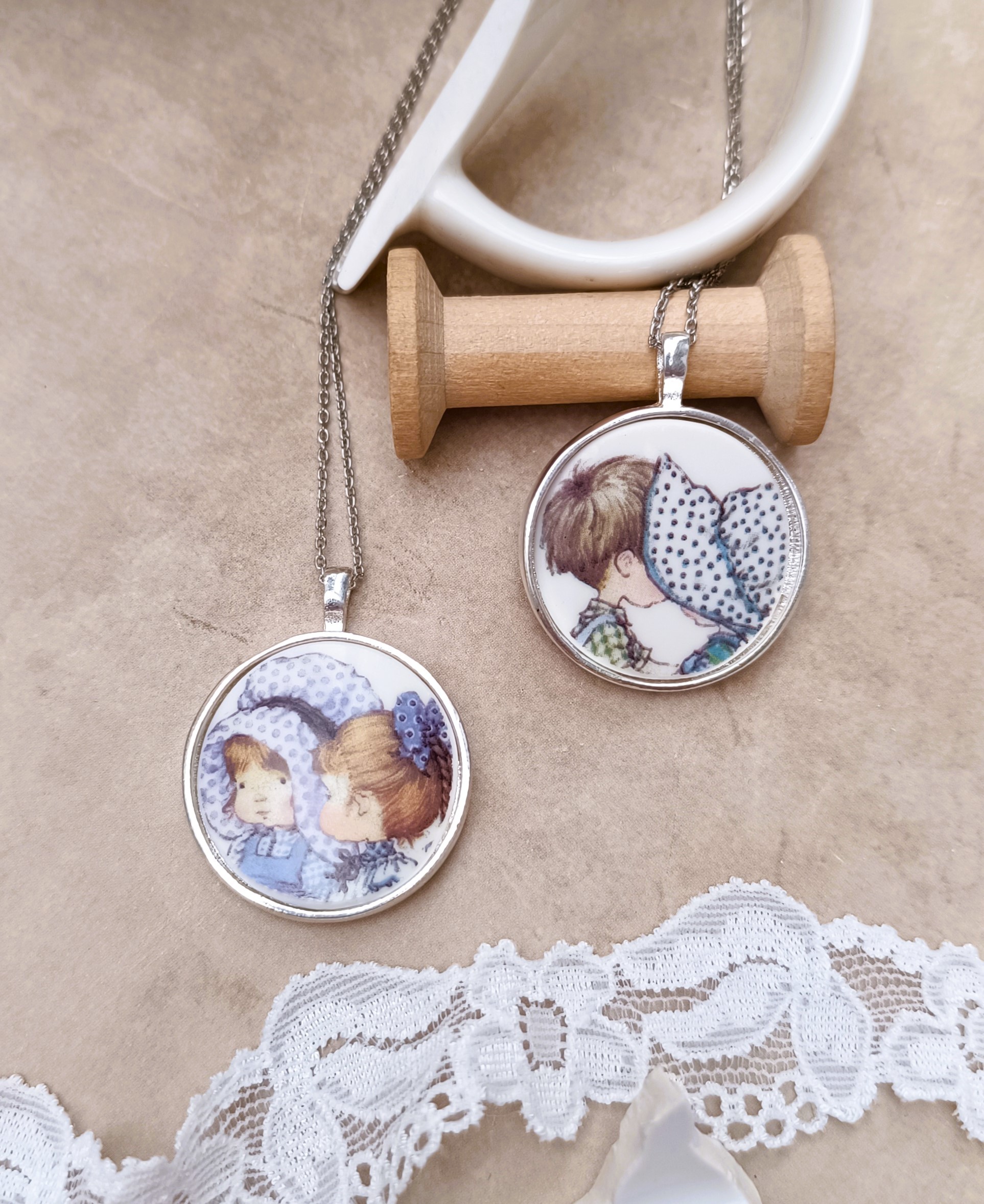 Cette commande comprend quatre colliers Sarah Kay, réalisés à partir d’une tasse vintage Sarah Kay et de fragments de dinette vintage en porcelaine, soigneusement sélectionnés puis transformés à la main dans mon atelier.