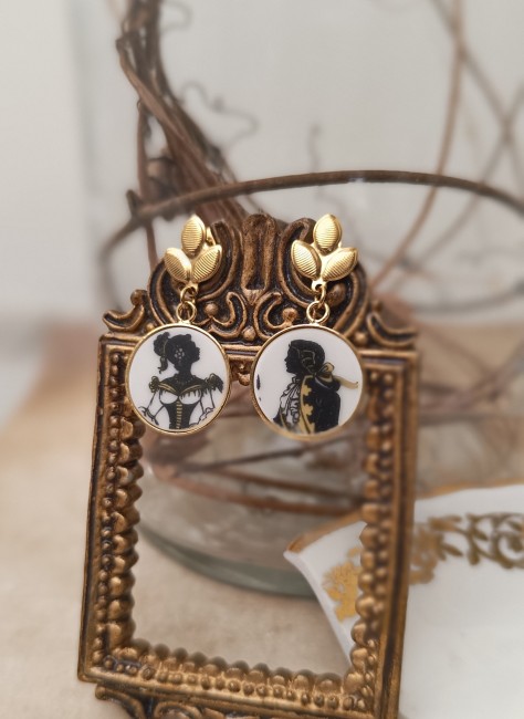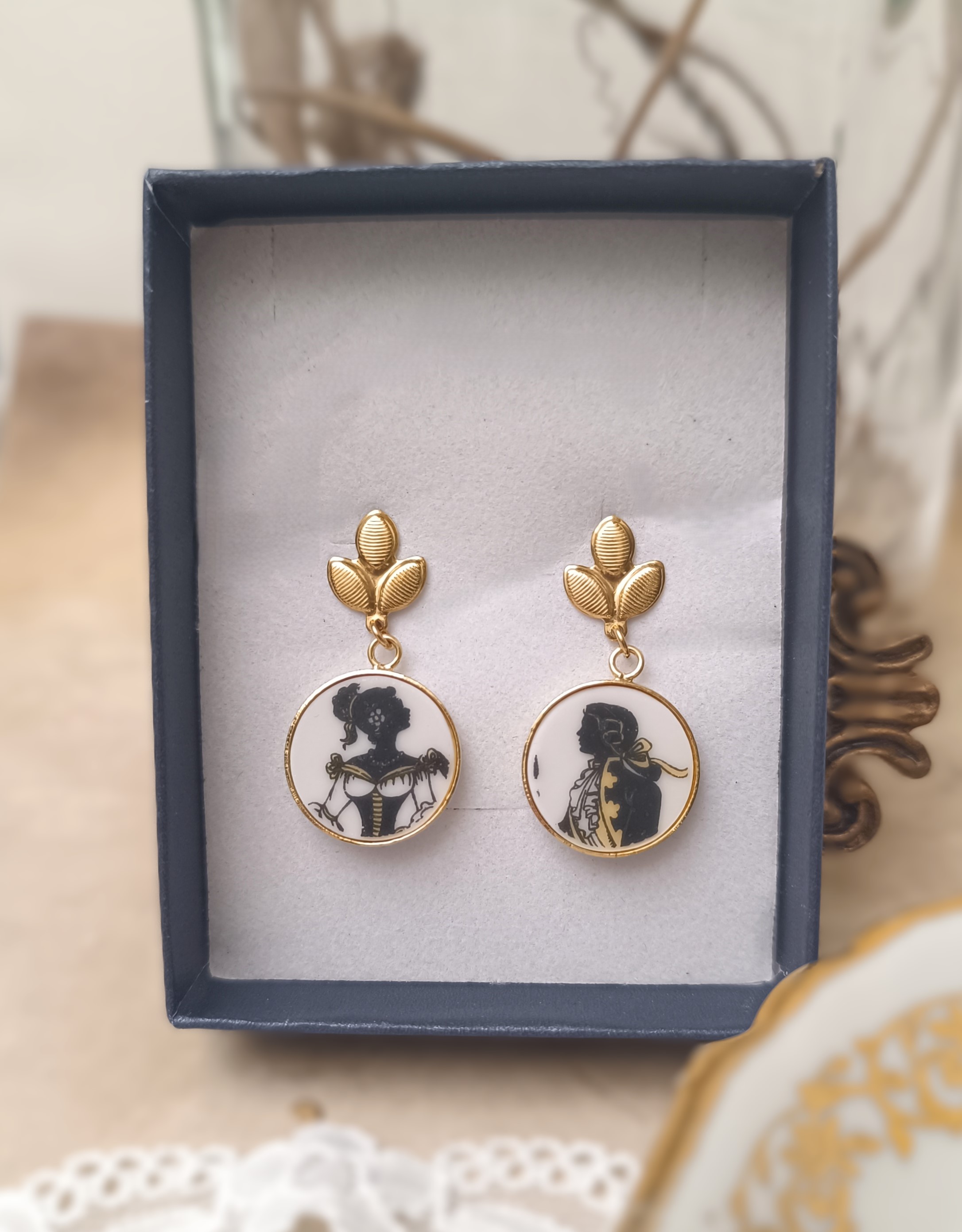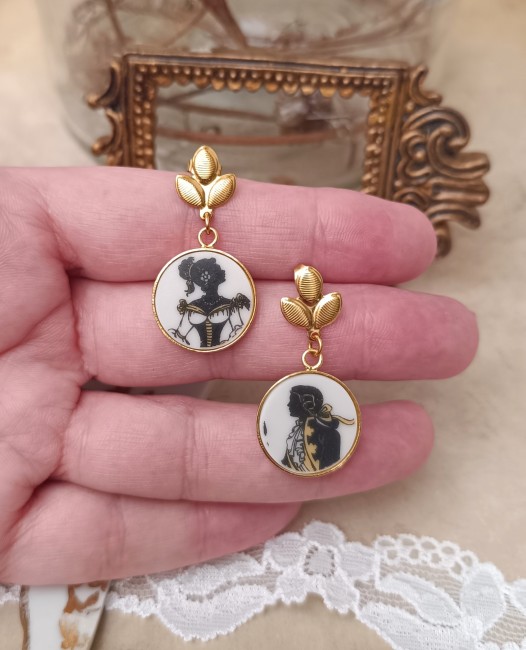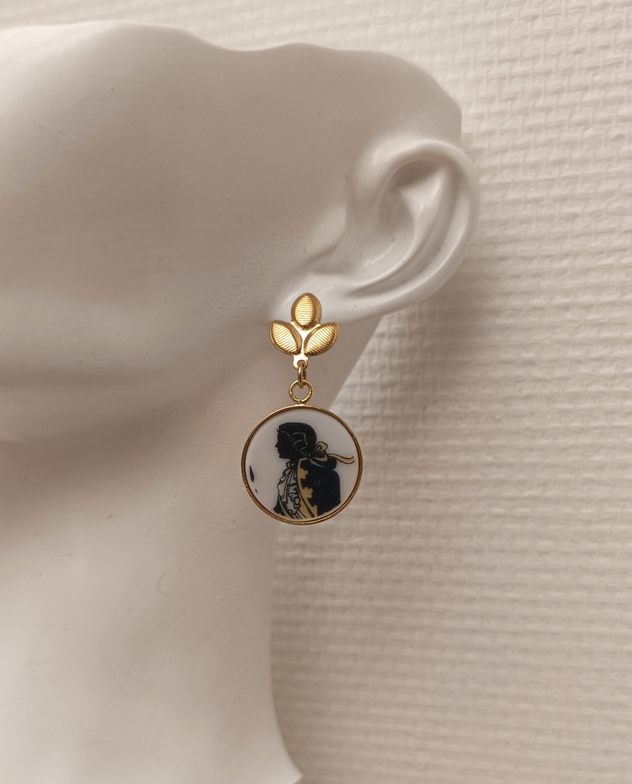 Ces boucles Carnet de bal sont nées de la transformation d’un fragment d’assiette ancienne en porcelaine de Limoges, volontairement sauvée d’un destin d’oubli.
