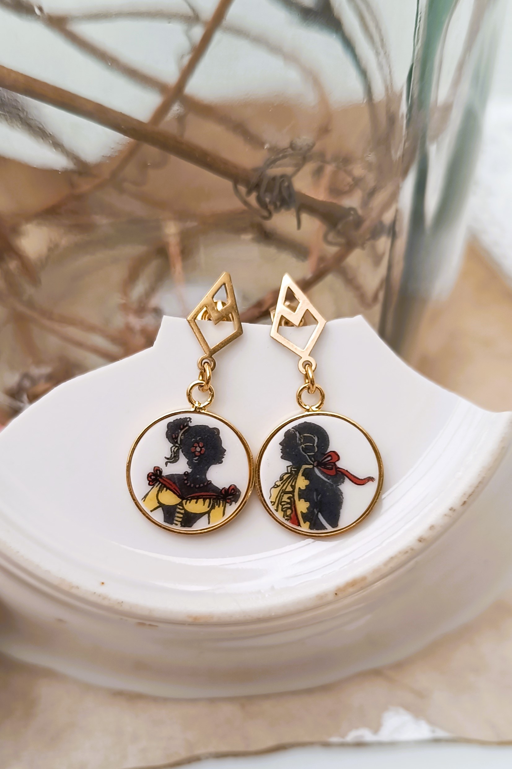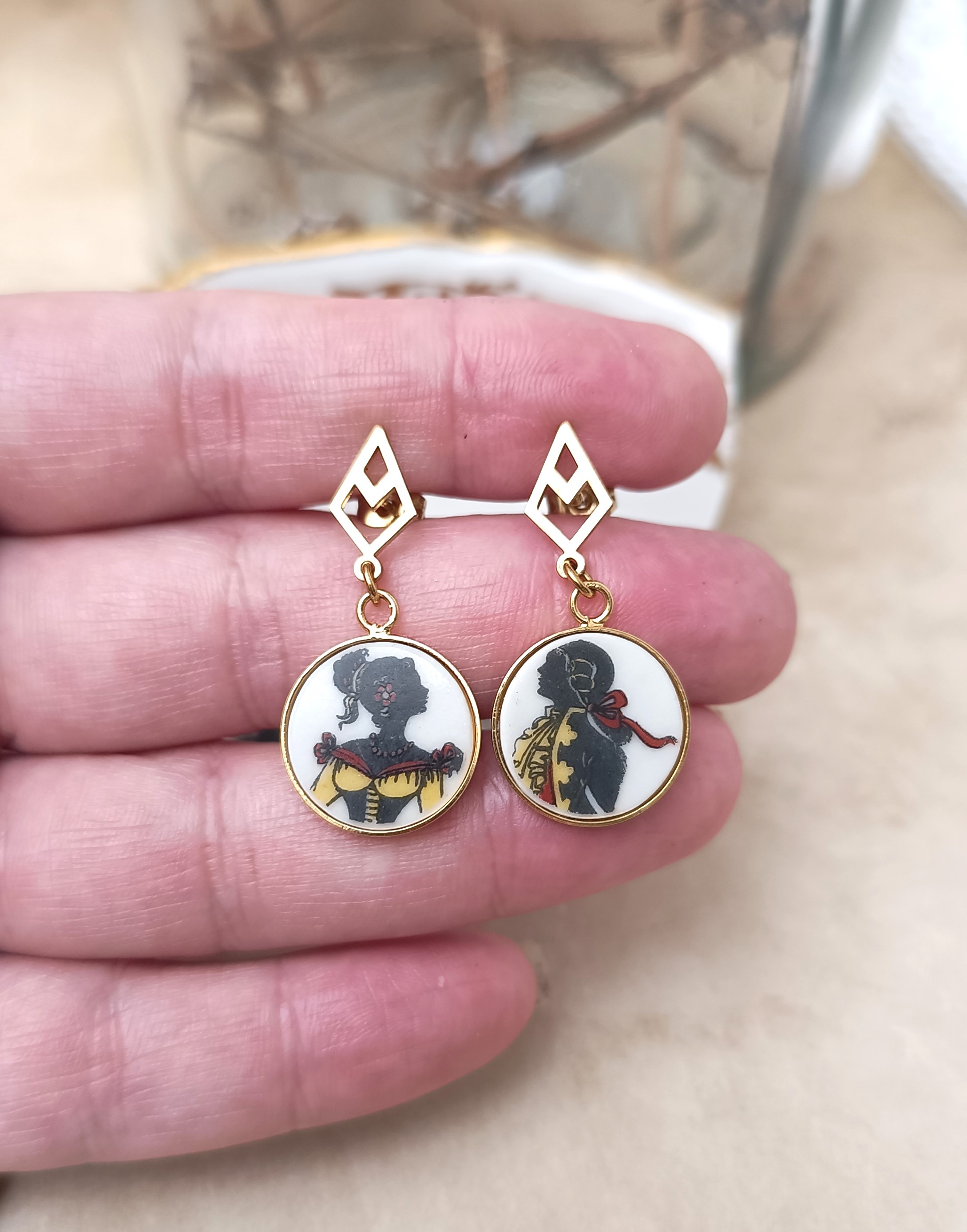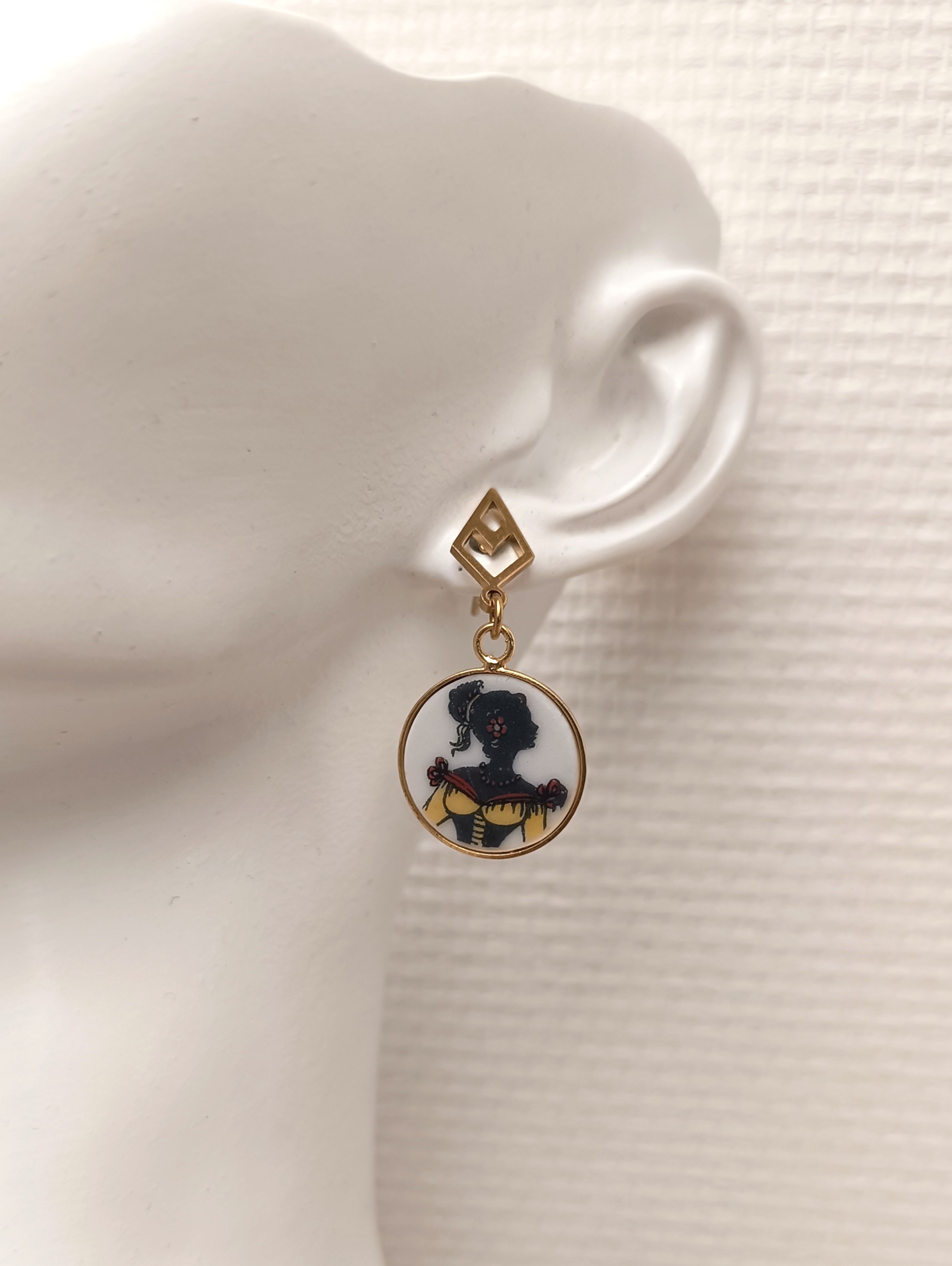 Ces boucles Carnet de bal sont nées de la transformation d’un fragment d’assiette ancienne en porcelaine de Limoges, volontairement sauvée d’un destin d’oubli.