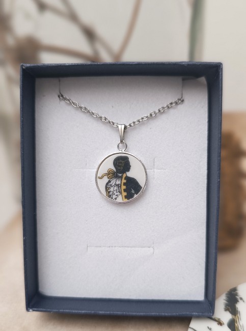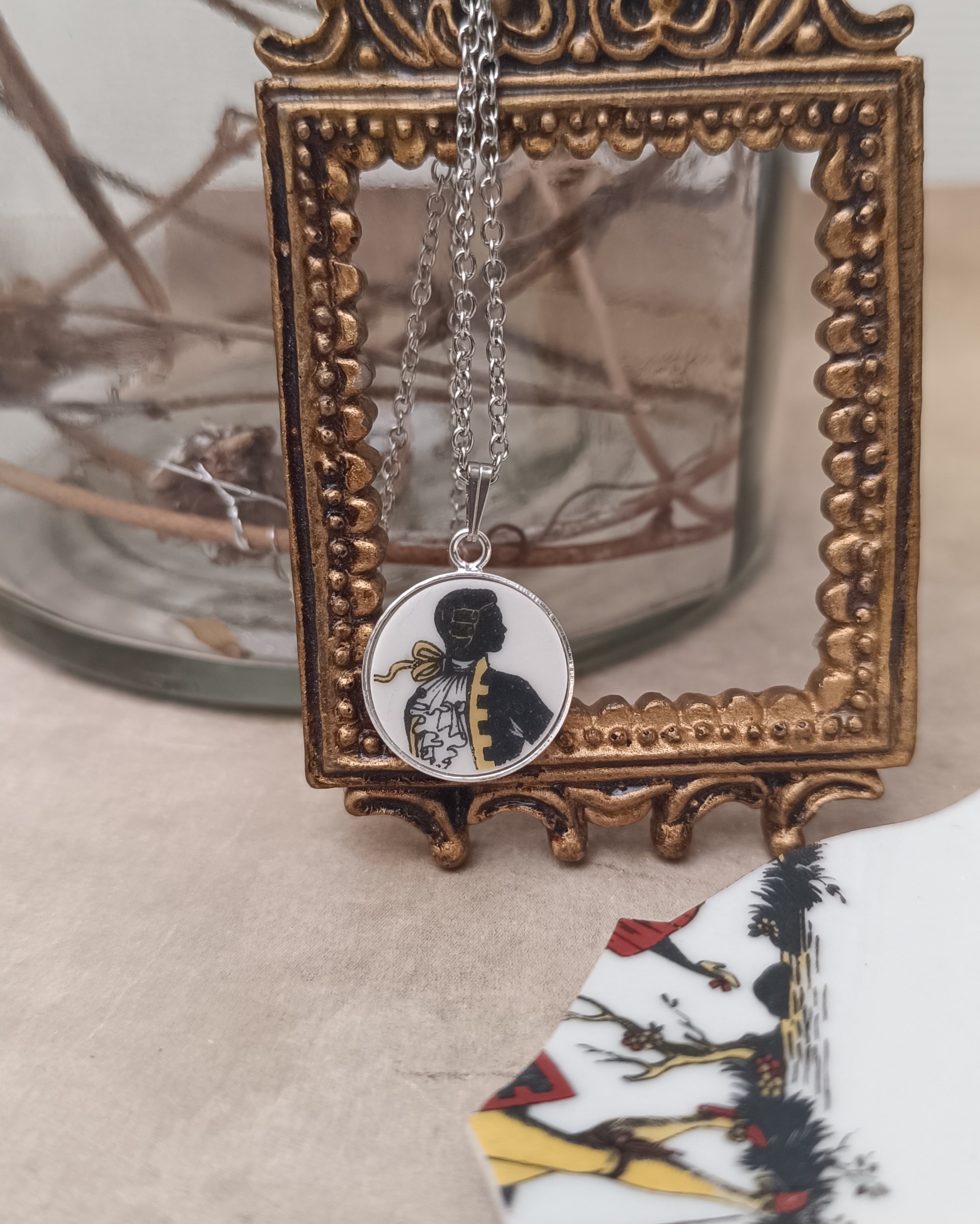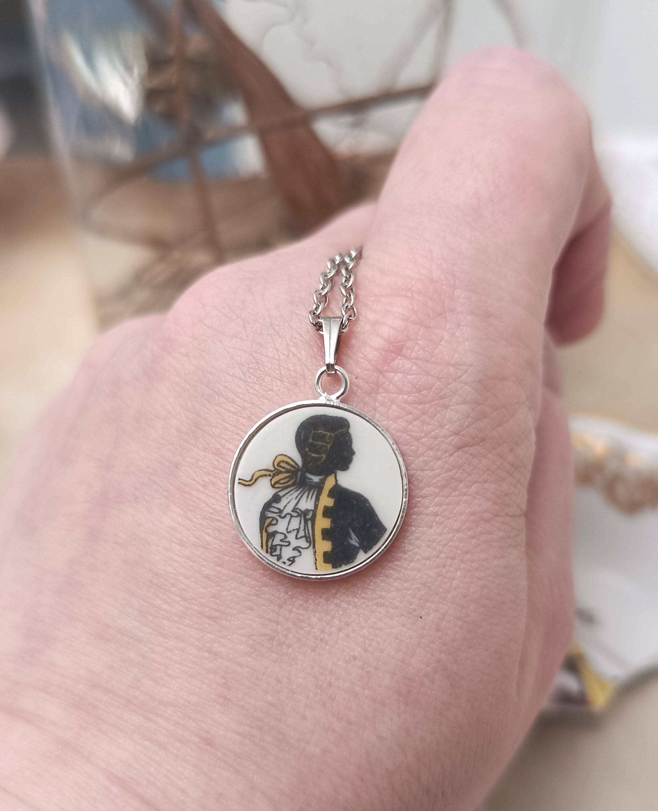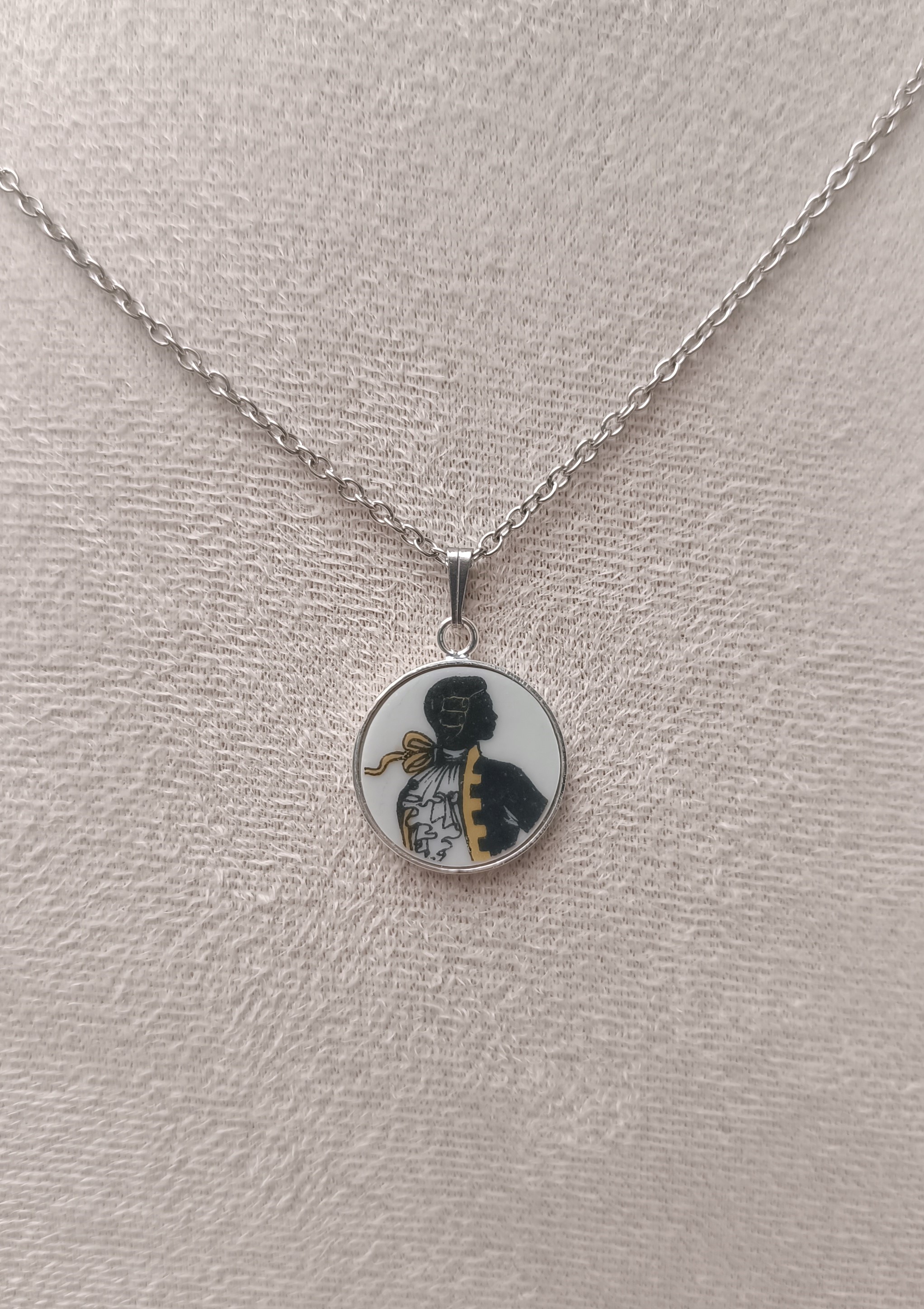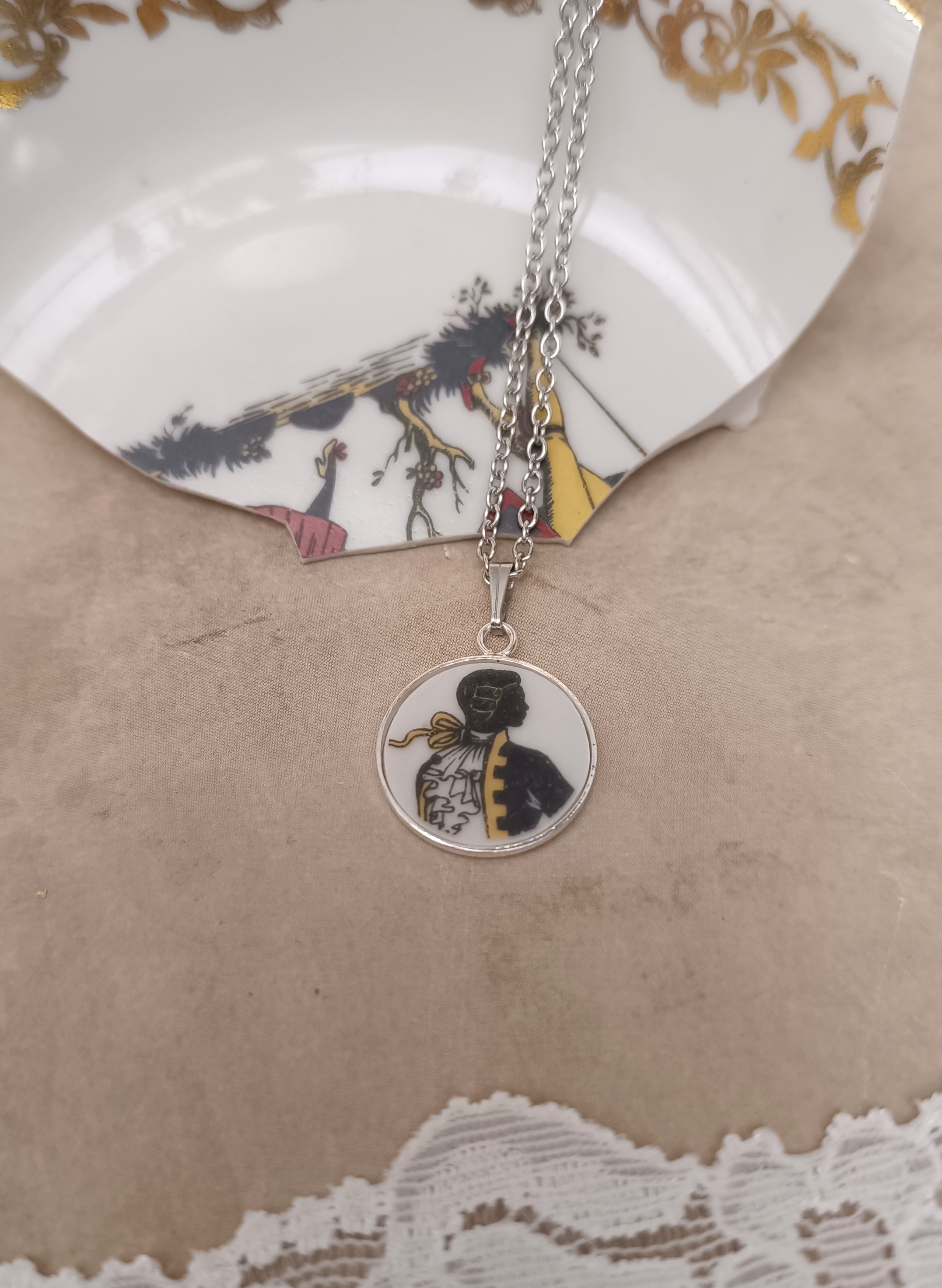 Ce pendentif Le marquis est né de la transformation d’un fragment d’assiette ancienne en porcelaine de Limoges, volontairement sauvée d’un destin d’oubli.
