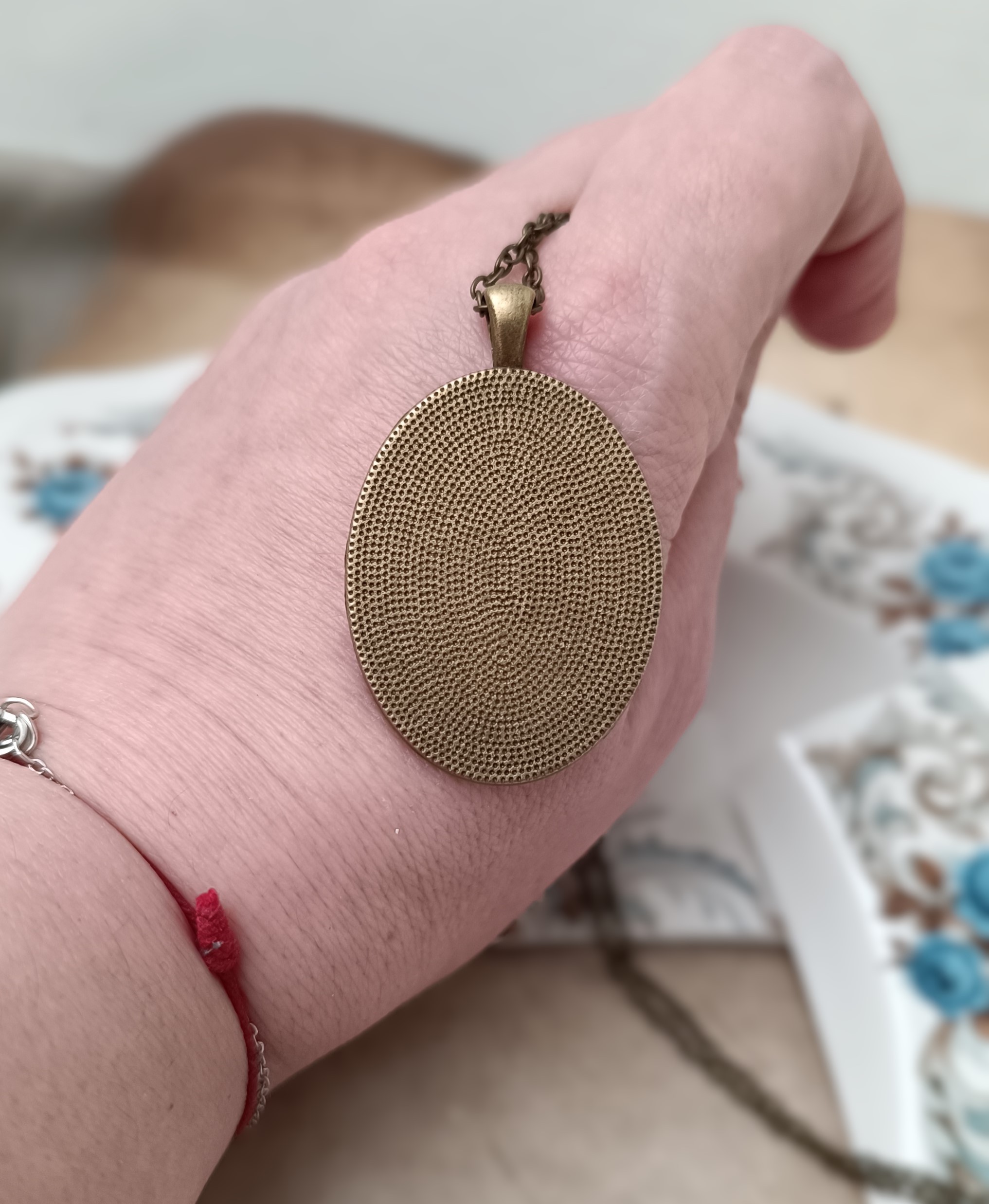 • Chaîne : laiton finition antique – 55 cm (modifiable sur demande)