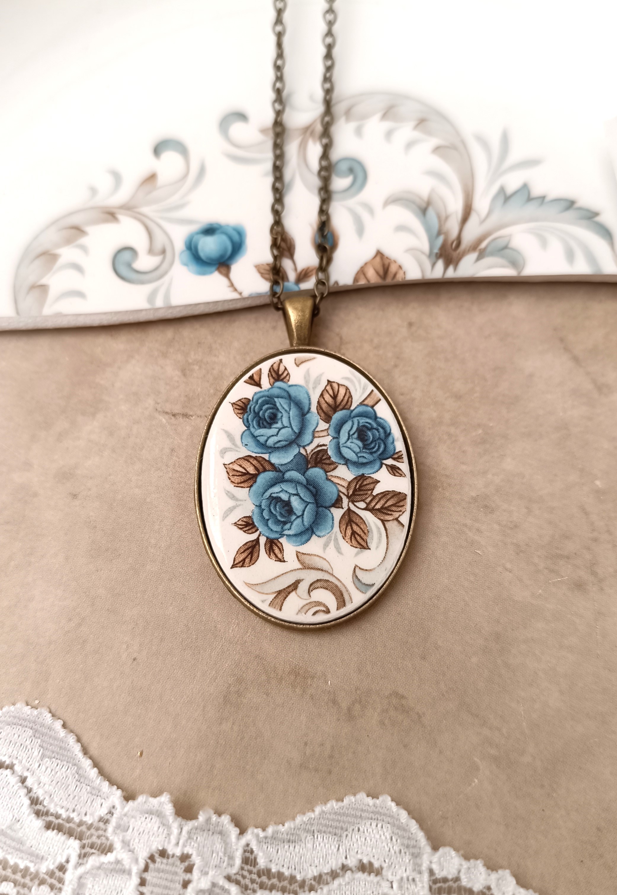 Collier Idylle – Faïence ancienne Moulin des Loups – Roses bleues