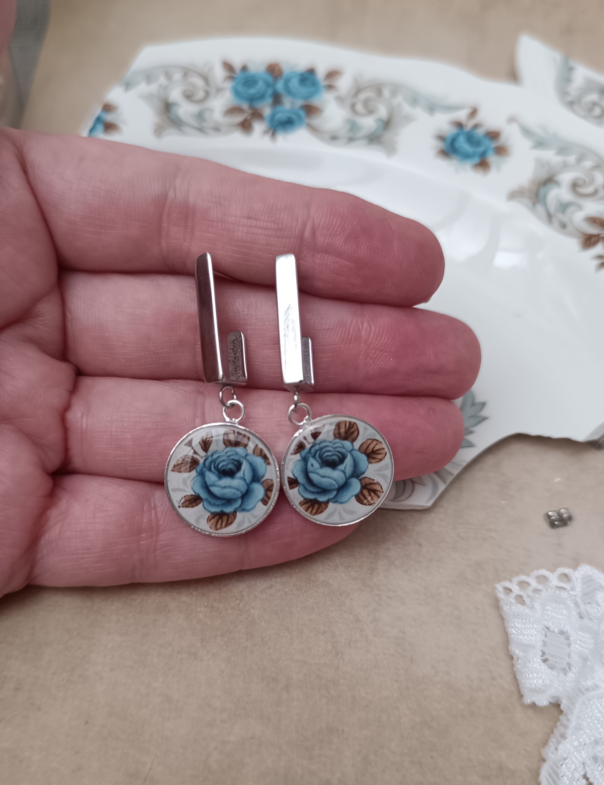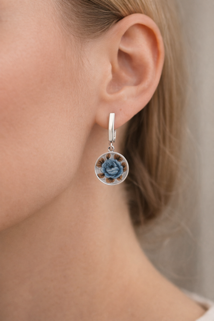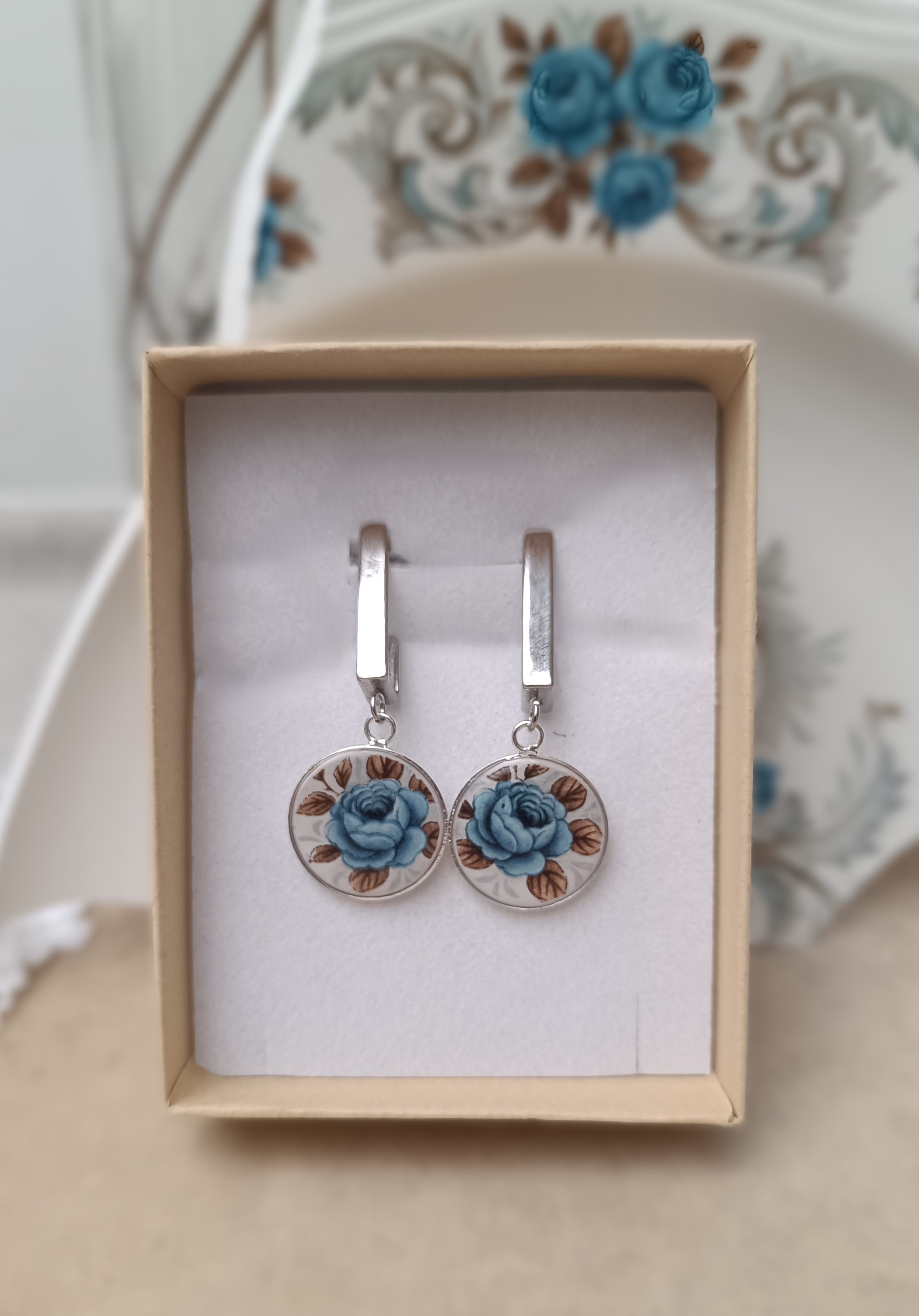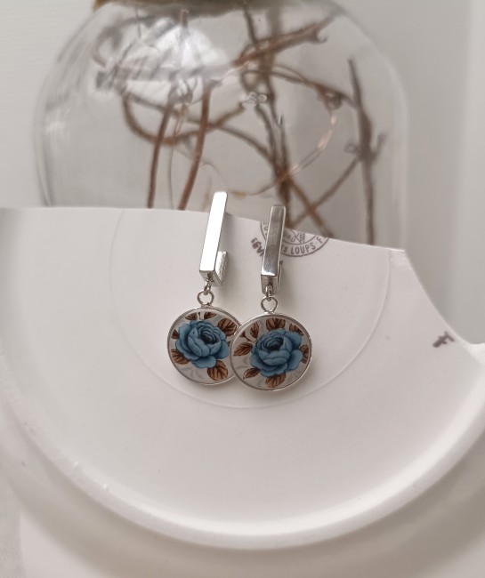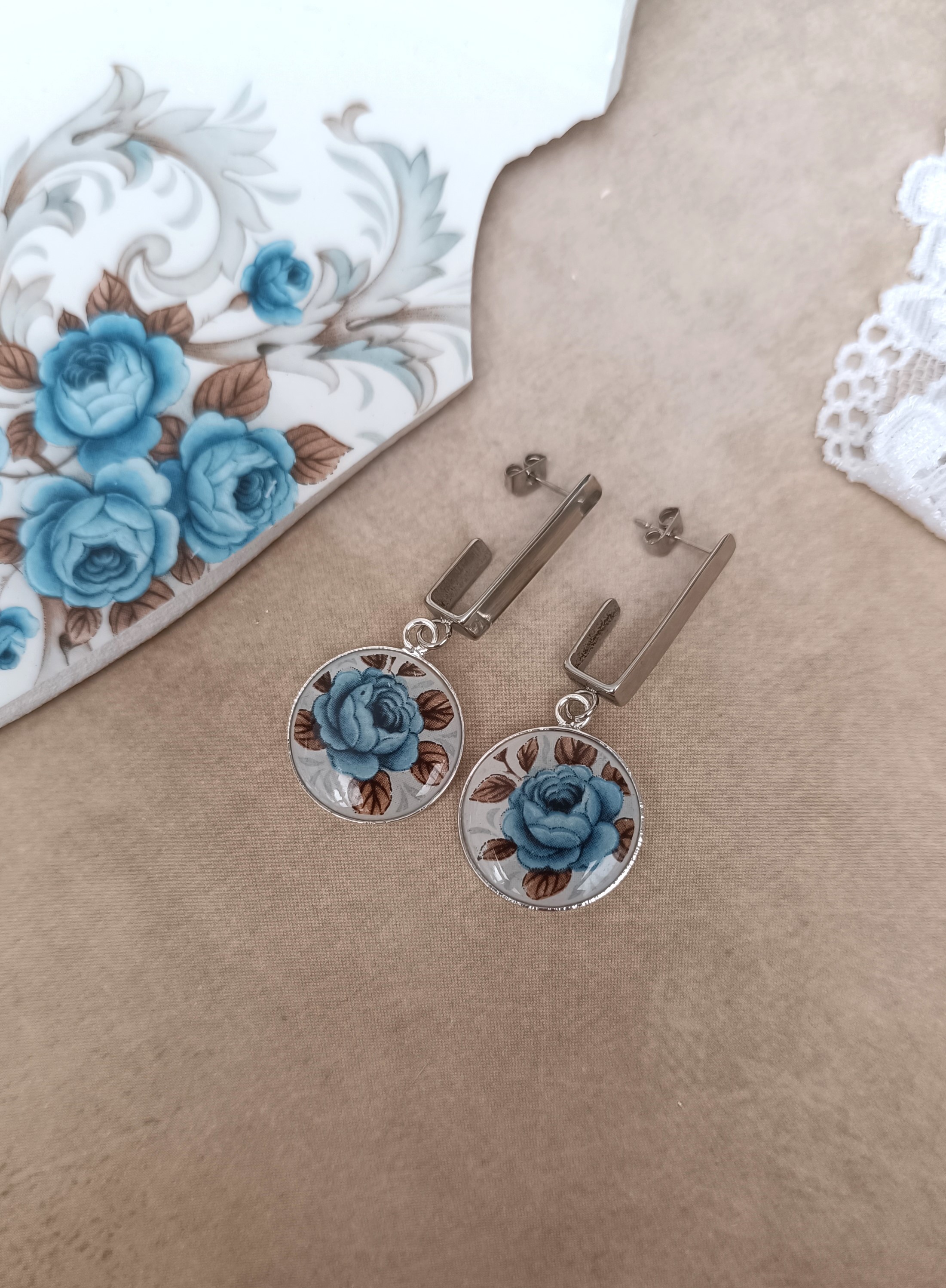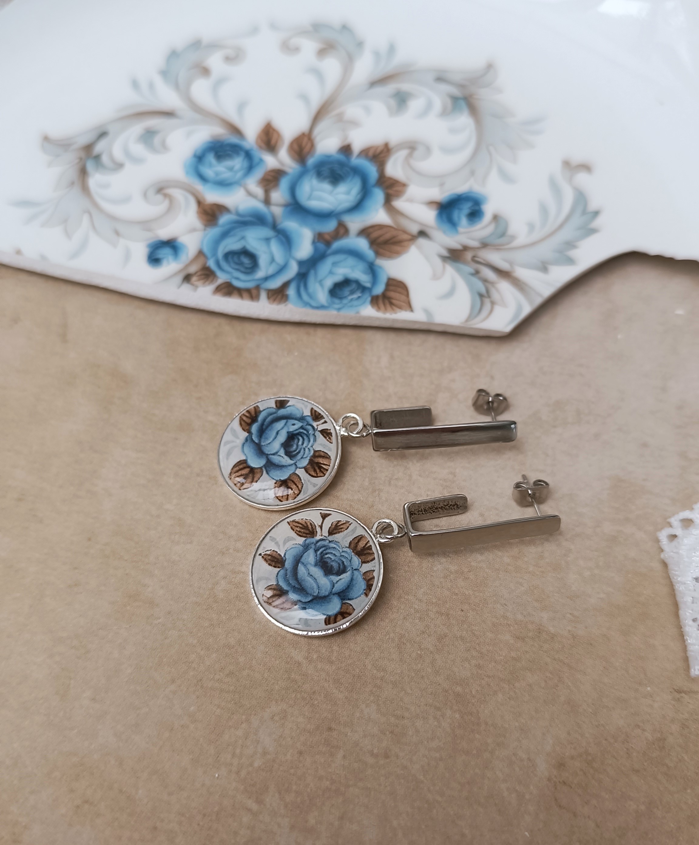 Ces boucles d’oreilles Idylle sont nées de la transformation d’une assiette ancienne en faïence Moulin des Loups, célèbre pour ses roses bleues délicates. Chaque fragment est soigneusement façonné à la main dans mon atelier à Calais, révélant le motif original avec élégance et raffinement.