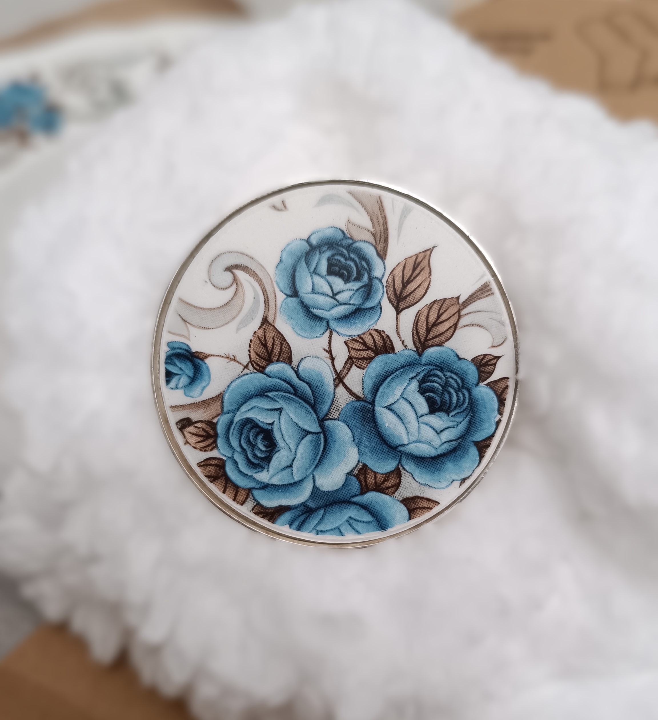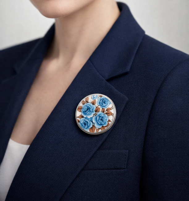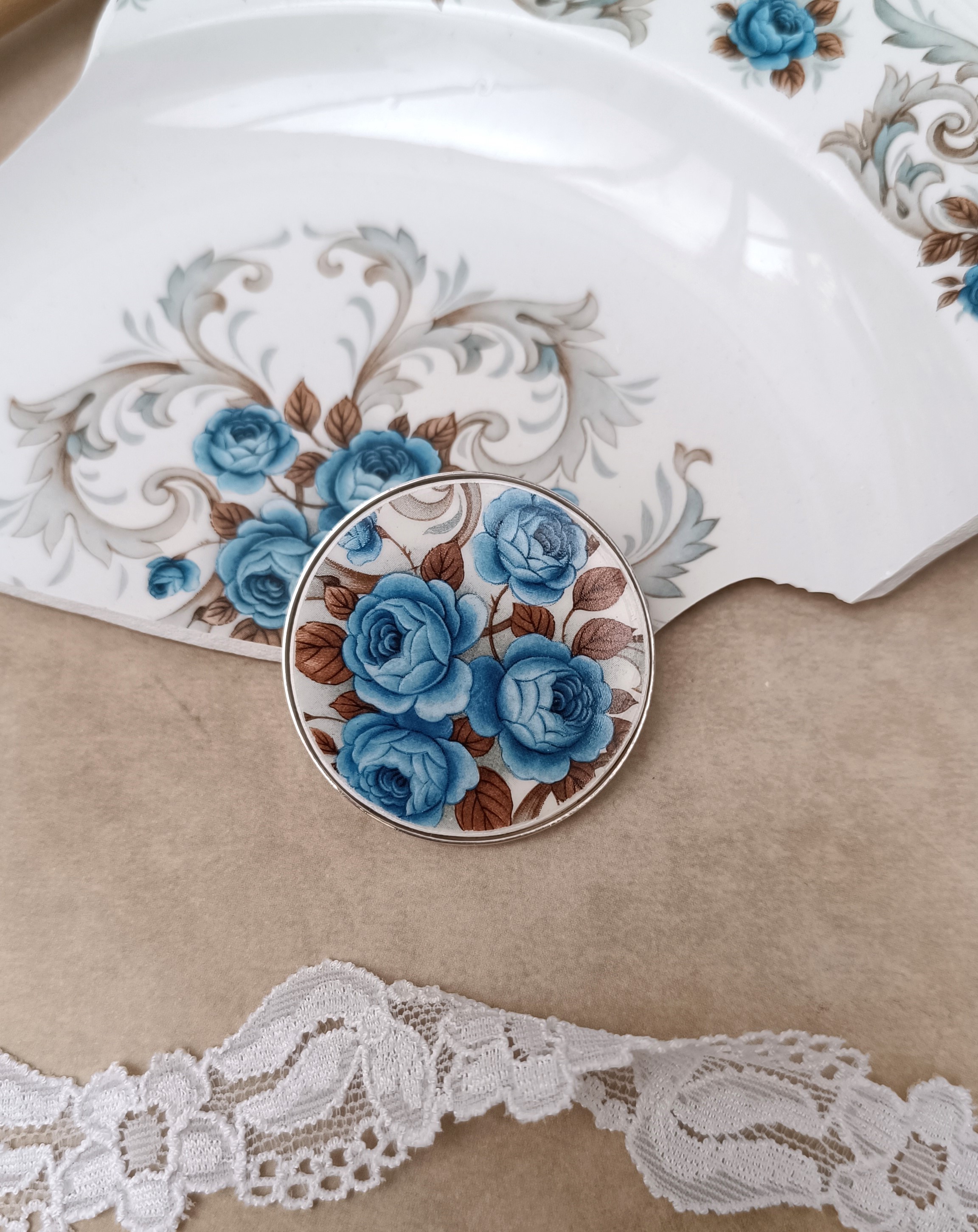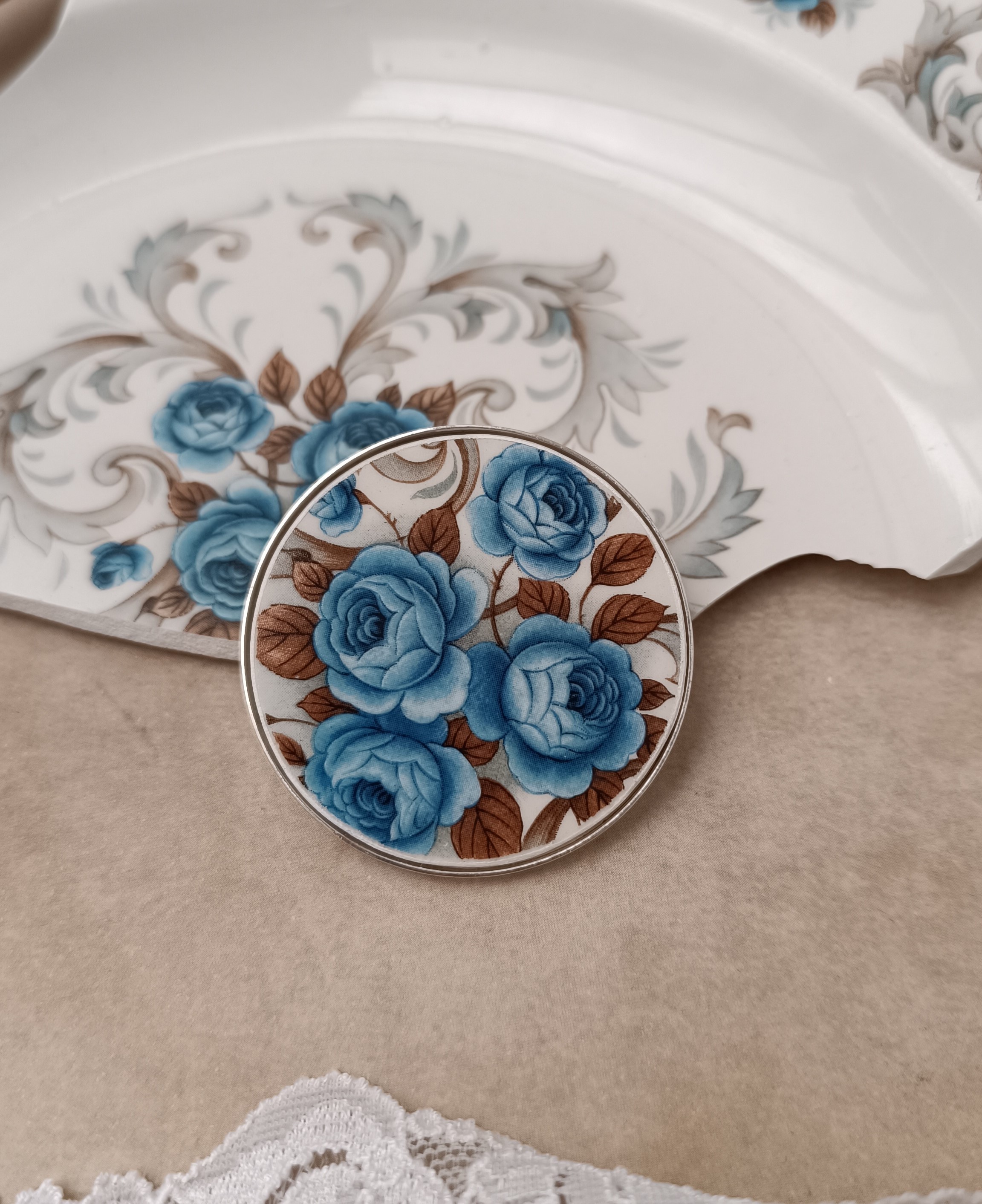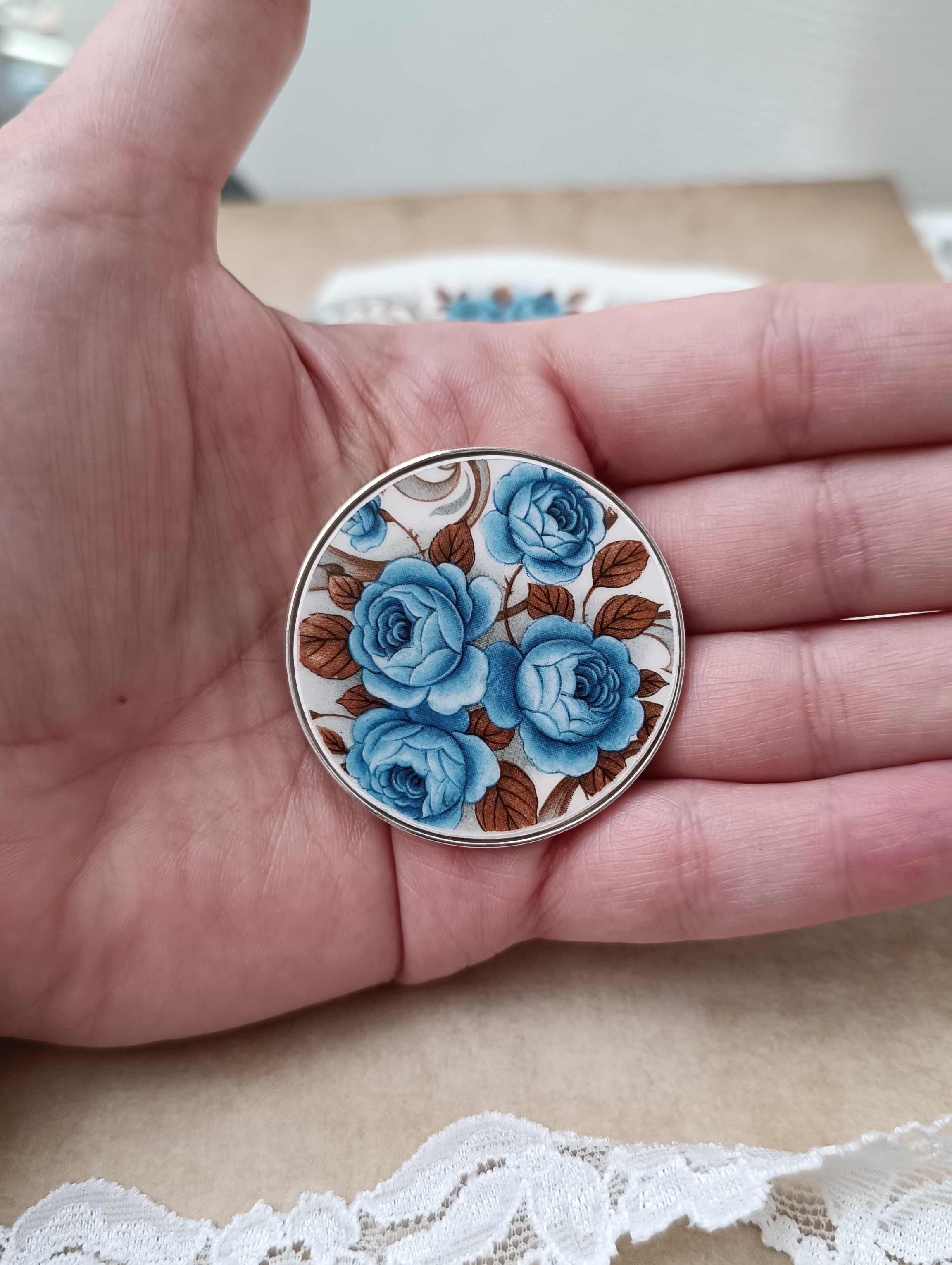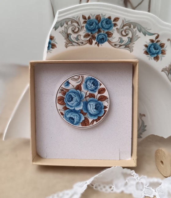 Cette broche Idylle est née de la transformation d’un fragment d’assiette ancienne en faïence Moulin des Loups. Le motif romantique de fleurs bleues est mis en valeur sur un grand support rond de 45 mm, offrant un bijou unique, pensé pour être porté seul ou comme pièce maîtresse d’une tenue élégante.
