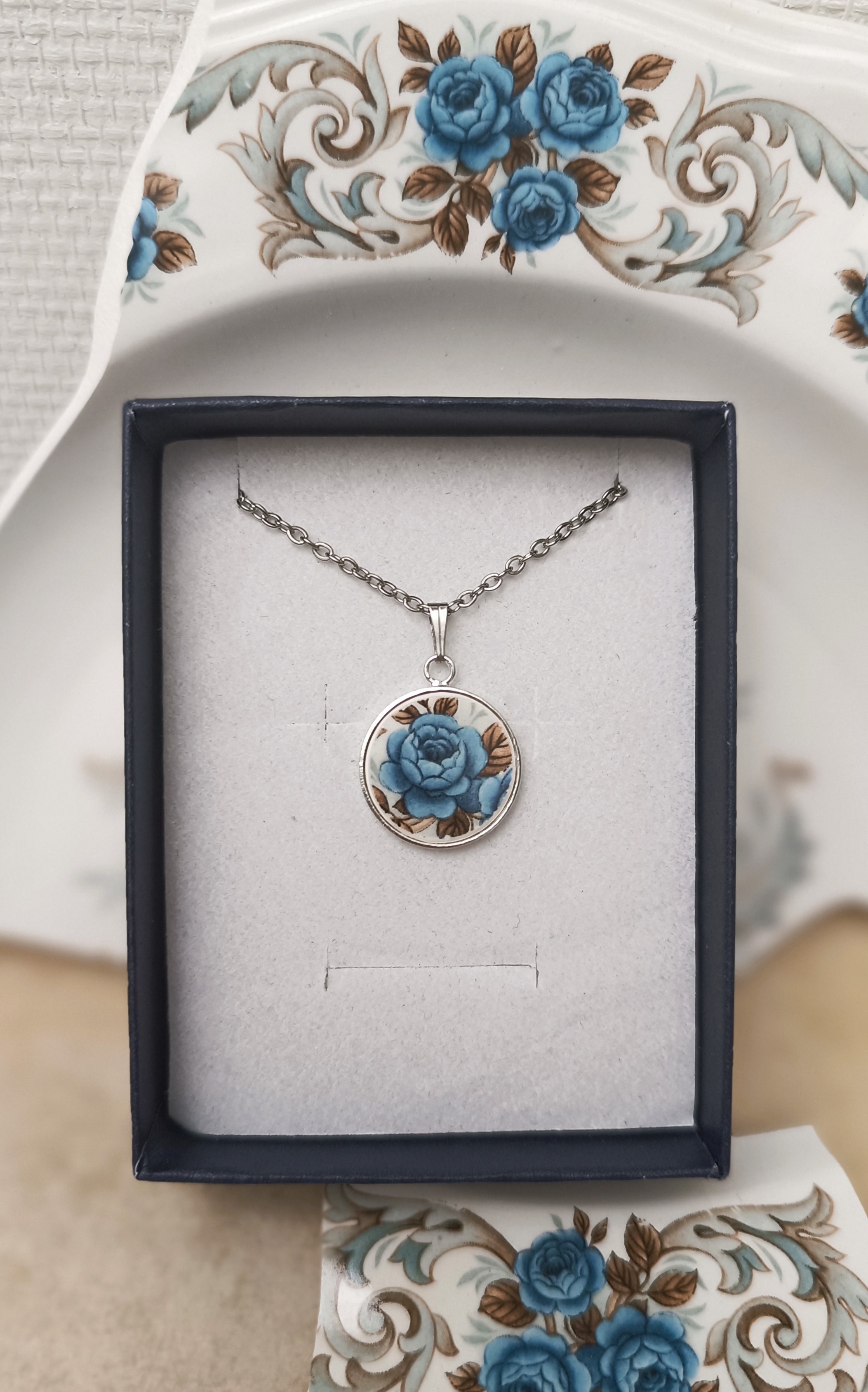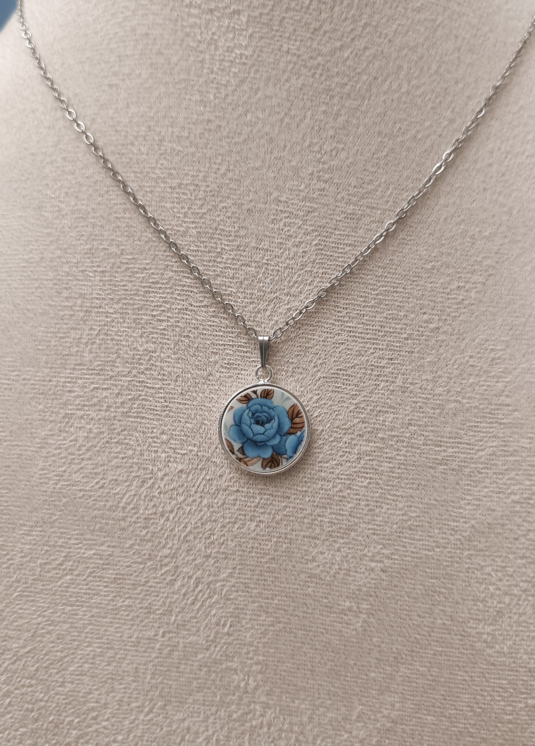Collier rond plaqué or 24 carats – Roses bleues en faïence ancienne