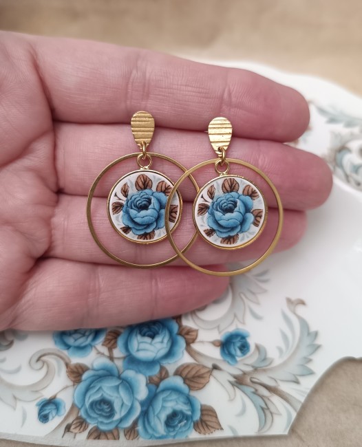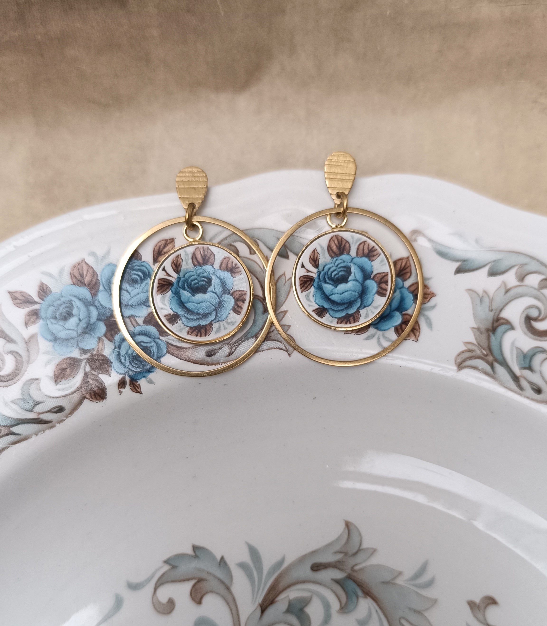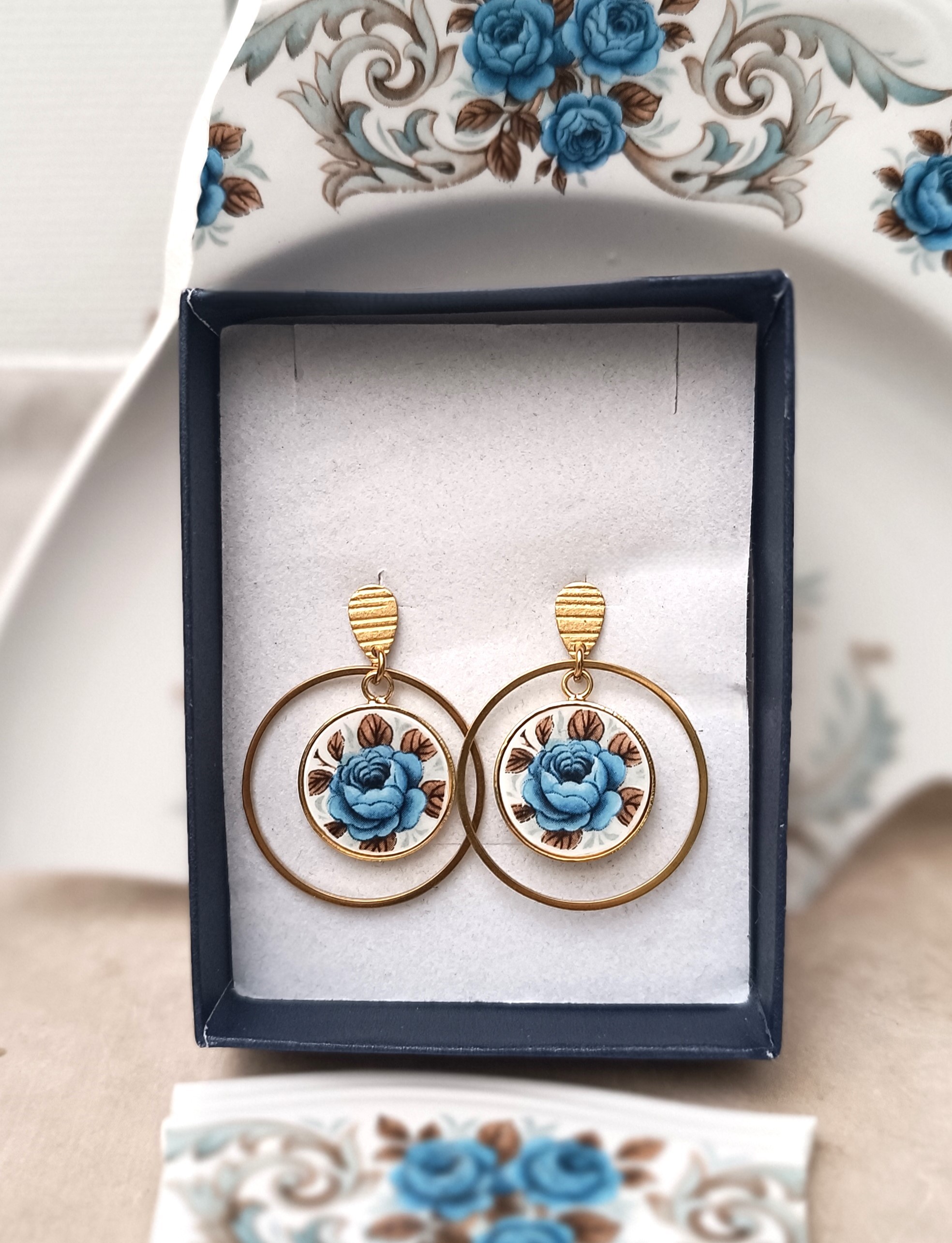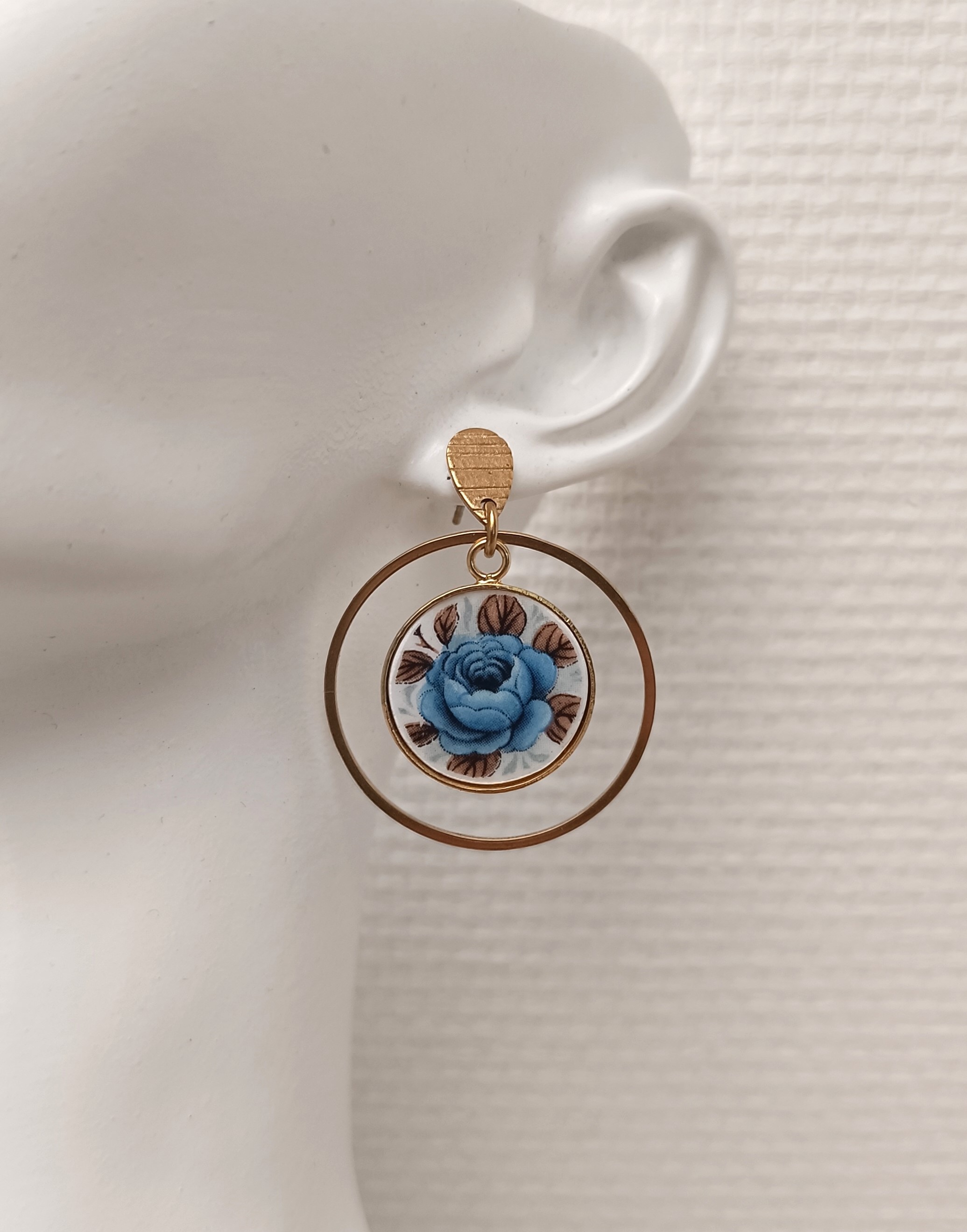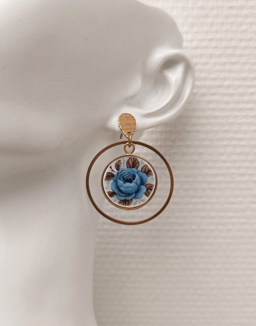 Ces boucles d’oreilles Idylle sont façonnées à partir d’une assiette ancienne en faïence Moulin des Loups, célèbre pour ses délicates roses bleues. Chaque fragment est soigneusement transformé dans mon atelier à Calais, révélant le motif original tout en respectant l’authenticité de la matière.