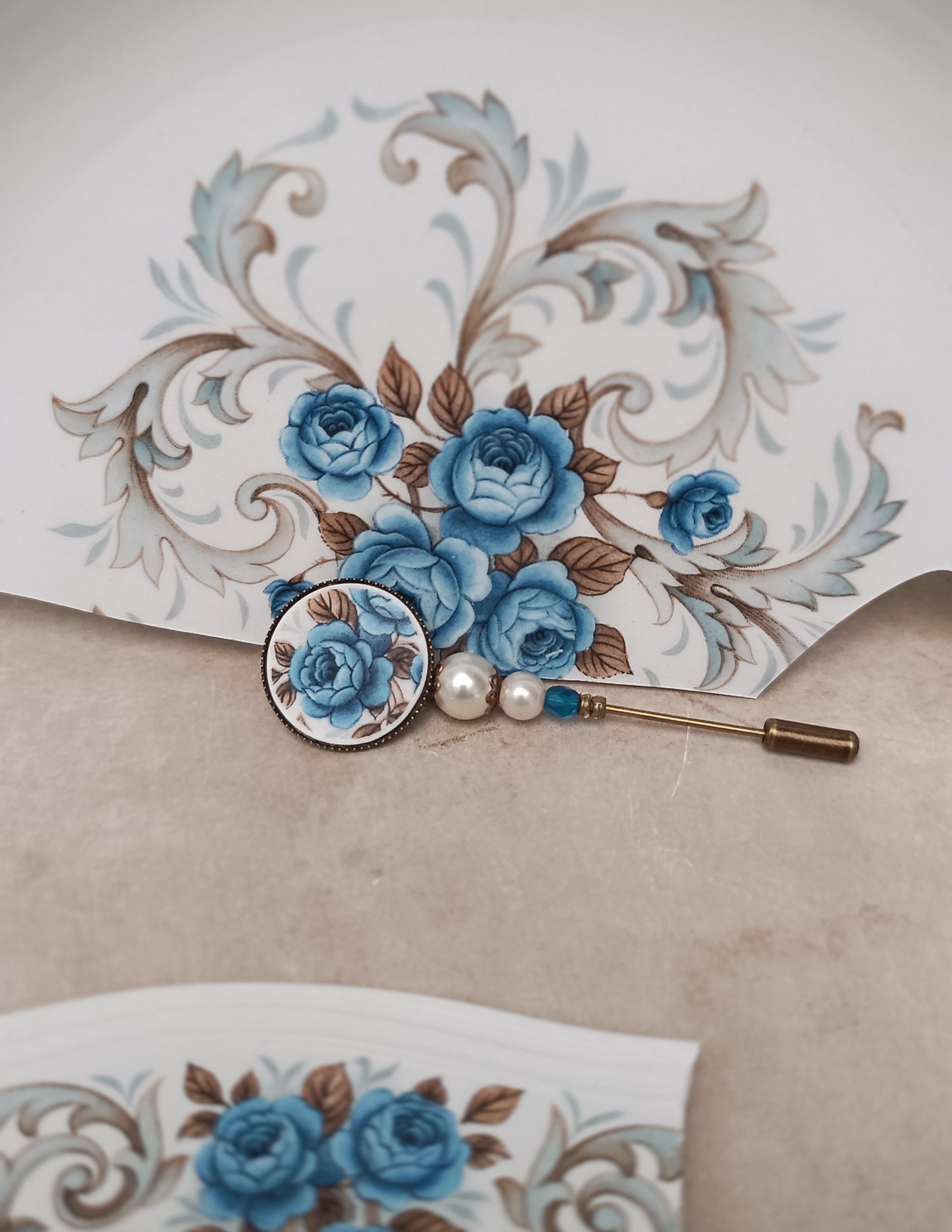 Cette fibule Idylle est née de la transformation d’une assiette ancienne en faïence Moulin des Loups, célèbre pour ses délicates roses bleues au charme intemporel.